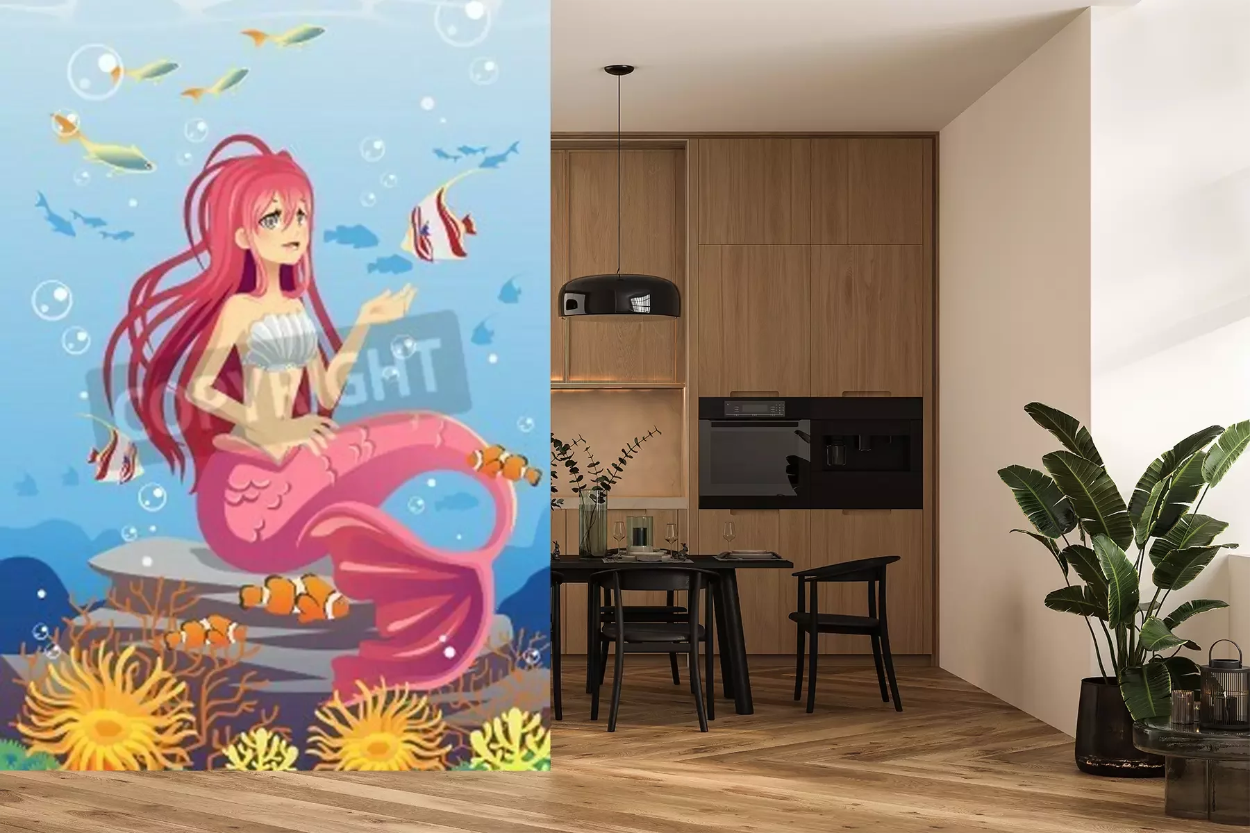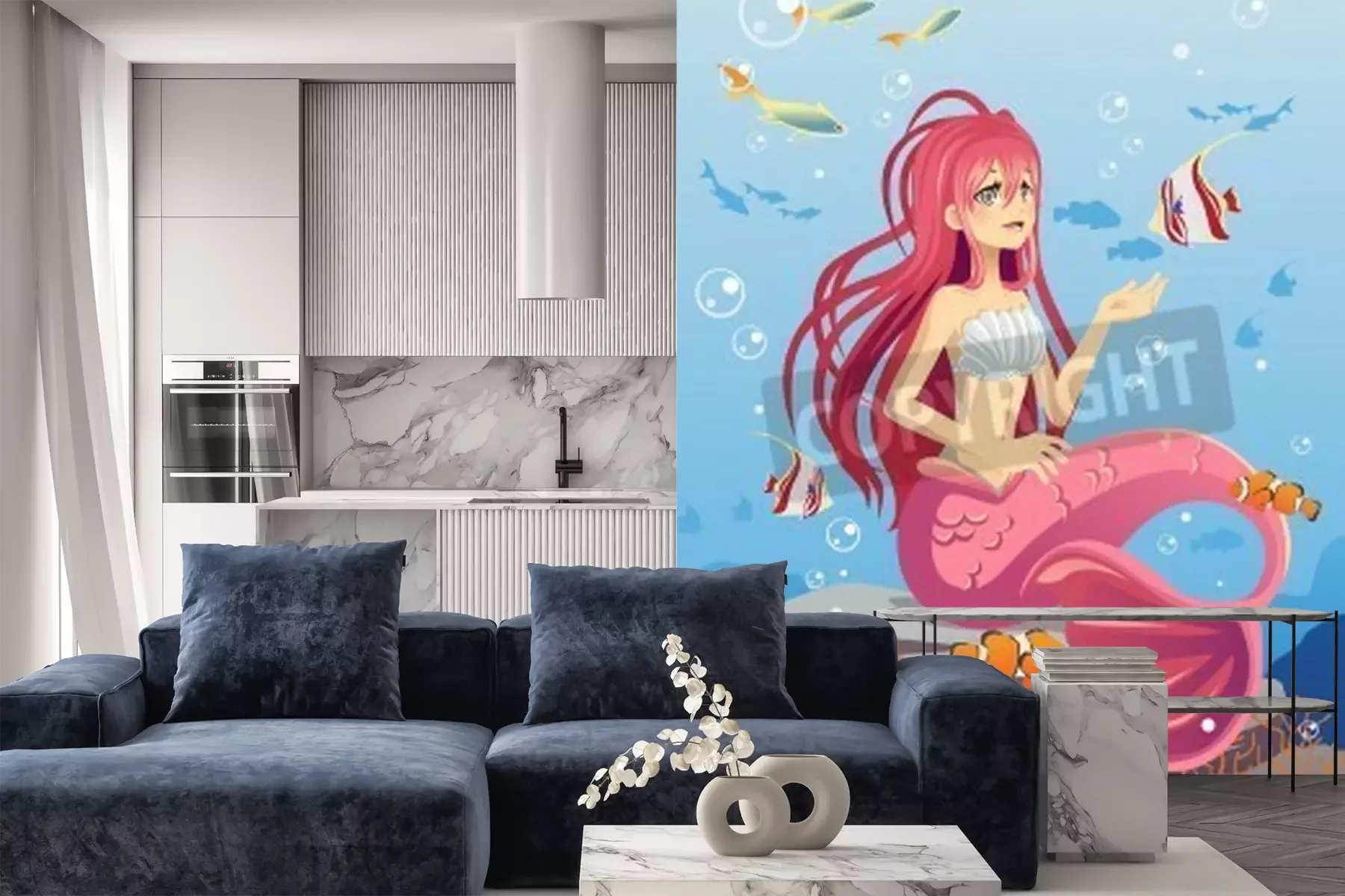 Fotobehang Een zeemeermin die op de bodem van de zee zit