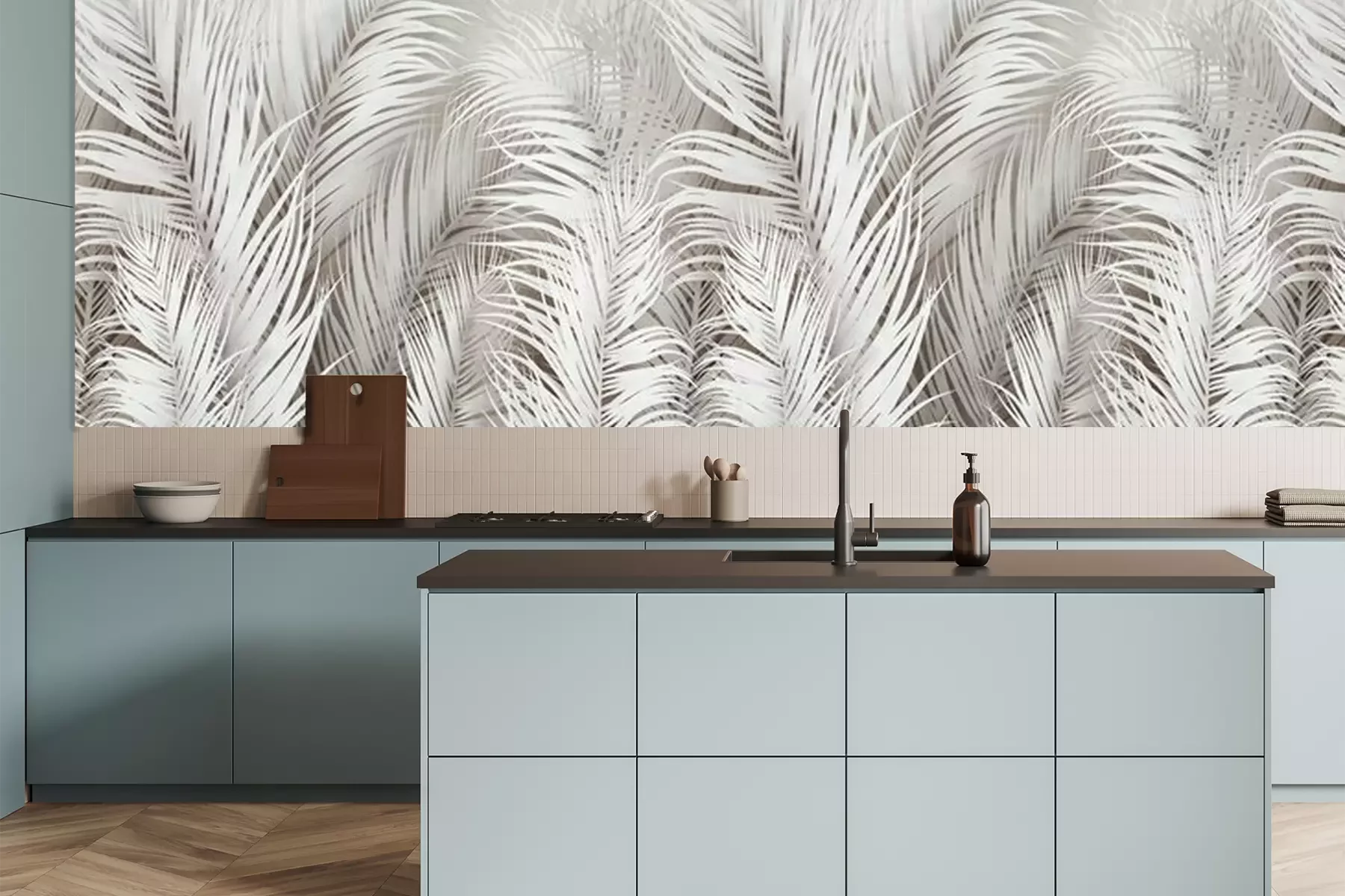 Het materiaal Premium is een glad vinyl op vlies, dat bestand is tegen uitrekken en vervorming. Het is dampdoorlatend – de muren kunnen vrij ademen – waardoor het geschikt is voor gebruik in de keuken en badkamer. Bij vervuiling kan het materiaal worden afgenomen met een vochtige doek. De maximale breedte van één baan bedraagt 95 of 105 cm, afhankelijk van de beschikbaarheid. Montage vindt plaats met de rand-aan-rand methode, wat een esthetisch resultaat zonder zichtbare naden oplevert. Omdat de lijm rechtstreeks op de muur wordt aangebracht, verloopt de installatie van het fotobehang snel en eenvoudig.