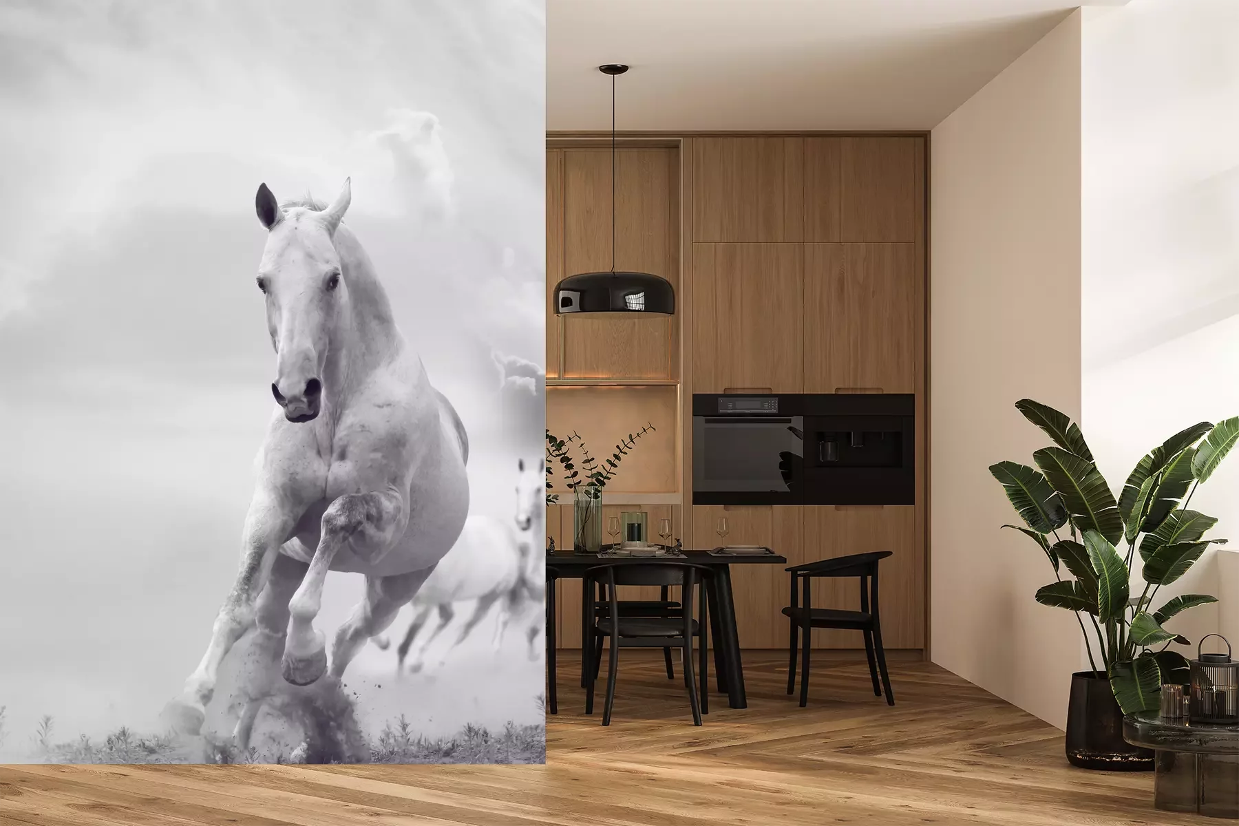 Het materiaal Premium+ is een gestructureerd vinyl op vlies met een gewicht van 255 g/m², dat kleine oneffenheden in de muur effectief camoufleert. De subtiele structuur van fijn zand geeft het oppervlak een exclusieve uitstraling, terwijl de halfmatte afwerking de diepte van de kleuren benadrukt. Het materiaal is dampdoorlatend, waardoor het ook in de keuken en badkamer kan worden gebruikt. De maximale breedte van één baan bedraagt 100 cm – bij grotere afmetingen wordt het fotobehang in meerdere gelijke banen verdeeld. De lijm wordt direct op de muur aangebracht en het behang wordt rand-aan-rand geplakt, wat zorgt voor een esthetisch resultaat zonder zichtbare naden. Het oppervlak kan gemakkelijk worden schoongemaakt door het voorzichtig af te nemen met een vochtige doek.