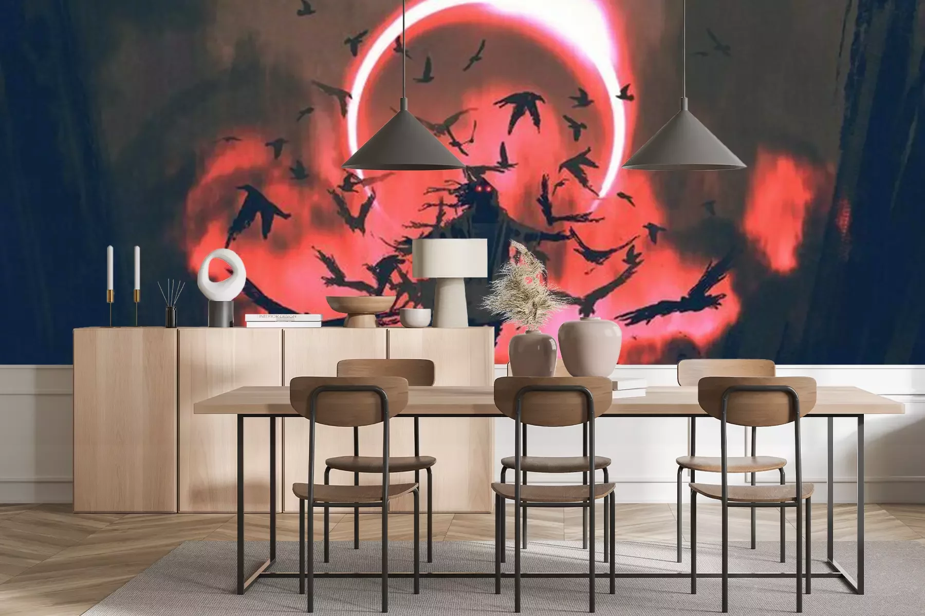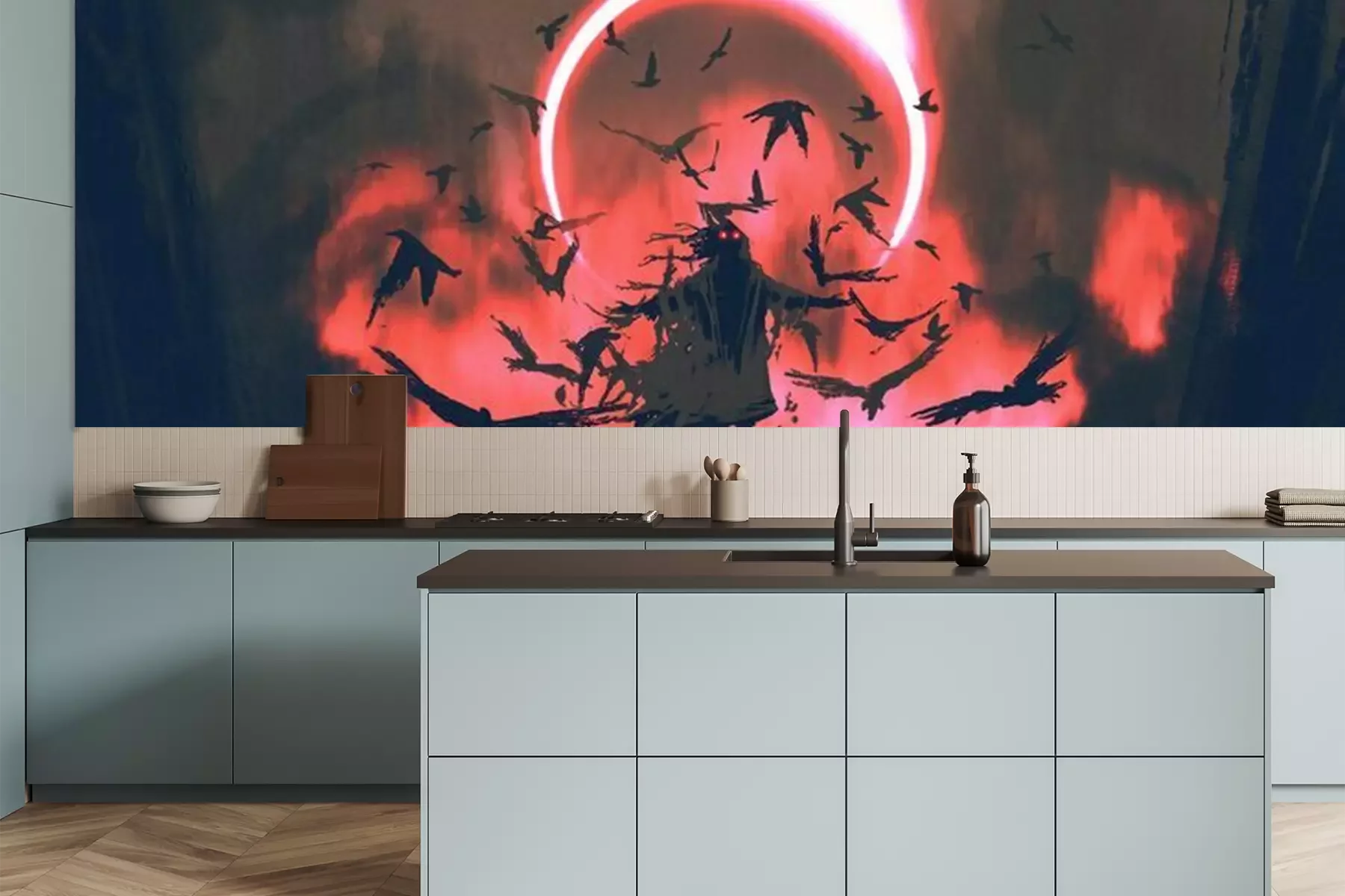 Fotobehang Enge figuur en kraaien in een fantasiewereld