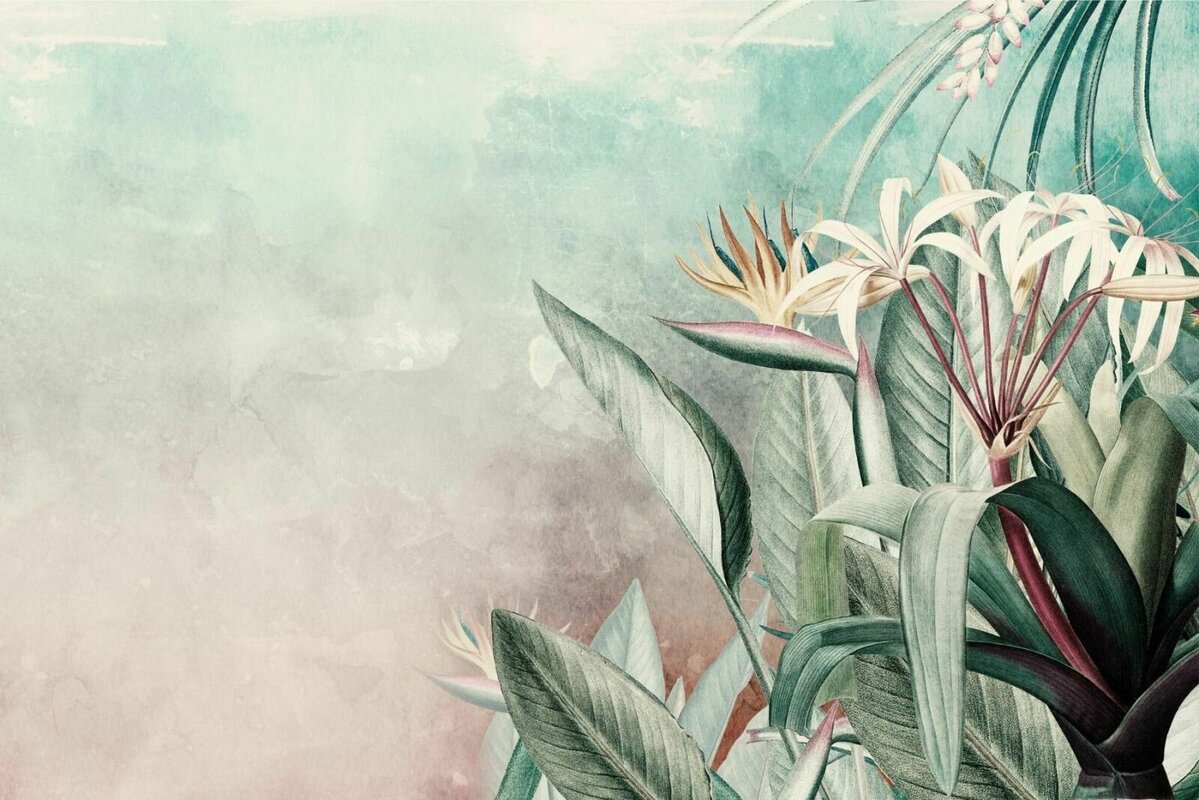 Fotobehang: Exotische bladeren en bloemen op een aquarelachtergrond