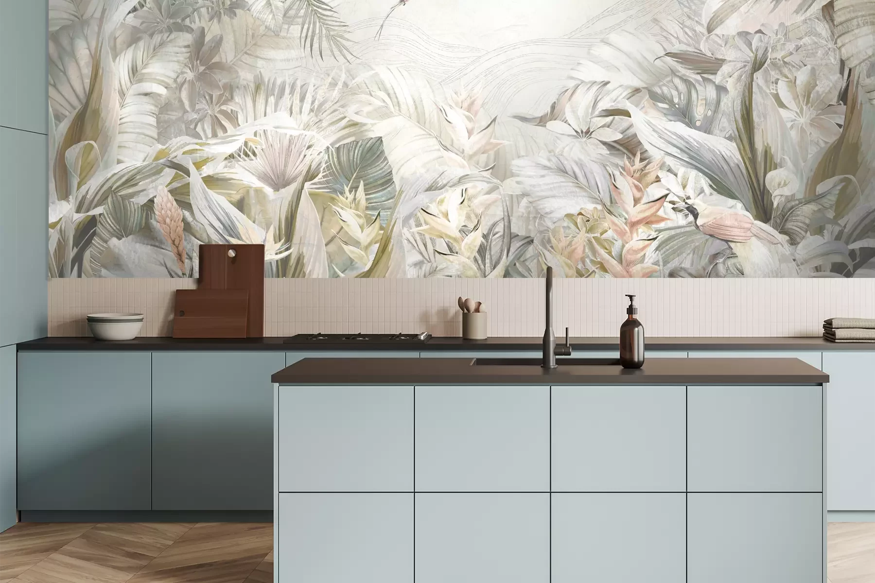 Het materiaal Premium is een glad vinyl op vlies, dat bestand is tegen uitrekken en vervorming. Het is dampdoorlatend – de muren kunnen vrij ademen – waardoor het geschikt is voor gebruik in de keuken en badkamer. Bij vervuiling kan het materiaal worden afgenomen met een vochtige doek. De maximale breedte van één baan bedraagt 95 of 105 cm, afhankelijk van de beschikbaarheid. Montage vindt plaats met de rand-aan-rand methode, wat een esthetisch resultaat zonder zichtbare naden oplevert. Omdat de lijm rechtstreeks op de muur wordt aangebracht, verloopt de installatie van het fotobehang snel en eenvoudig.