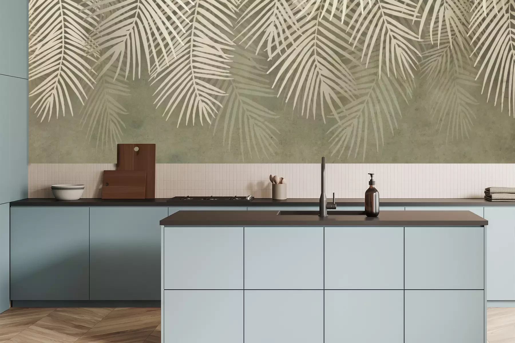 Het materiaal Premium is een glad vinyl op vlies, dat bestand is tegen uitrekken en vervorming. Het is dampdoorlatend – de muren kunnen vrij ademen – waardoor het geschikt is voor gebruik in de keuken en badkamer. Bij vervuiling kan het materiaal worden afgenomen met een vochtige doek. De maximale breedte van één baan bedraagt 95 of 105 cm, afhankelijk van de beschikbaarheid. Montage vindt plaats met de rand-aan-rand methode, wat een esthetisch resultaat zonder zichtbare naden oplevert. Omdat de lijm rechtstreeks op de muur wordt aangebracht, verloopt de installatie van het fotobehang snel en eenvoudig.