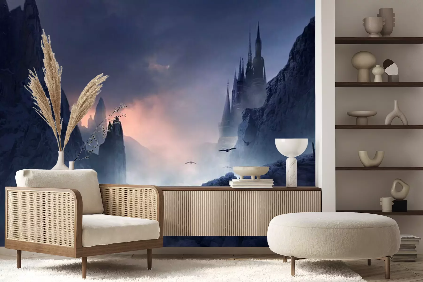 Het materiaal Premium+ is een gestructureerd vinyl op vlies met een gewicht van 255 g/m², dat kleine oneffenheden in de muur effectief camoufleert. De subtiele structuur van fijn zand geeft het oppervlak een exclusieve uitstraling, terwijl de halfmatte afwerking de diepte van de kleuren benadrukt. Het materiaal is dampdoorlatend, waardoor het ook in de keuken en badkamer kan worden gebruikt. De maximale breedte van één baan bedraagt 100 cm – bij grotere afmetingen wordt het fotobehang in meerdere gelijke banen verdeeld. De lijm wordt direct op de muur aangebracht en het behang wordt rand-aan-rand geplakt, wat zorgt voor een esthetisch resultaat zonder zichtbare naden. Het oppervlak kan gemakkelijk worden schoongemaakt door het voorzichtig af te nemen met een vochtige doek.
