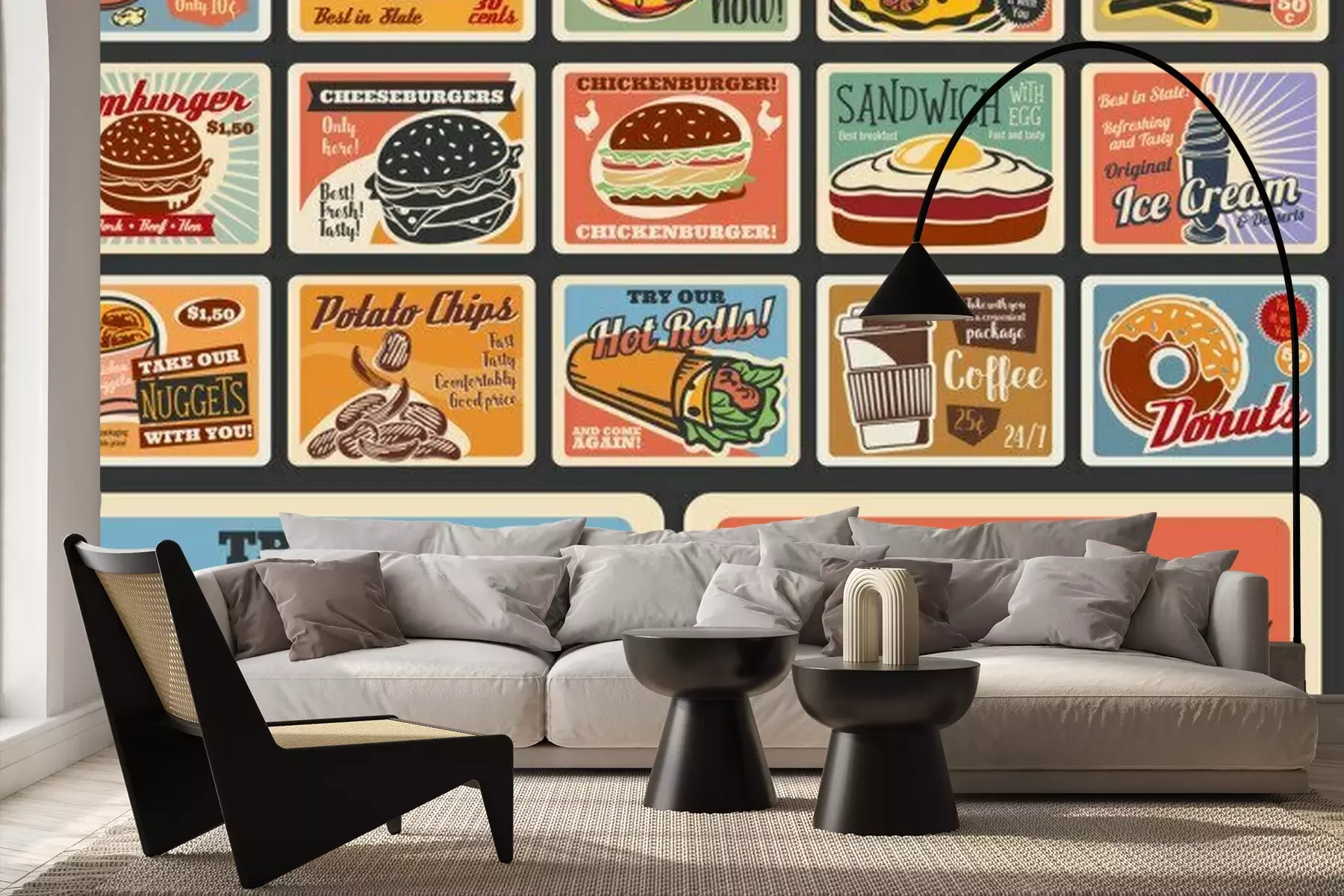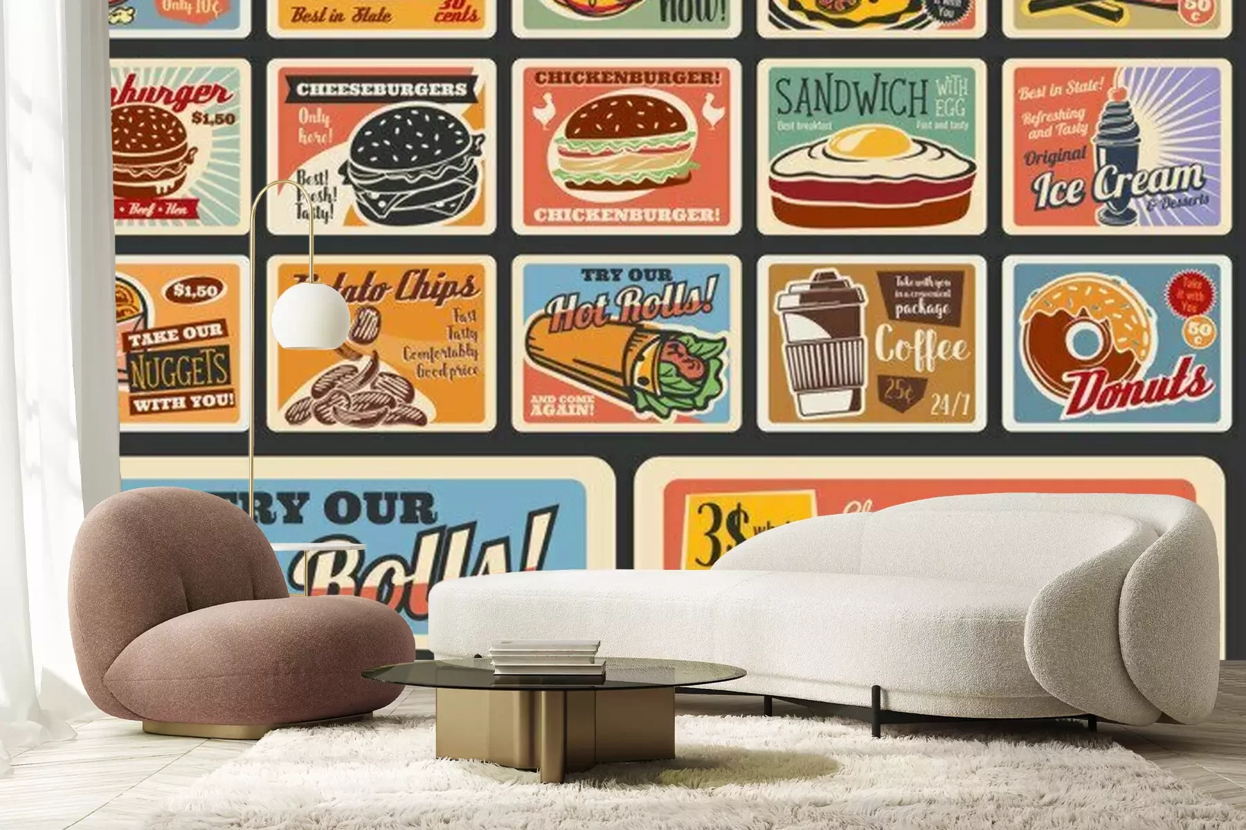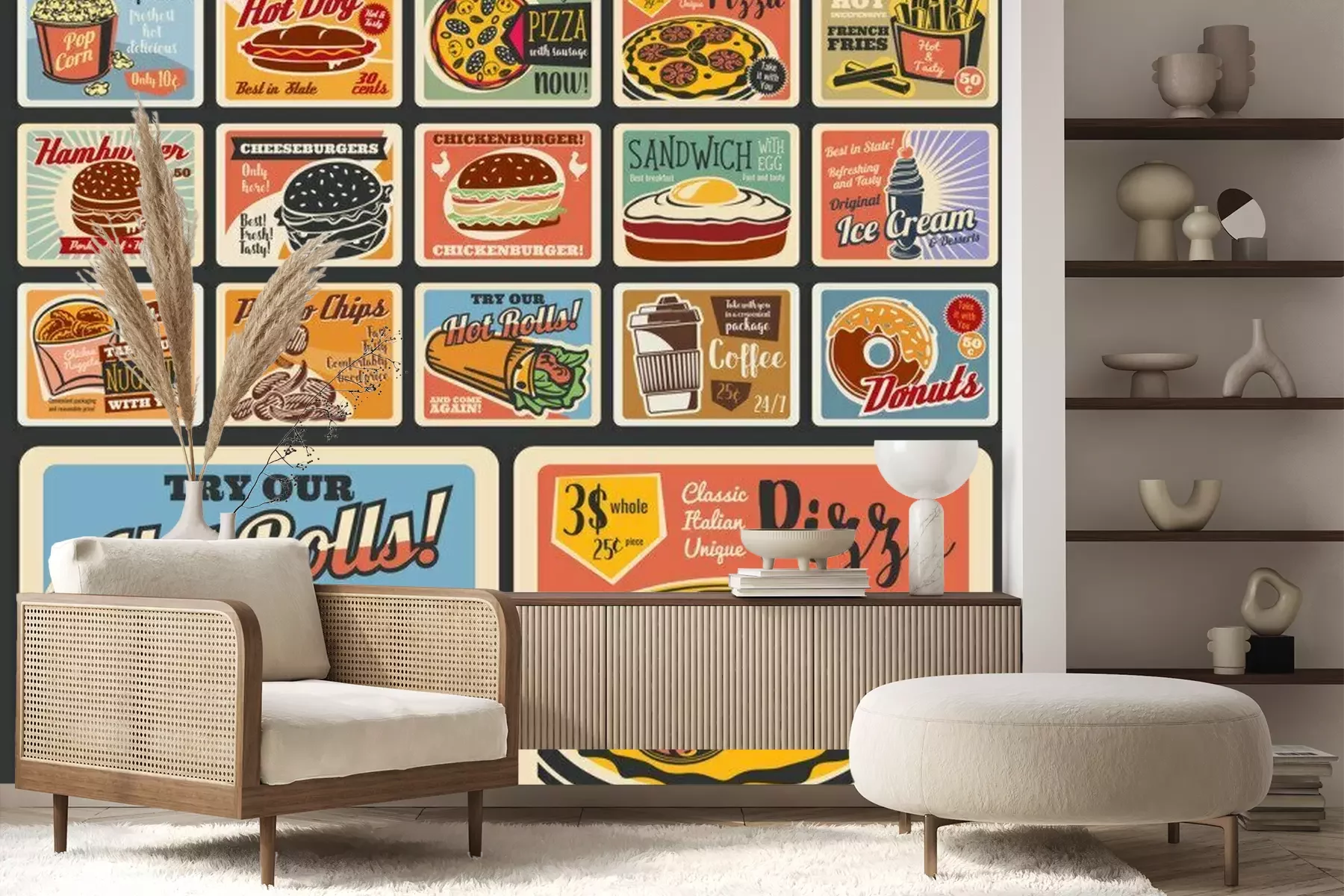 Fotobehang Fast food restaurant vector burgers, desserts and drinks. Retro posters of pizza, hamburger and hot dog, fries, donut and coffee, chicken nuggets, sandwich and cheeseburger, ice cream, popcorn, chips
