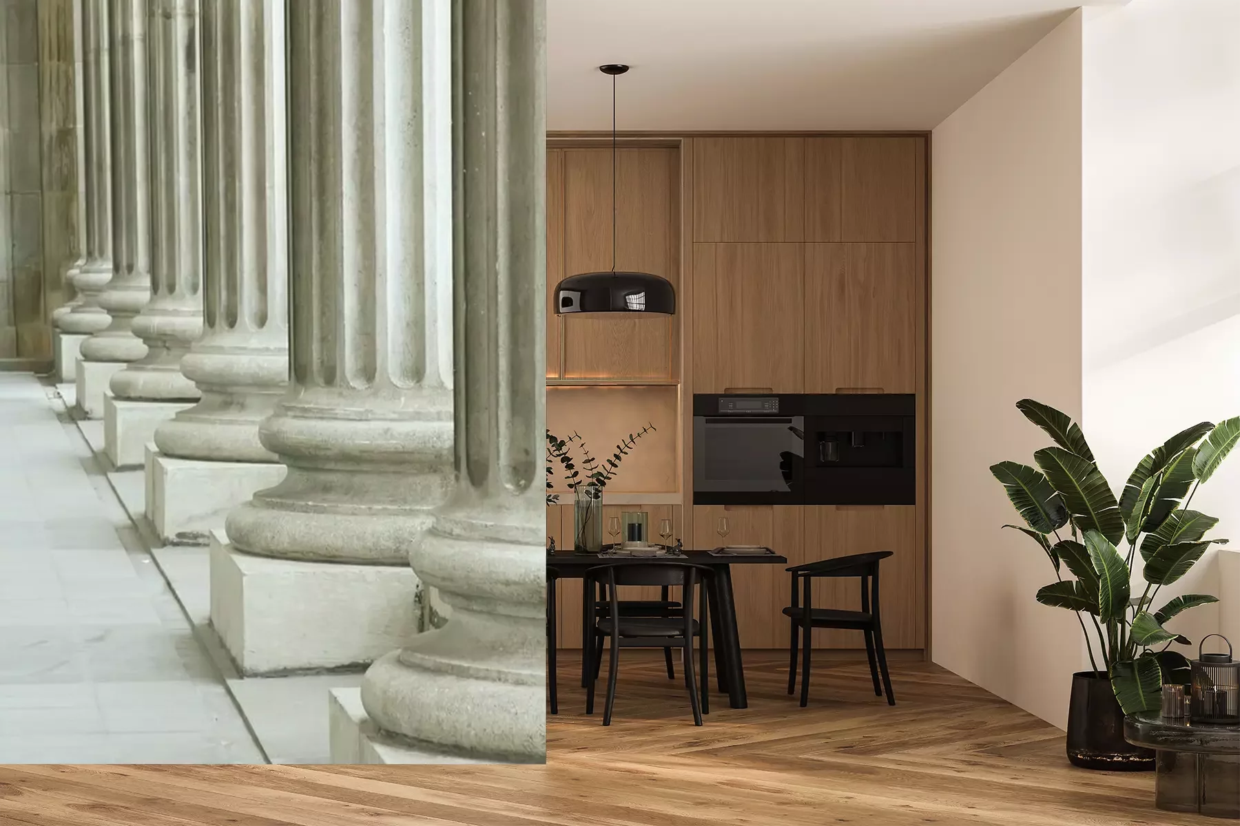 Het materiaal Premium is een glad vinyl op vlies, dat bestand is tegen uitrekken en vervorming. Het is dampdoorlatend – de muren kunnen vrij ademen – waardoor het geschikt is voor gebruik in de keuken en badkamer. Bij vervuiling kan het materiaal worden afgenomen met een vochtige doek. De maximale breedte van één baan bedraagt 95 of 105 cm, afhankelijk van de beschikbaarheid. Montage vindt plaats met de rand-aan-rand methode, wat een esthetisch resultaat zonder zichtbare naden oplevert. Omdat de lijm rechtstreeks op de muur wordt aangebracht, verloopt de installatie van het fotobehang snel en eenvoudig.