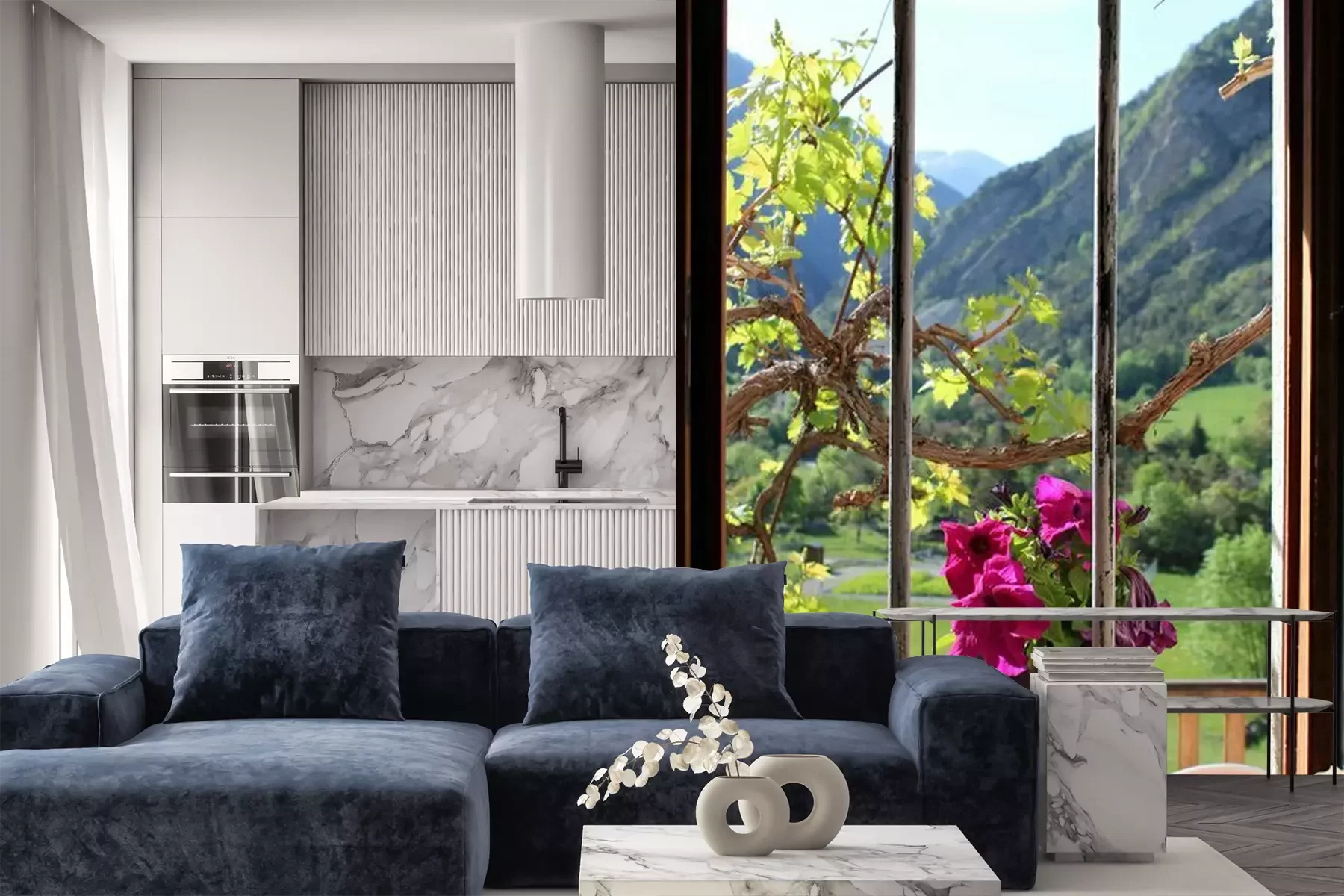Het materiaal Premium is een glad vinyl op vlies, dat bestand is tegen uitrekken en vervorming. Het is dampdoorlatend – de muren kunnen vrij ademen – waardoor het geschikt is voor gebruik in de keuken en badkamer. Bij vervuiling kan het materiaal worden afgenomen met een vochtige doek. De maximale breedte van één baan bedraagt 95 of 105 cm, afhankelijk van de beschikbaarheid. Montage vindt plaats met de rand-aan-rand methode, wat een esthetisch resultaat zonder zichtbare naden oplevert. Omdat de lijm rechtstreeks op de muur wordt aangebracht, verloopt de installatie van het fotobehang snel en eenvoudig.