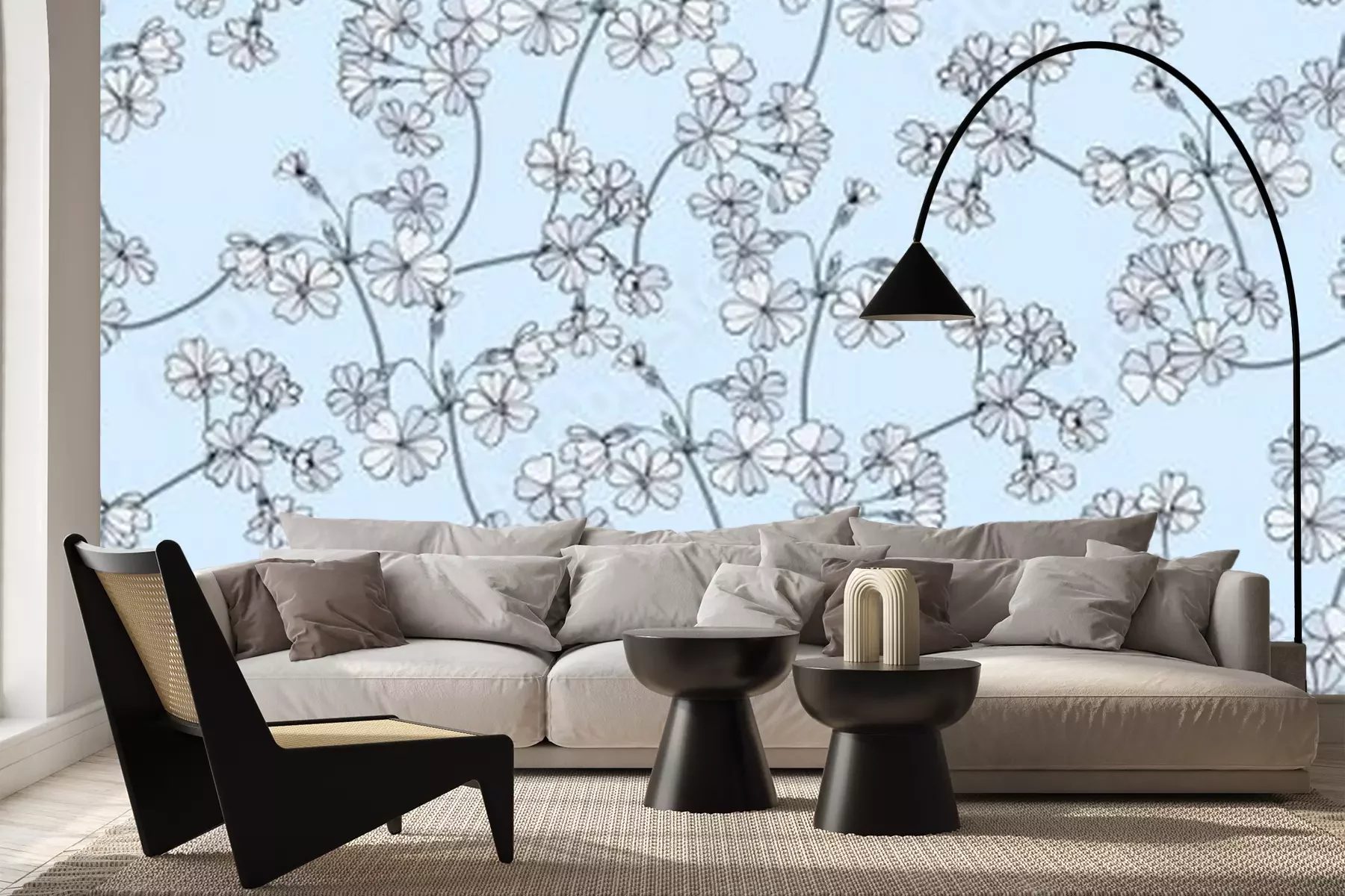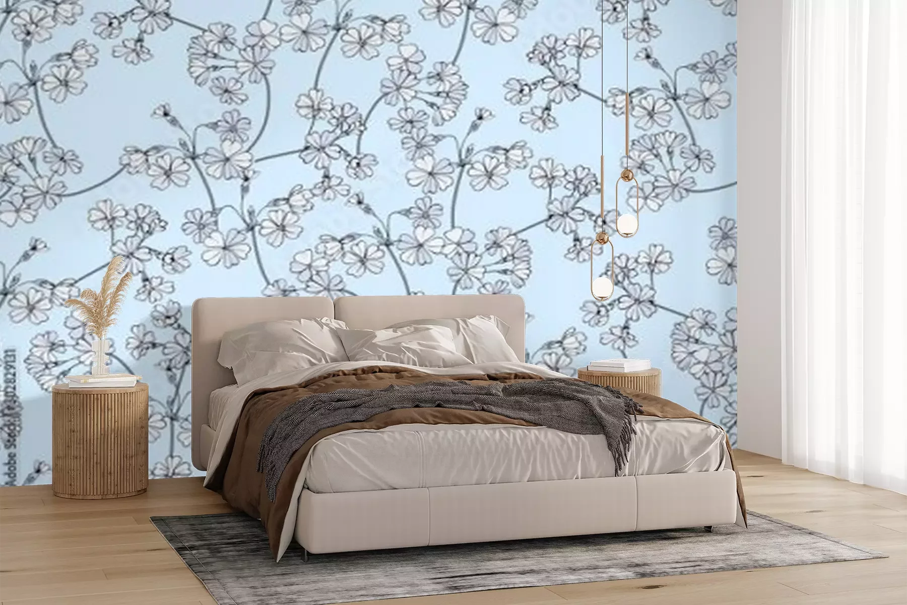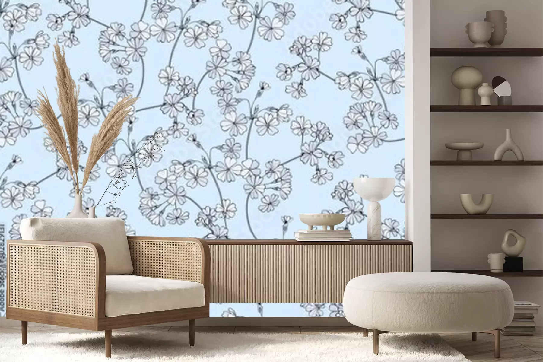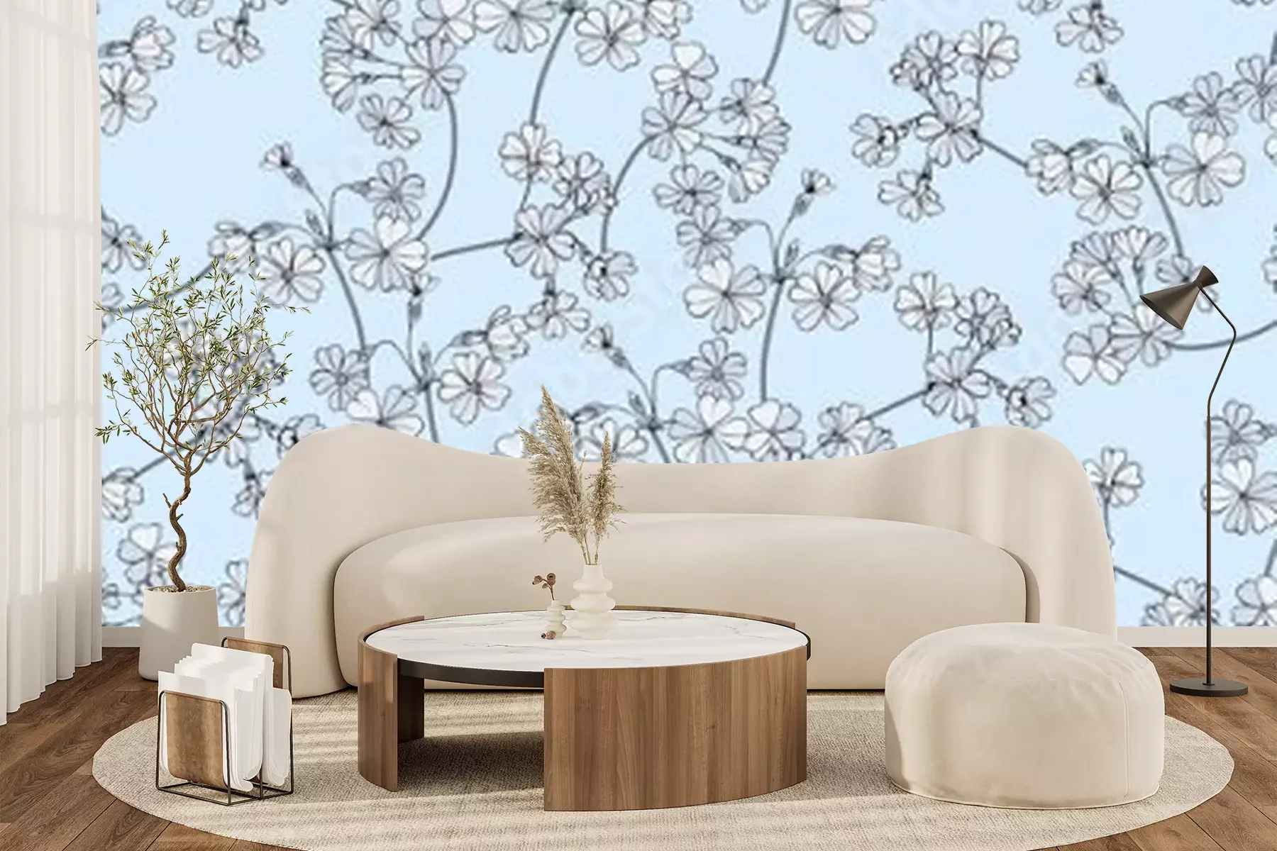 Fotobehang Fijne bloemen op een blauwe achtergrond