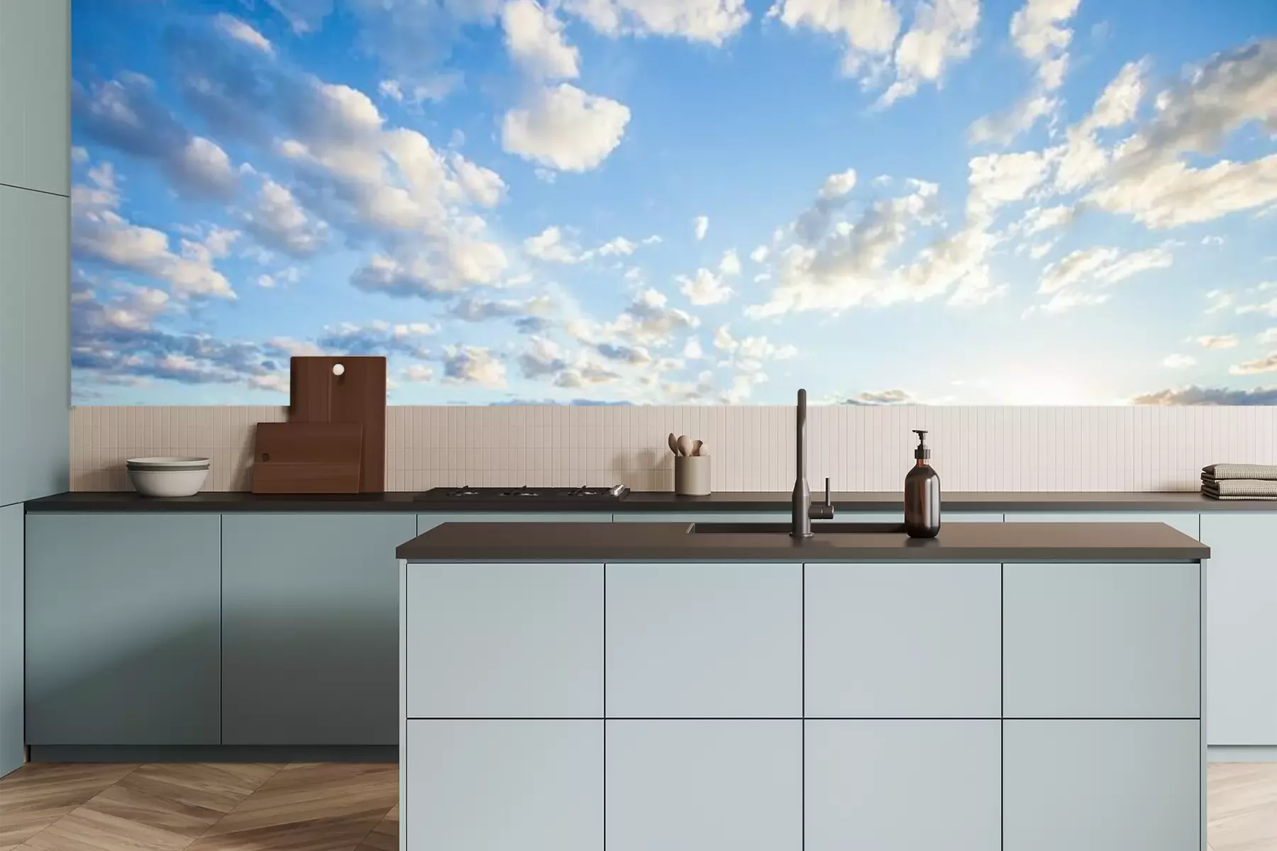 Het materiaal Premium is een glad vinyl op vlies, dat bestand is tegen uitrekken en vervorming. Het is dampdoorlatend – de muren kunnen vrij ademen – waardoor het geschikt is voor gebruik in de keuken en badkamer. Bij vervuiling kan het materiaal worden afgenomen met een vochtige doek. De maximale breedte van één baan bedraagt 95 of 105 cm, afhankelijk van de beschikbaarheid. Montage vindt plaats met de rand-aan-rand methode, wat een esthetisch resultaat zonder zichtbare naden oplevert. Omdat de lijm rechtstreeks op de muur wordt aangebracht, verloopt de installatie van het fotobehang snel en eenvoudig.