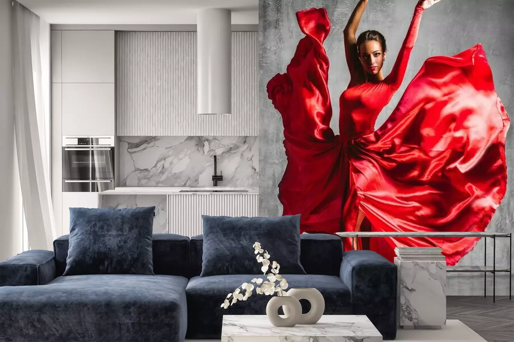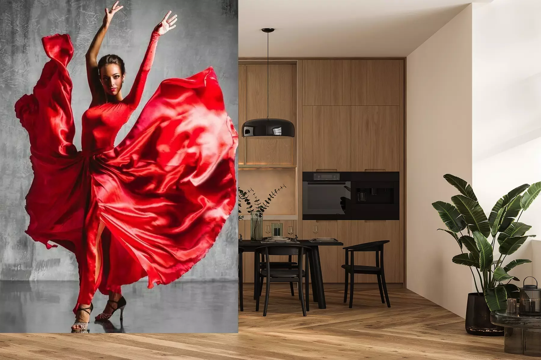 Het materiaal Premium+ is een gestructureerd vinyl op vlies met een gewicht van 255 g/m², dat kleine oneffenheden in de muur effectief camoufleert. De subtiele structuur van fijn zand geeft het oppervlak een exclusieve uitstraling, terwijl de halfmatte afwerking de diepte van de kleuren benadrukt. Het materiaal is dampdoorlatend, waardoor het ook in de keuken en badkamer kan worden gebruikt. De maximale breedte van één baan bedraagt 100 cm – bij grotere afmetingen wordt het fotobehang in meerdere gelijke banen verdeeld. De lijm wordt direct op de muur aangebracht en het behang wordt rand-aan-rand geplakt, wat zorgt voor een esthetisch resultaat zonder zichtbare naden. Het oppervlak kan gemakkelijk worden schoongemaakt door het voorzichtig af te nemen met een vochtige doek.