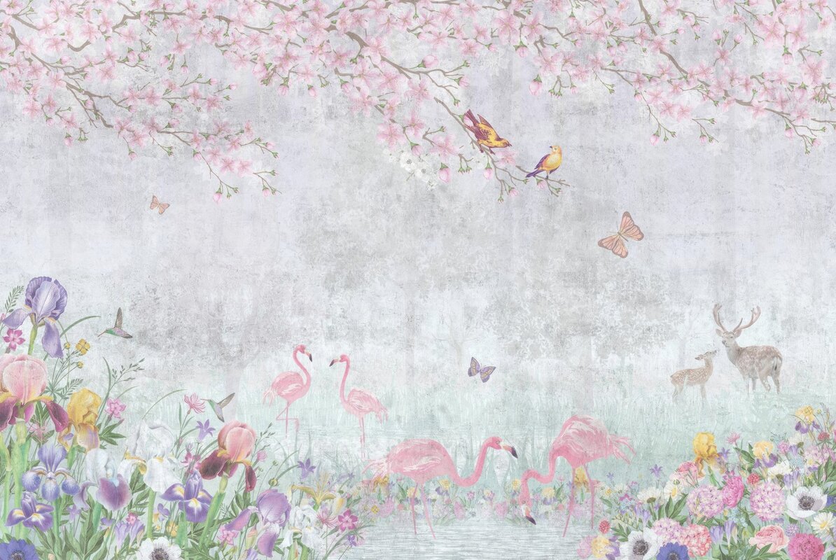 Fotobehang: Flamingo's en bosdieren tussen kleurrijke bloemen