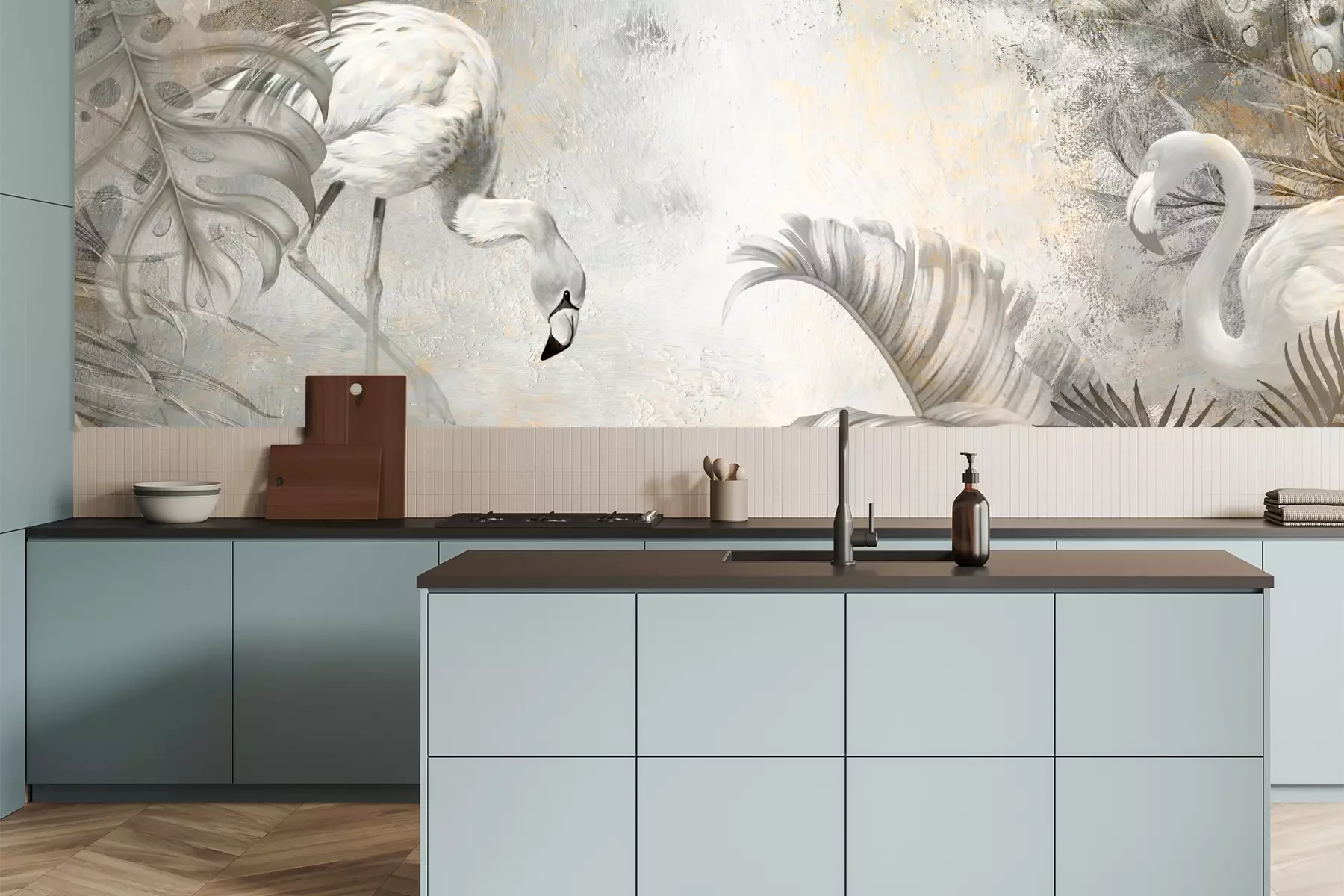 Het materiaal Premium+ is een gestructureerd vinyl op vlies met een gewicht van 255 g/m², dat kleine oneffenheden in de muur effectief camoufleert. De subtiele structuur van fijn zand geeft het oppervlak een exclusieve uitstraling, terwijl de halfmatte afwerking de diepte van de kleuren benadrukt. Het materiaal is dampdoorlatend, waardoor het ook in de keuken en badkamer kan worden gebruikt. De maximale breedte van één baan bedraagt 100 cm – bij grotere afmetingen wordt het fotobehang in meerdere gelijke banen verdeeld. De lijm wordt direct op de muur aangebracht en het behang wordt rand-aan-rand geplakt, wat zorgt voor een esthetisch resultaat zonder zichtbare naden. Het oppervlak kan gemakkelijk worden schoongemaakt door het voorzichtig af te nemen met een vochtige doek.