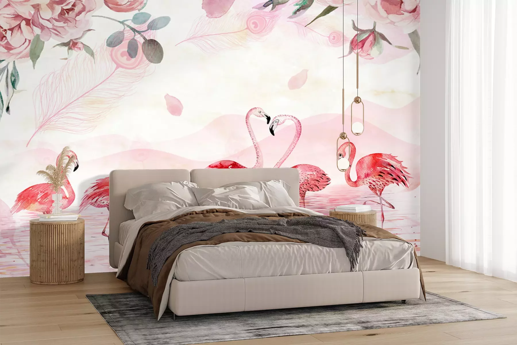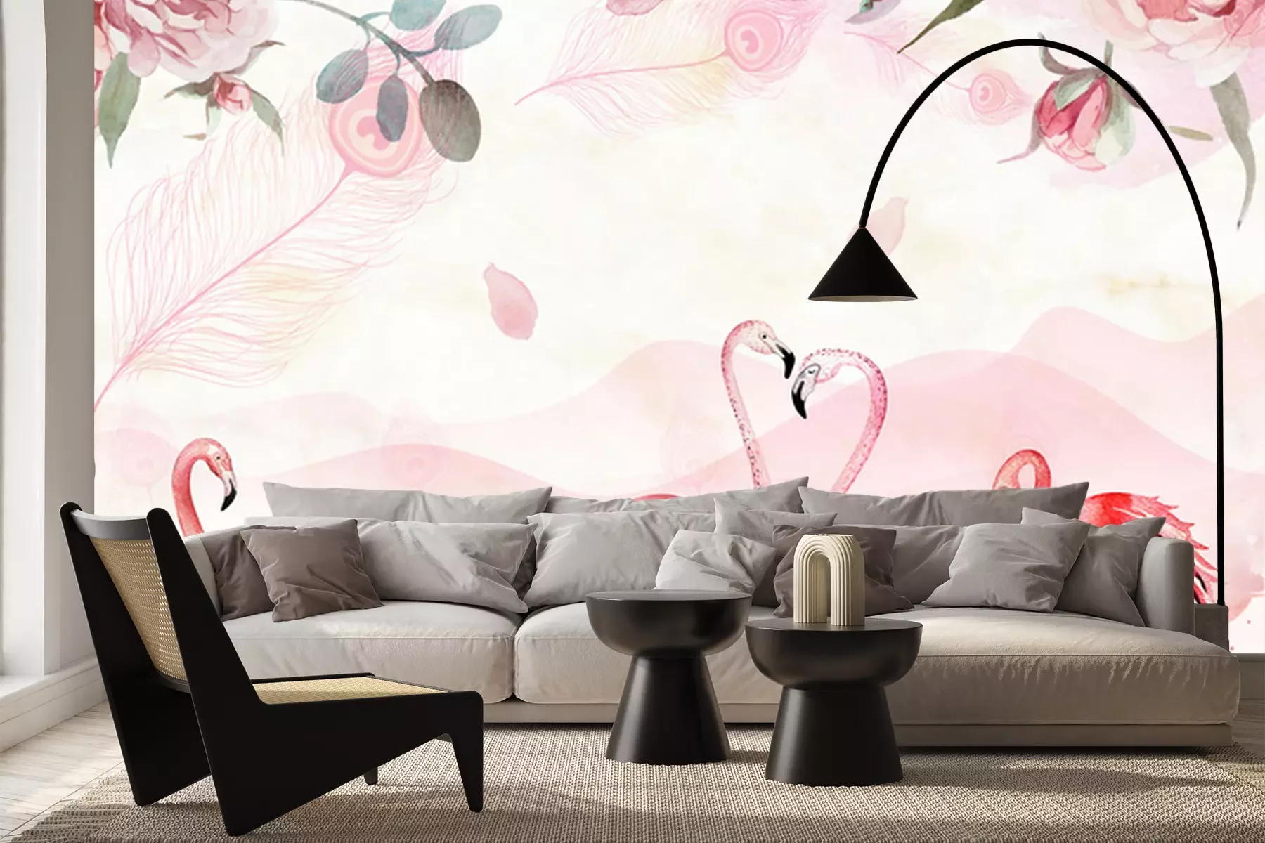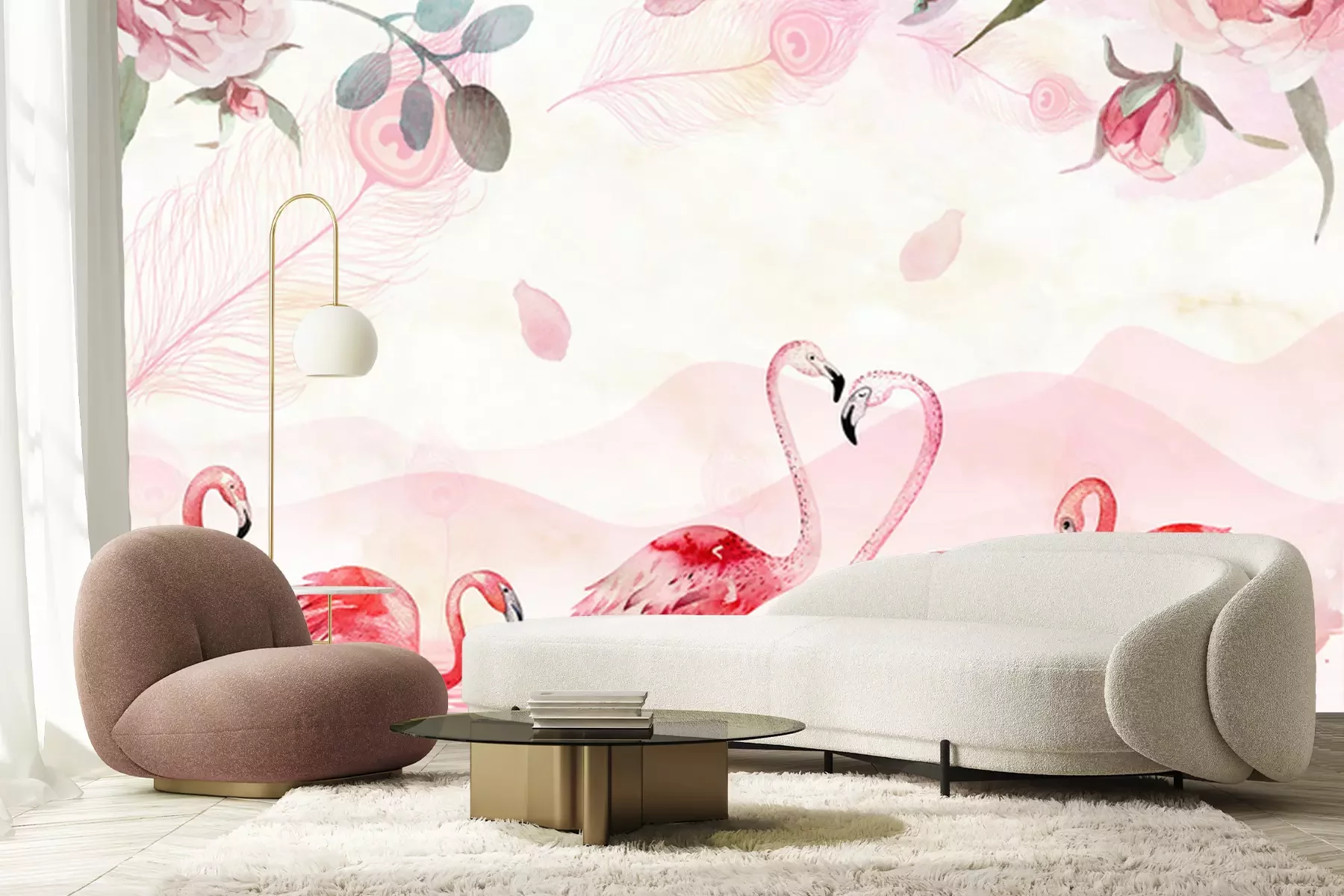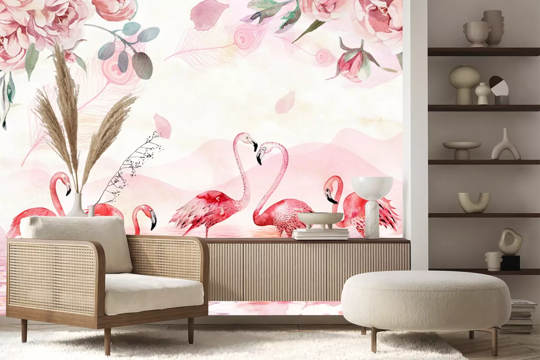 Fotobehang Flamingo's in een meer met berglandschap als achtergrond