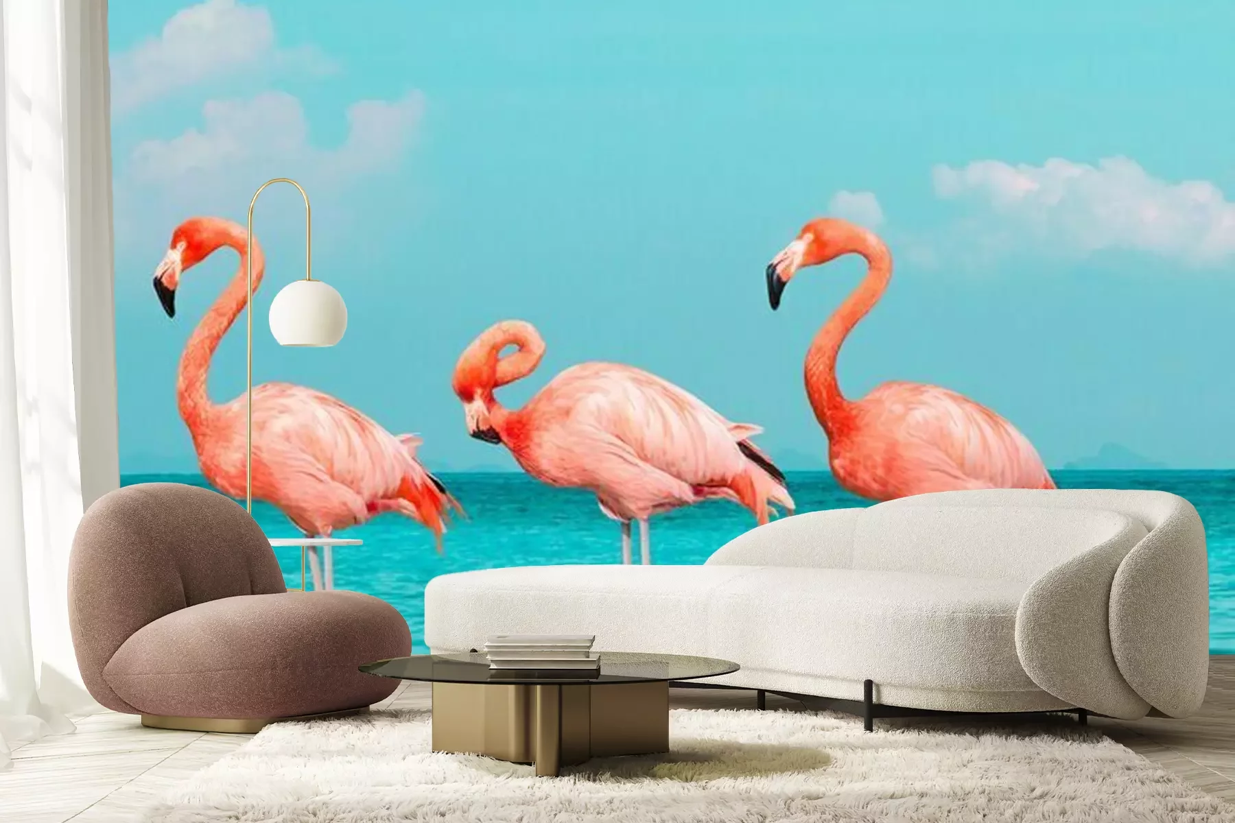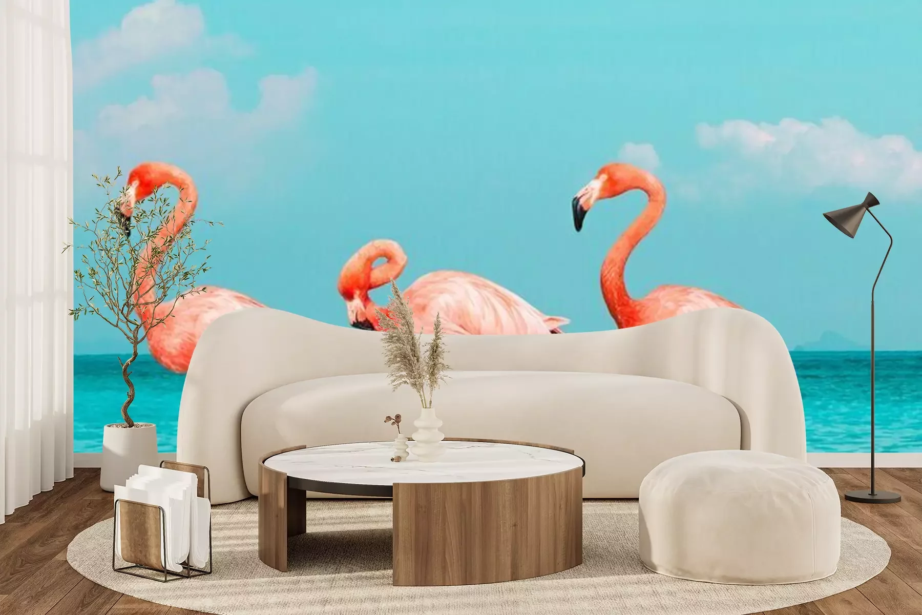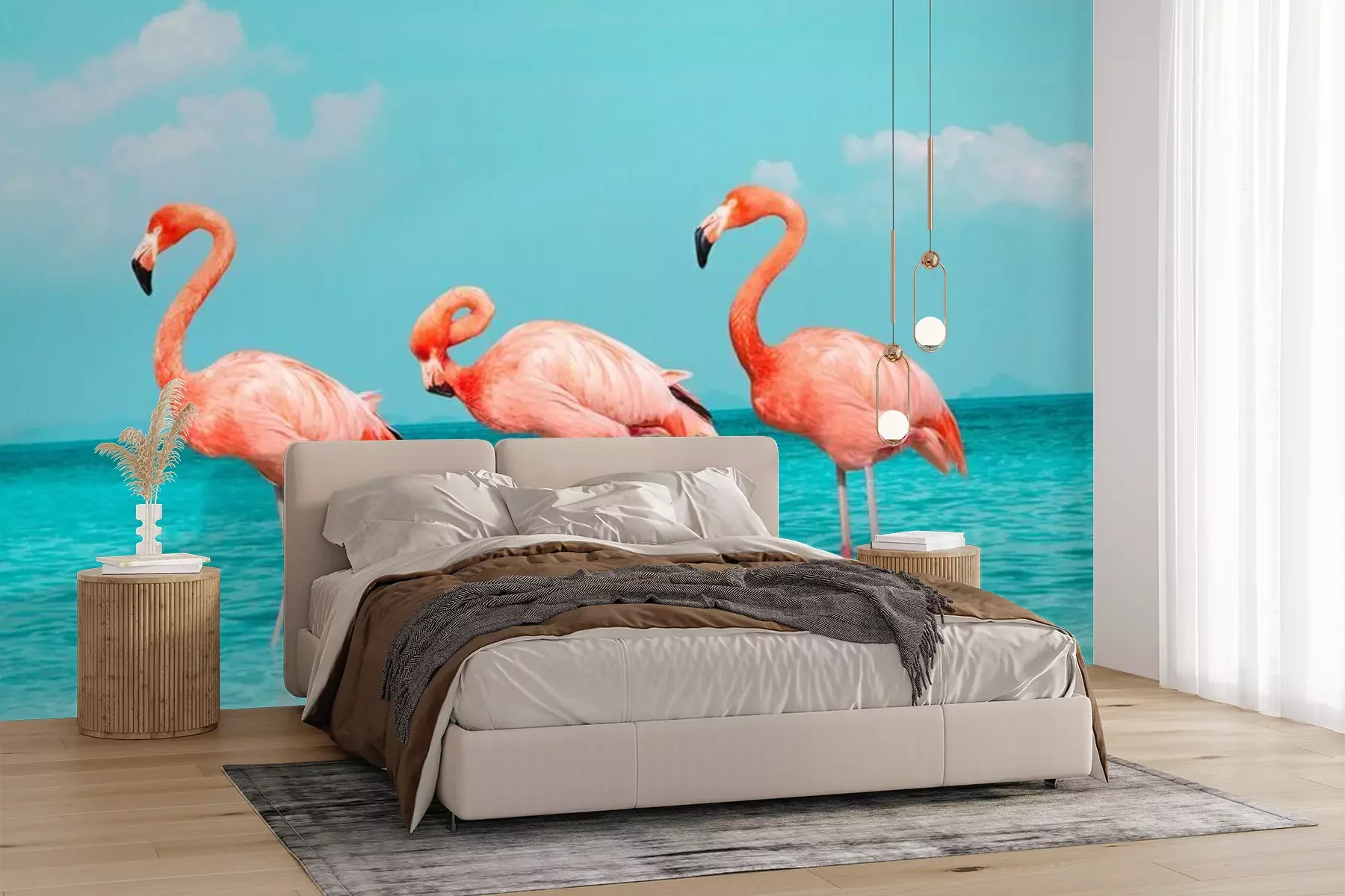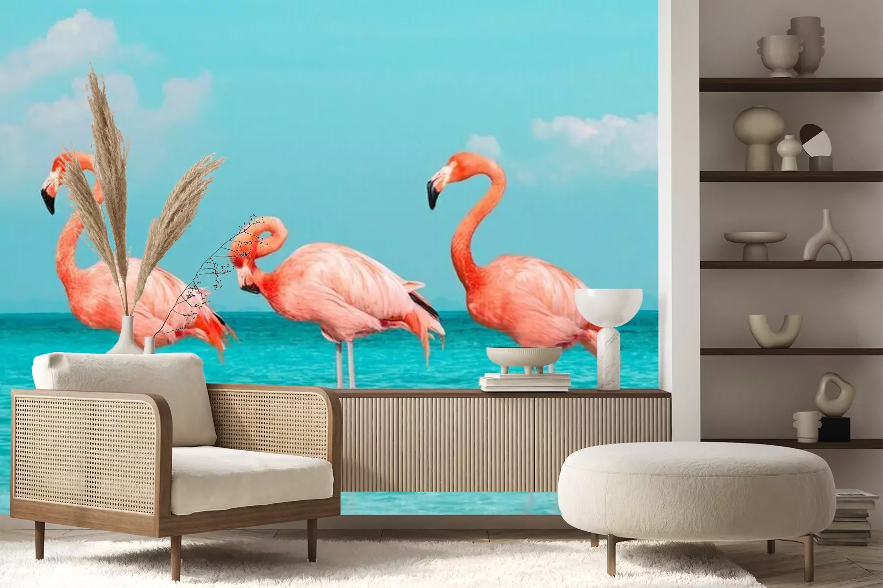 Fotobehang Flamingo's op een achtergrond van turkoois water