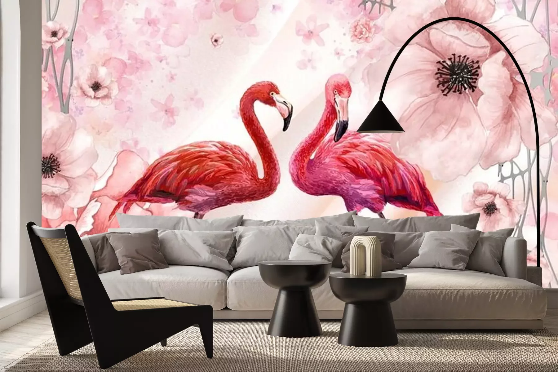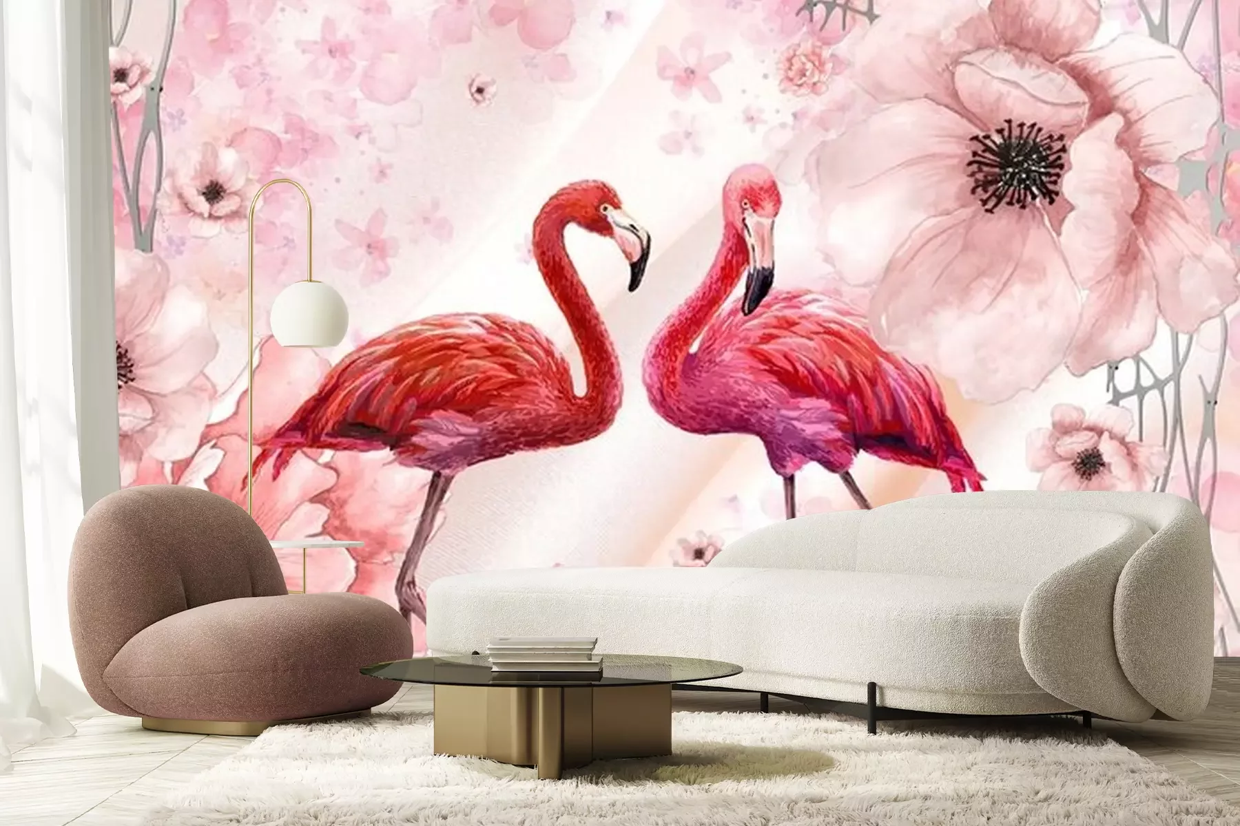 Fotobehang Flamingo's op een bloemenachtergrond
