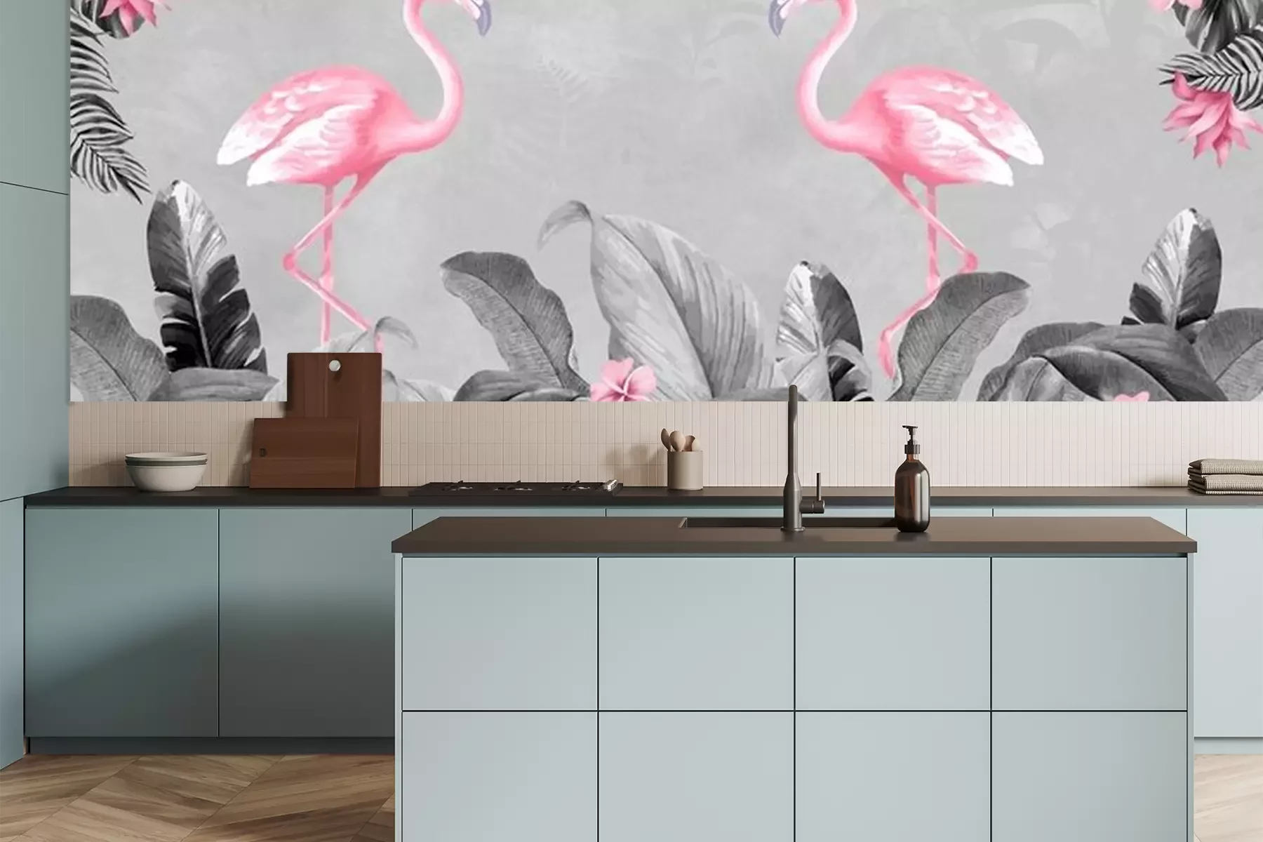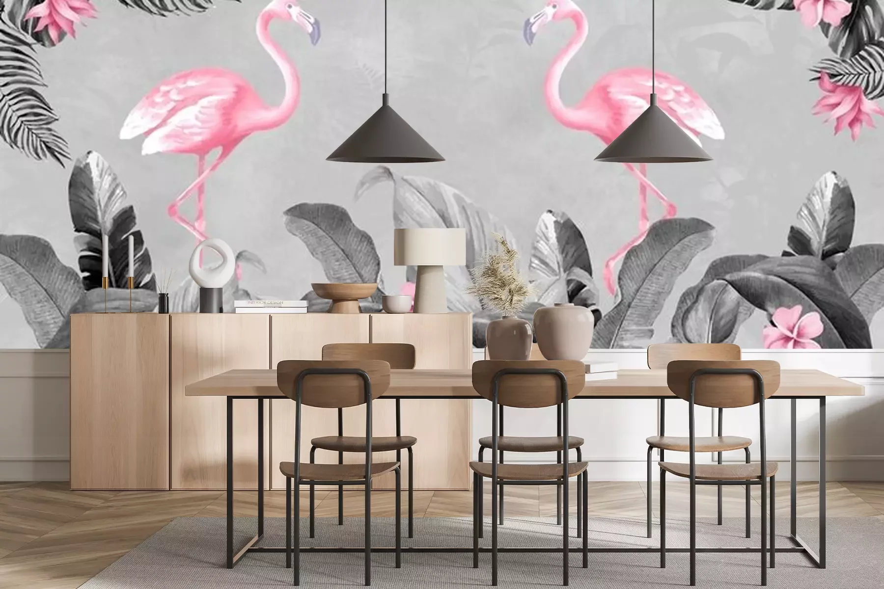 Fotobehang Flamingo's tussen tropische bladeren in grijstinten