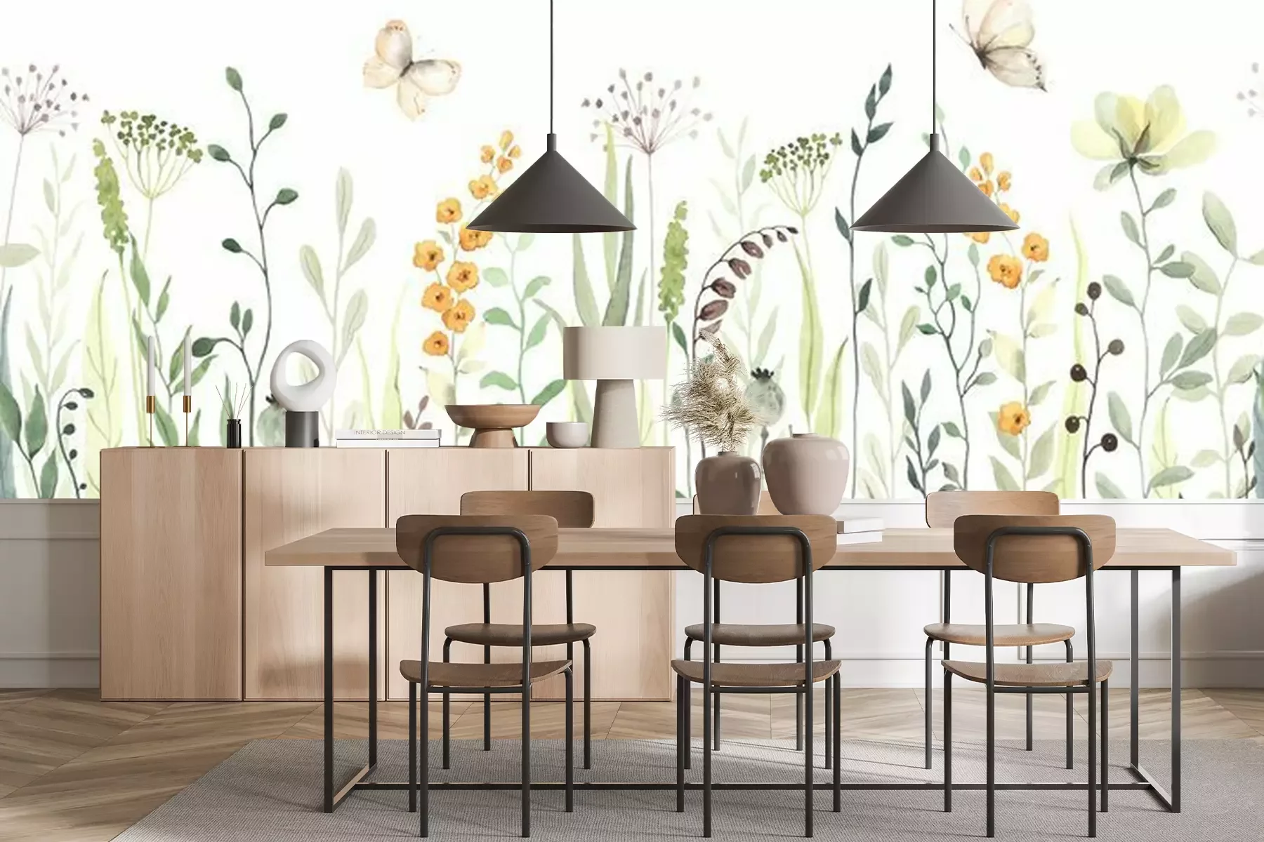 Fotobehang Floral seamless horizontal border with abstract yellow flowers, green leaves and plants, flying butterflies. Watercolor isolated pattern on white background, panoramic illustration summer meadow.