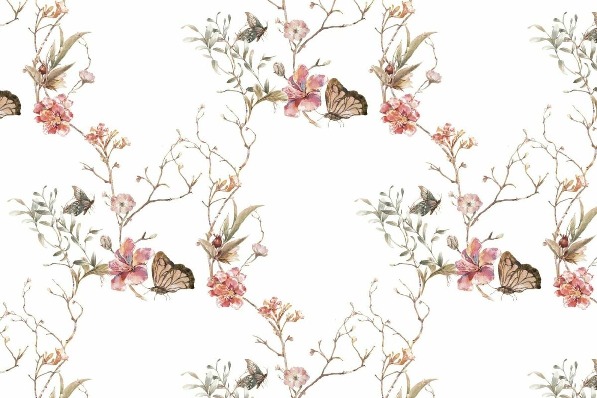 Fotobehang: Flowers and butterflies on branches in watercolor style delicate illustration