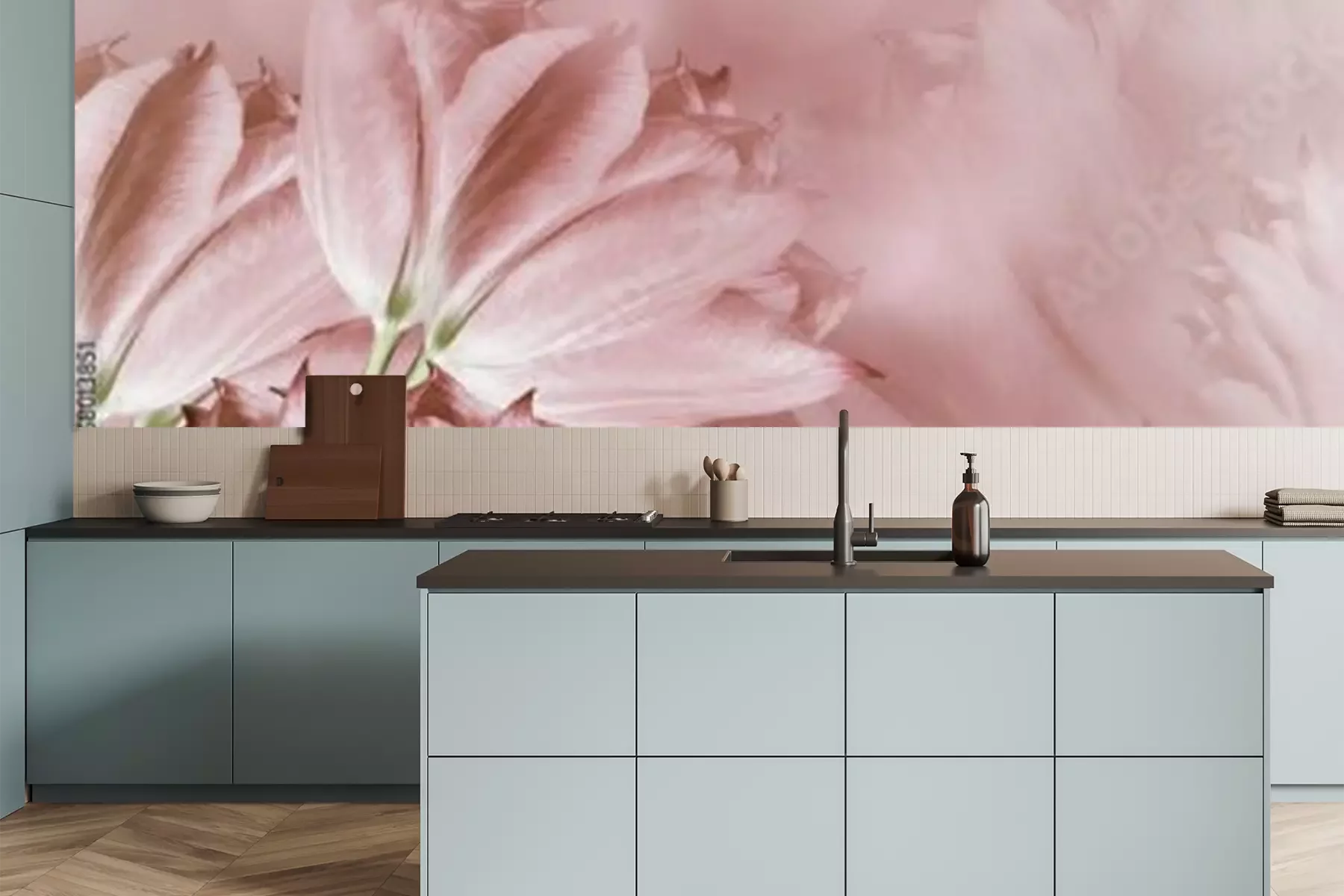 Het materiaal Premium is een glad vinyl op vlies, dat bestand is tegen uitrekken en vervorming. Het is dampdoorlatend – de muren kunnen vrij ademen – waardoor het geschikt is voor gebruik in de keuken en badkamer. Bij vervuiling kan het materiaal worden afgenomen met een vochtige doek. De maximale breedte van één baan bedraagt 95 of 105 cm, afhankelijk van de beschikbaarheid. Montage vindt plaats met de rand-aan-rand methode, wat een esthetisch resultaat zonder zichtbare naden oplevert. Omdat de lijm rechtstreeks op de muur wordt aangebracht, verloopt de installatie van het fotobehang snel en eenvoudig.