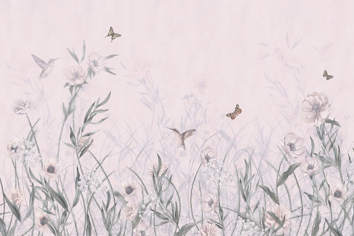 Fotobehang: Flowery meadow with hummingbirds and butterflies watercolor pattern