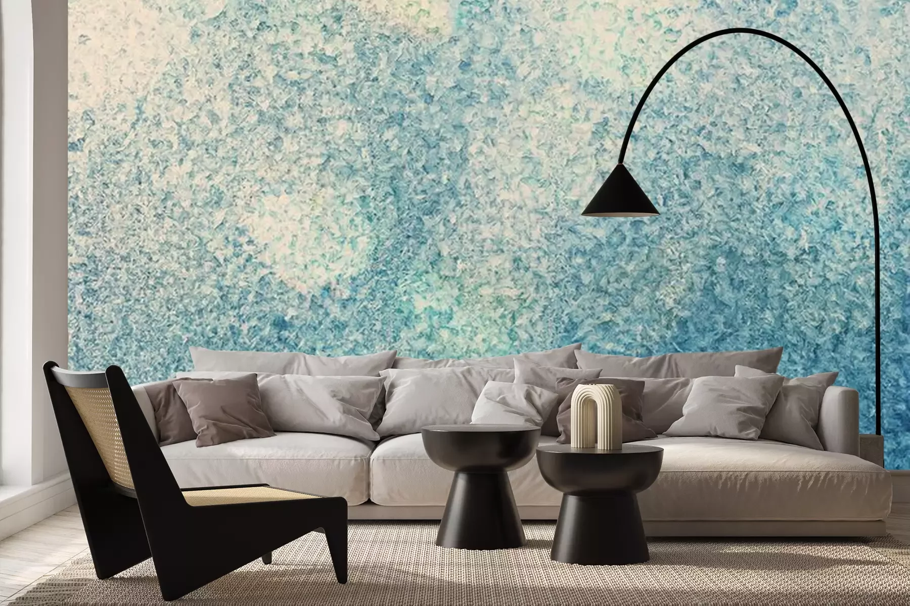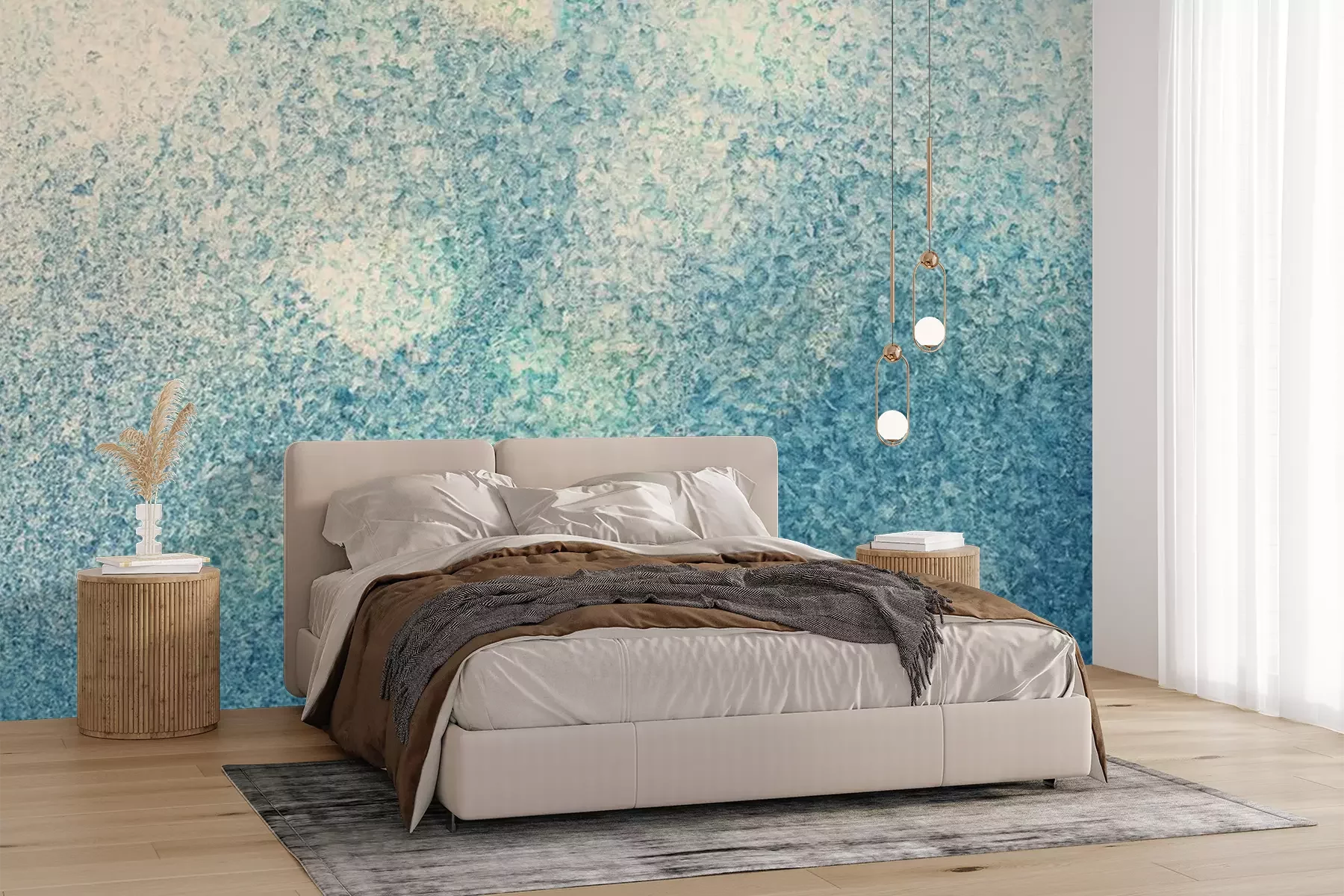Het materiaal Premium+ is een gestructureerd vinyl op vlies met een gewicht van 255 g/m², dat kleine oneffenheden in de muur effectief camoufleert. De subtiele structuur van fijn zand geeft het oppervlak een exclusieve uitstraling, terwijl de halfmatte afwerking de diepte van de kleuren benadrukt. Het materiaal is dampdoorlatend, waardoor het ook in de keuken en badkamer kan worden gebruikt. De maximale breedte van één baan bedraagt 100 cm – bij grotere afmetingen wordt het fotobehang in meerdere gelijke banen verdeeld. De lijm wordt direct op de muur aangebracht en het behang wordt rand-aan-rand geplakt, wat zorgt voor een esthetisch resultaat zonder zichtbare naden. Het oppervlak kan gemakkelijk worden schoongemaakt door het voorzichtig af te nemen met een vochtige doek.
