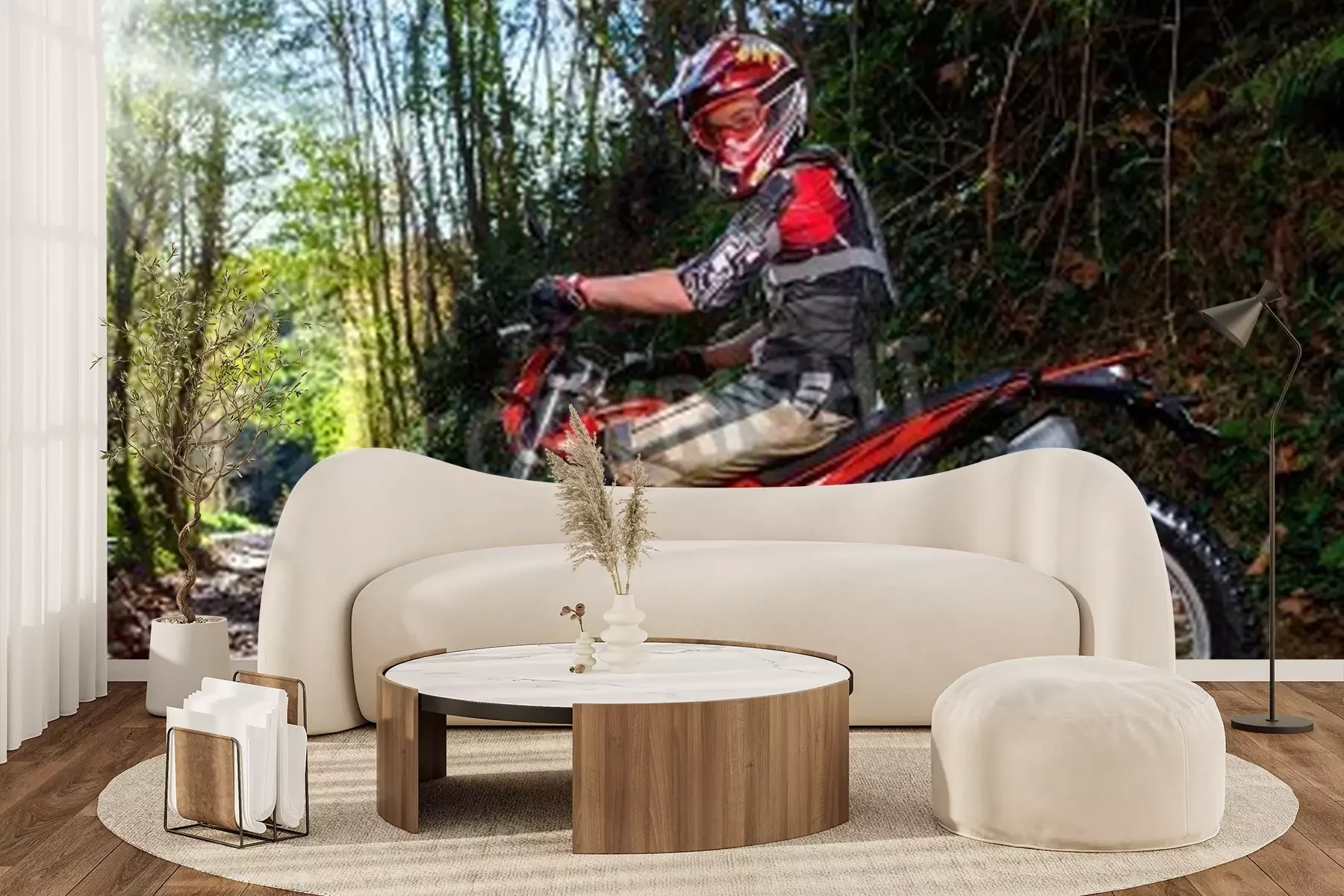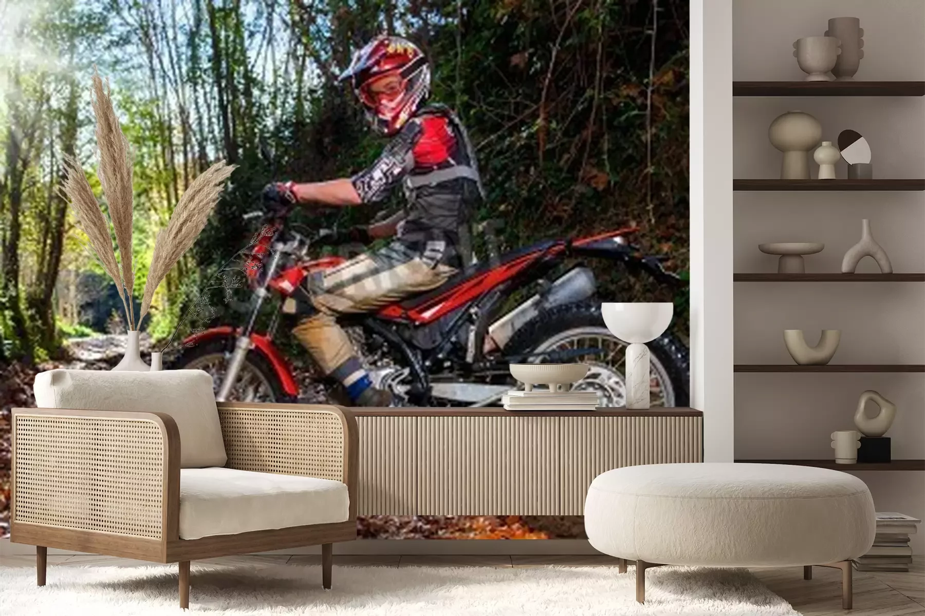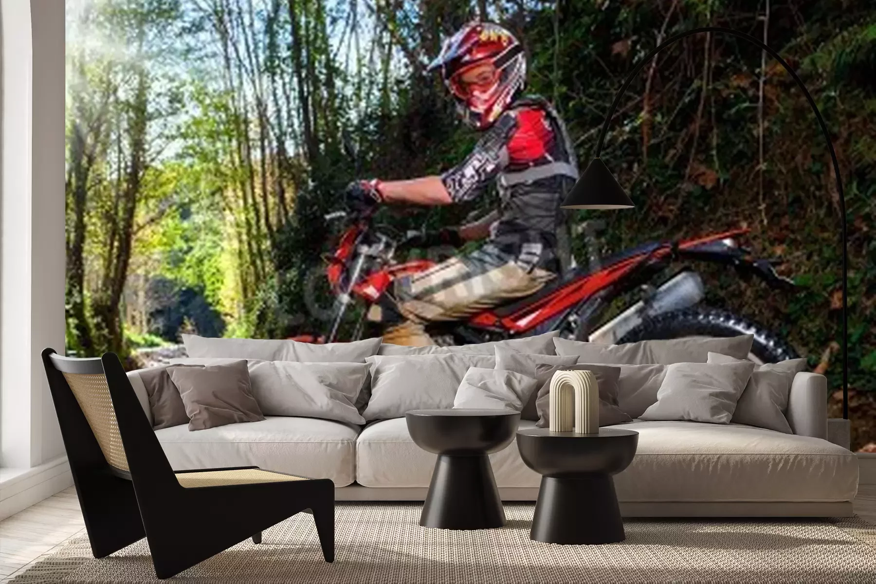 Fotobehang Full length portrait of motocross rider sitting on motorbike in woods.
