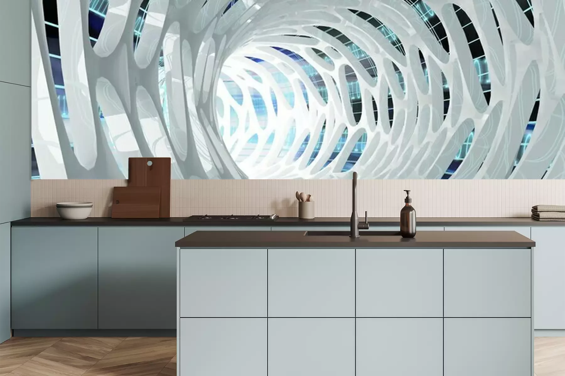 Het materiaal Premium is een glad vinyl op vlies, dat bestand is tegen uitrekken en vervorming. Het is dampdoorlatend – de muren kunnen vrij ademen – waardoor het geschikt is voor gebruik in de keuken en badkamer. Bij vervuiling kan het materiaal worden afgenomen met een vochtige doek. De maximale breedte van één baan bedraagt 95 of 105 cm, afhankelijk van de beschikbaarheid. Montage vindt plaats met de rand-aan-rand methode, wat een esthetisch resultaat zonder zichtbare naden oplevert. Omdat de lijm rechtstreeks op de muur wordt aangebracht, verloopt de installatie van het fotobehang snel en eenvoudig.
