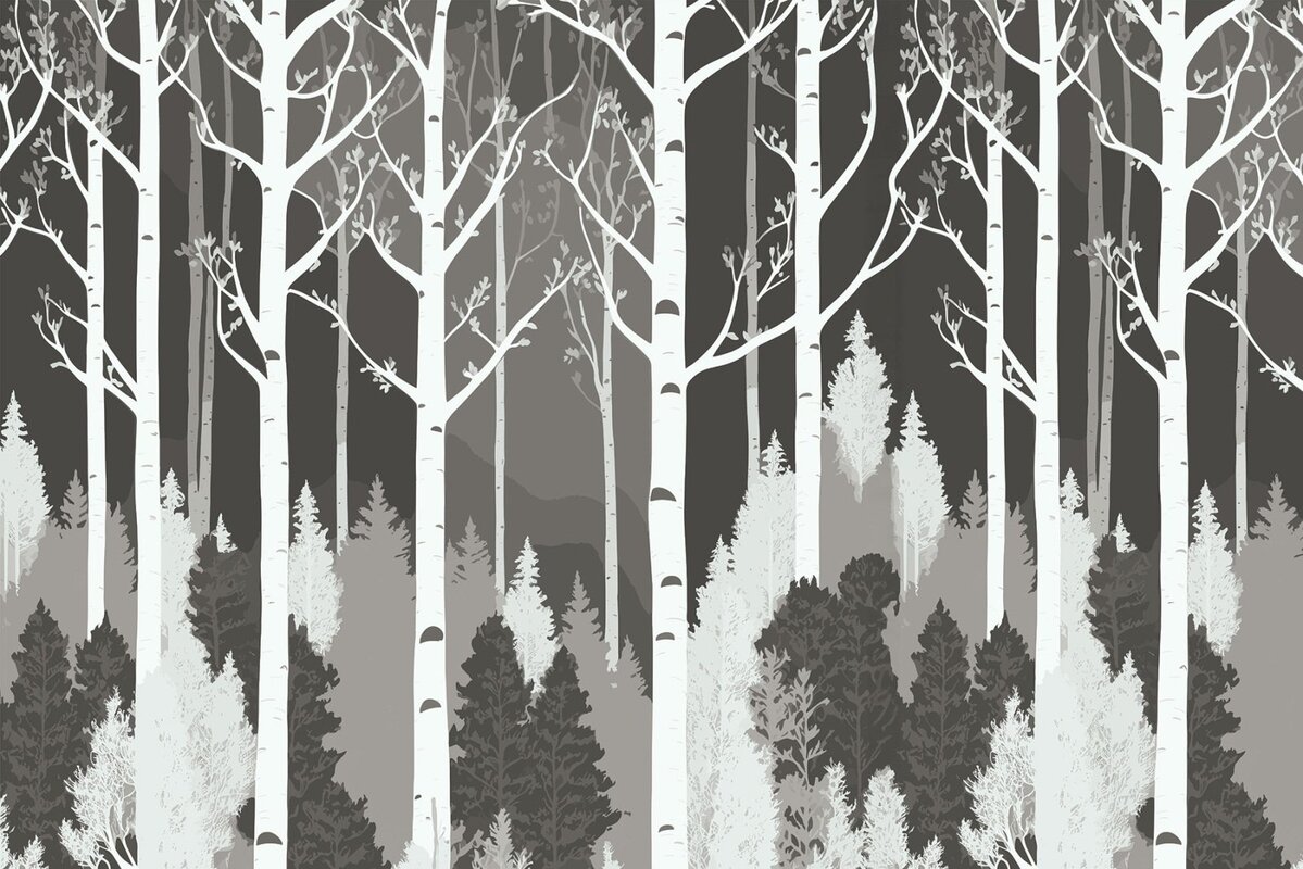 Fotobehang: Geïllustreerd berkenbos in grijze kleuren