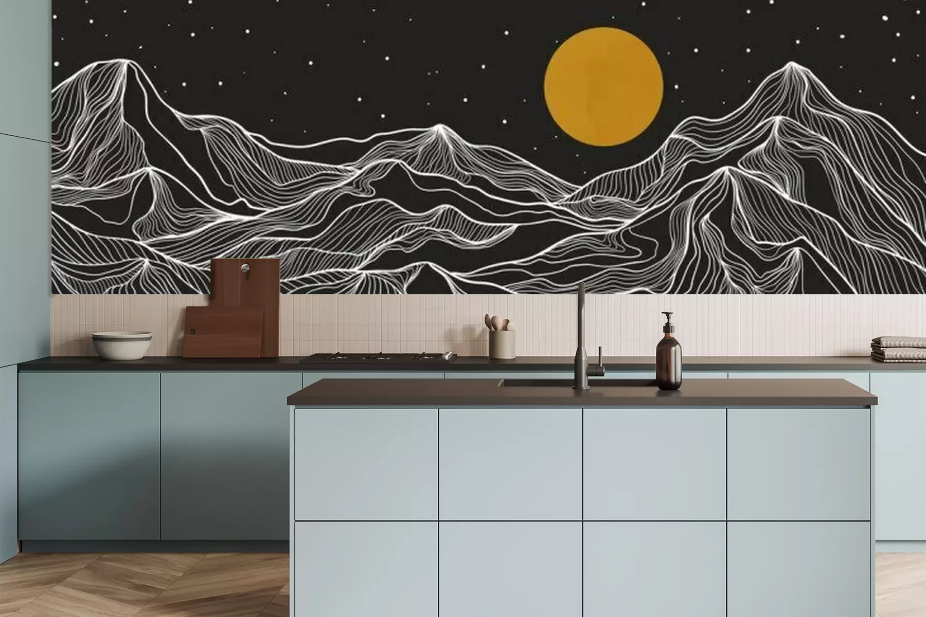 Het materiaal Premium is een glad vinyl op vlies, dat bestand is tegen uitrekken en vervorming. Het is dampdoorlatend – de muren kunnen vrij ademen – waardoor het geschikt is voor gebruik in de keuken en badkamer. Bij vervuiling kan het materiaal worden afgenomen met een vochtige doek. De maximale breedte van één baan bedraagt 95 of 105 cm, afhankelijk van de beschikbaarheid. Montage vindt plaats met de rand-aan-rand methode, wat een esthetisch resultaat zonder zichtbare naden oplevert. Omdat de lijm rechtstreeks op de muur wordt aangebracht, verloopt de installatie van het fotobehang snel en eenvoudig.