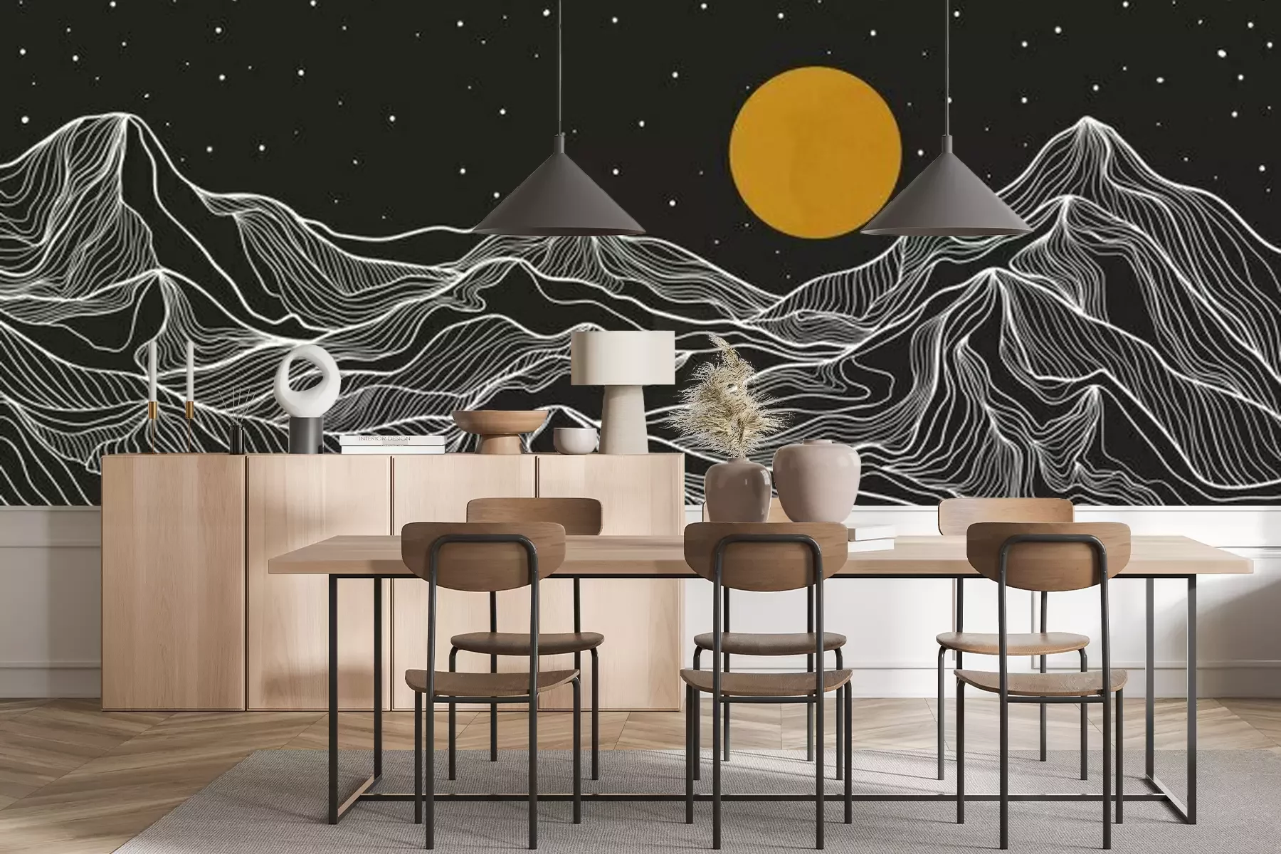 Het materiaal Premium+ is een gestructureerd vinyl op vlies met een gewicht van 255 g/m², dat kleine oneffenheden in de muur effectief camoufleert. De subtiele structuur van fijn zand geeft het oppervlak een exclusieve uitstraling, terwijl de halfmatte afwerking de diepte van de kleuren benadrukt. Het materiaal is dampdoorlatend, waardoor het ook in de keuken en badkamer kan worden gebruikt. De maximale breedte van één baan bedraagt 100 cm – bij grotere afmetingen wordt het fotobehang in meerdere gelijke banen verdeeld. De lijm wordt direct op de muur aangebracht en het behang wordt rand-aan-rand geplakt, wat zorgt voor een esthetisch resultaat zonder zichtbare naden. Het oppervlak kan gemakkelijk worden schoongemaakt door het voorzichtig af te nemen met een vochtige doek.