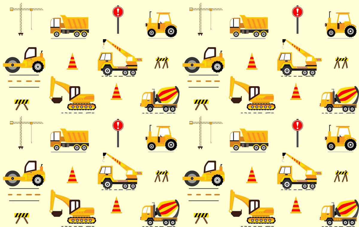 Fotobehang: Gele speelgoedauto's graafmachine kraan kinderpatroon