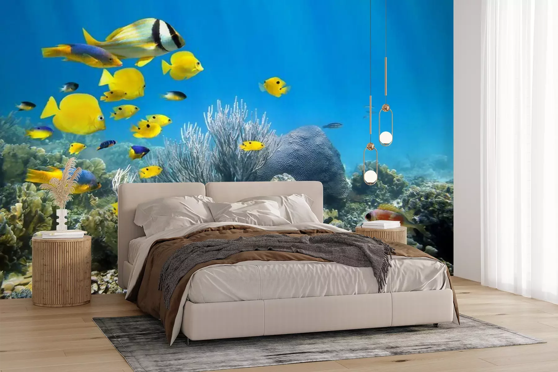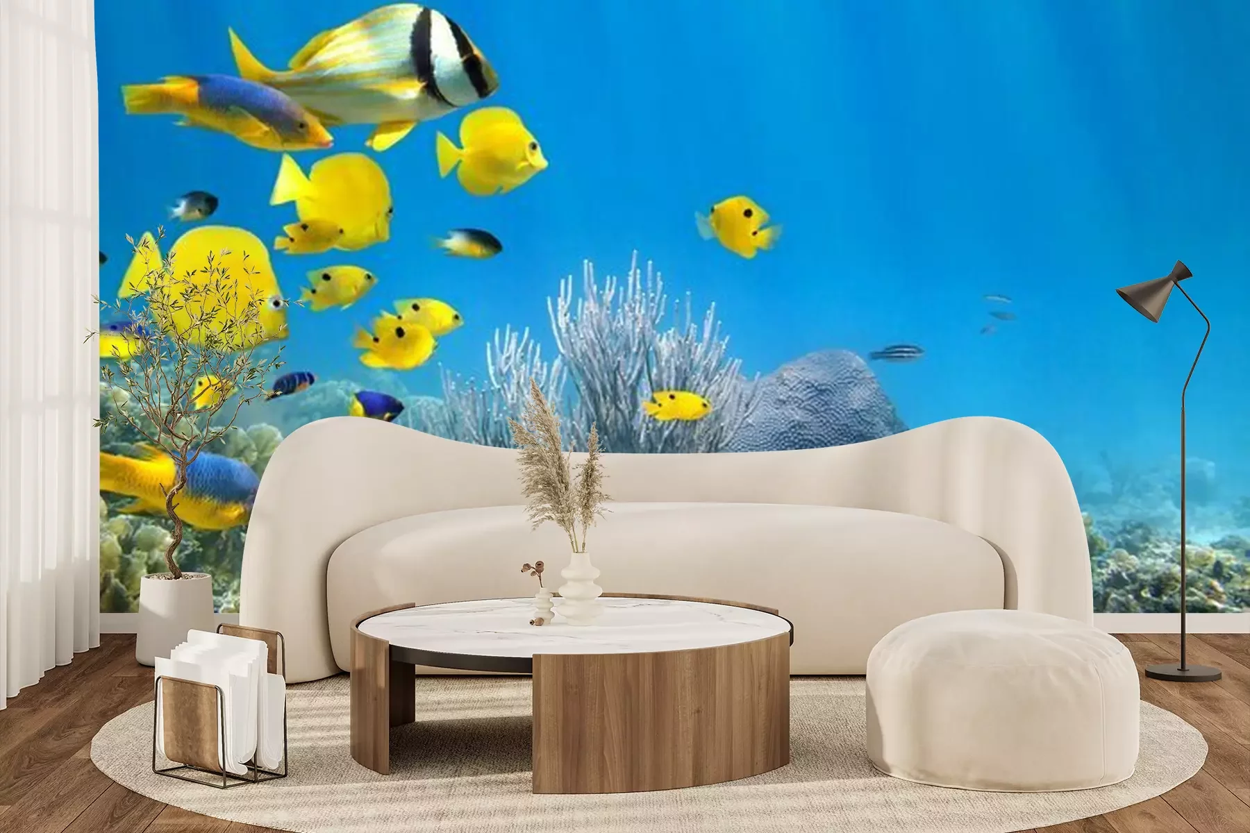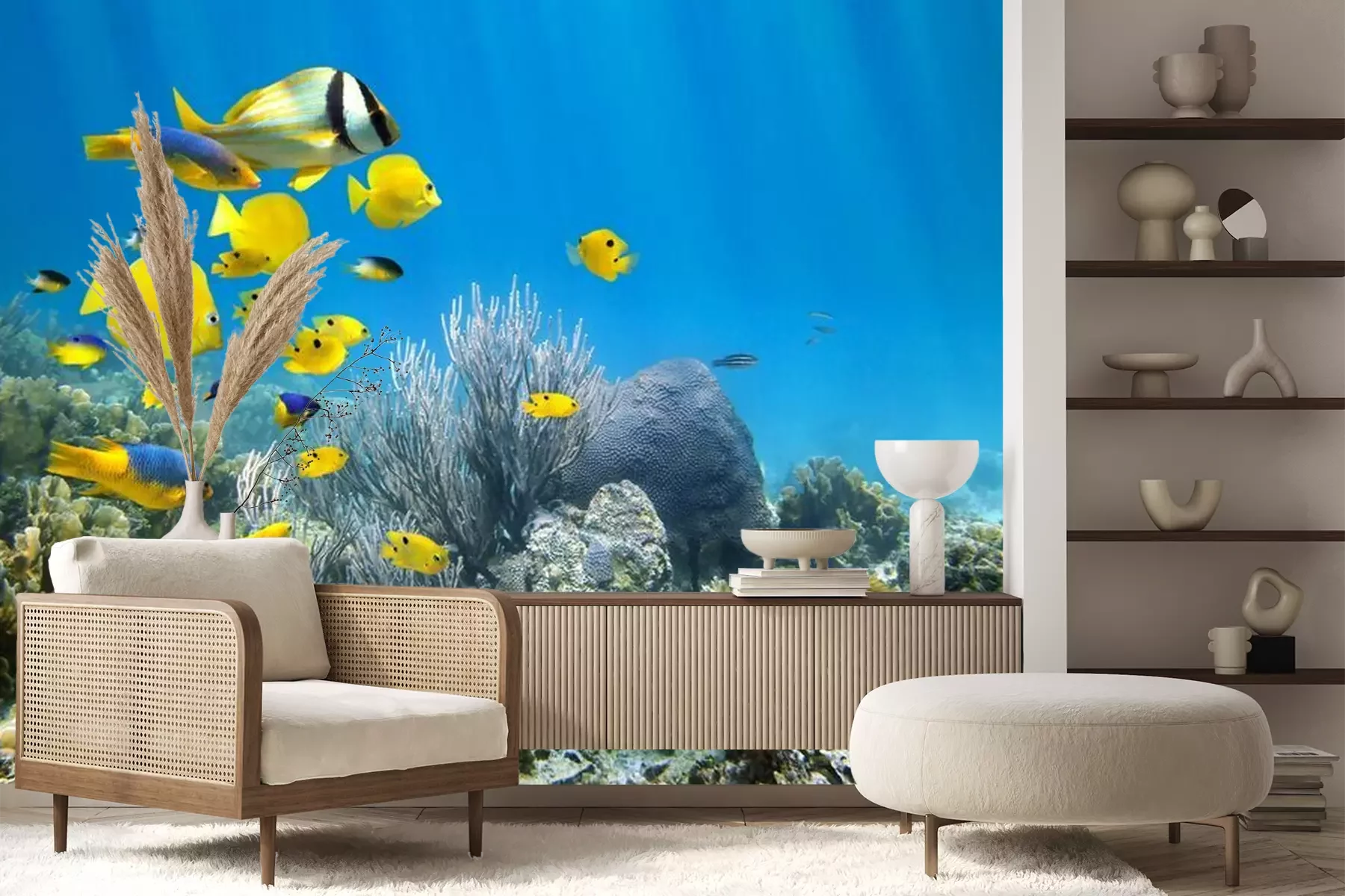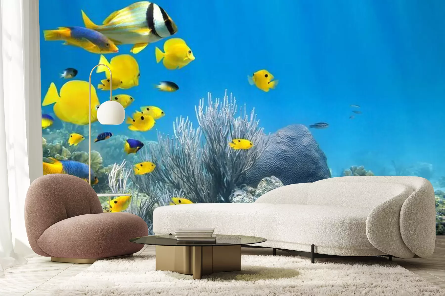 Fotobehang Gele vissen tussen onderwaterrotsen
