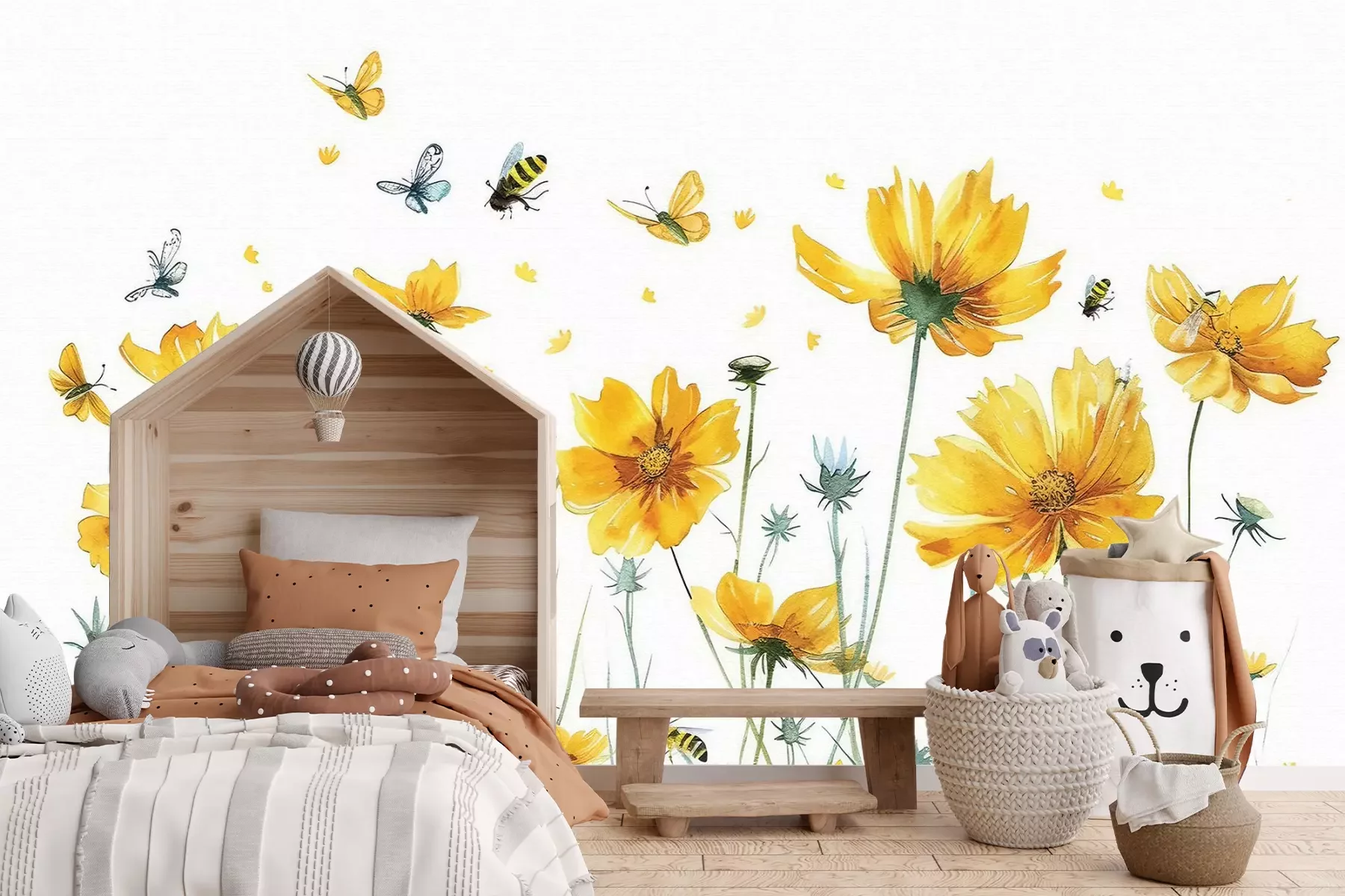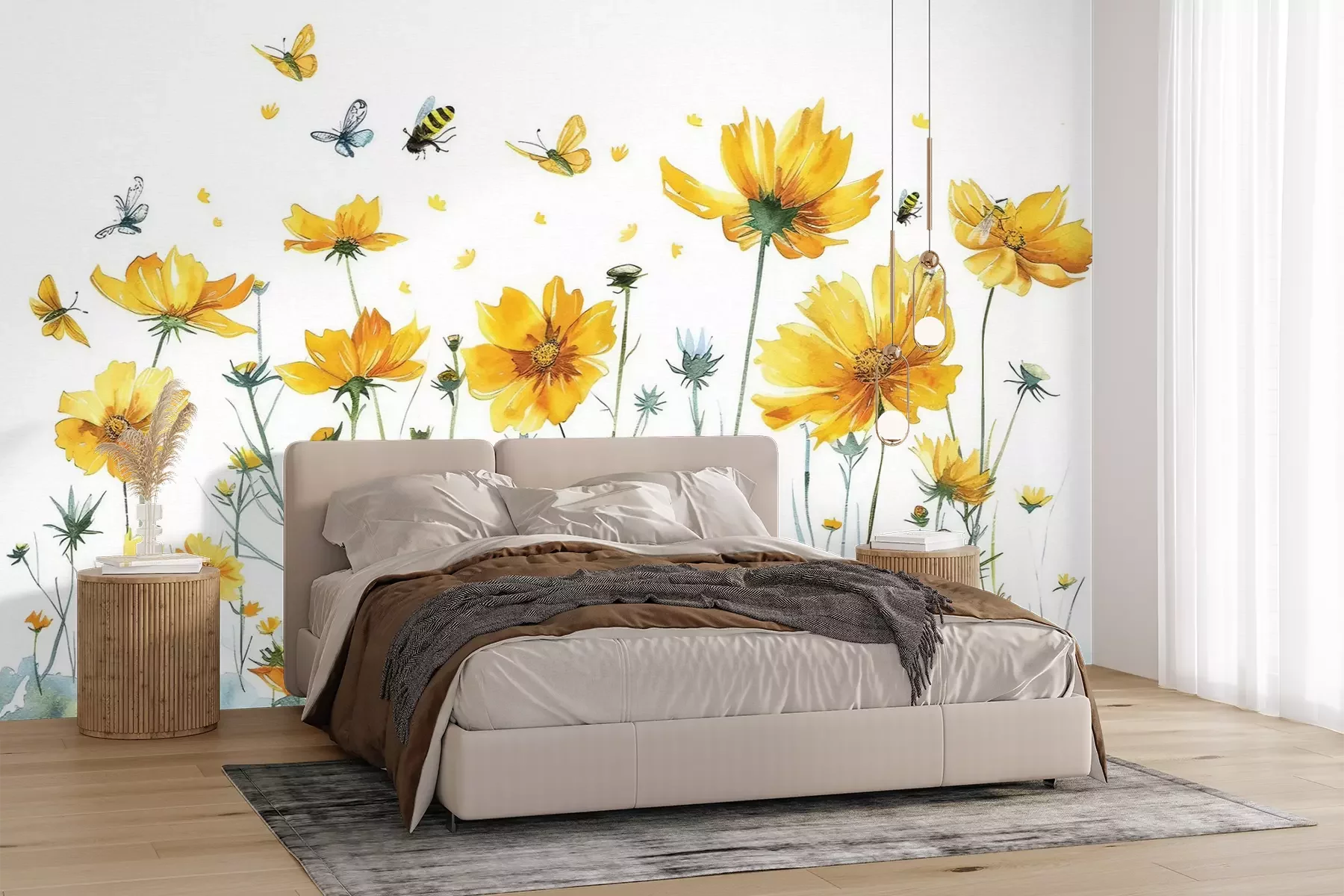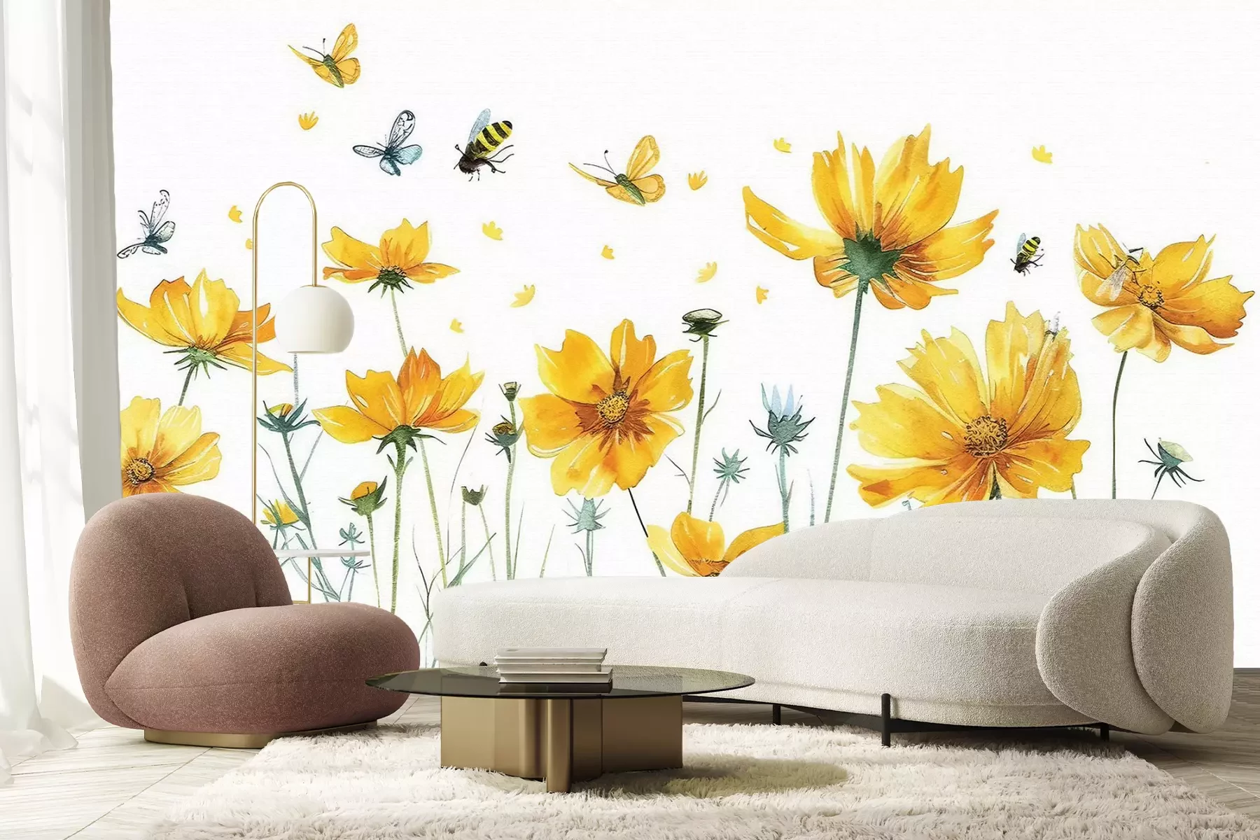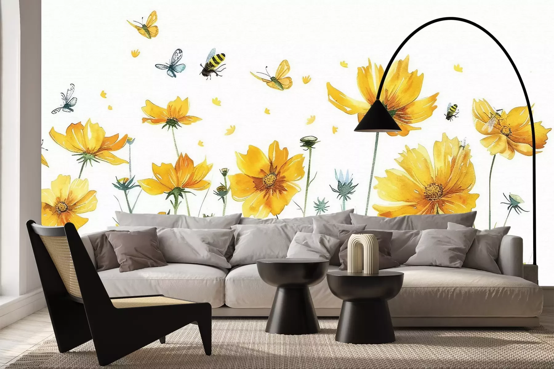 Gele wilde bloemen met botanisch patroon van insecten en vlinders op een lichte achtergrond