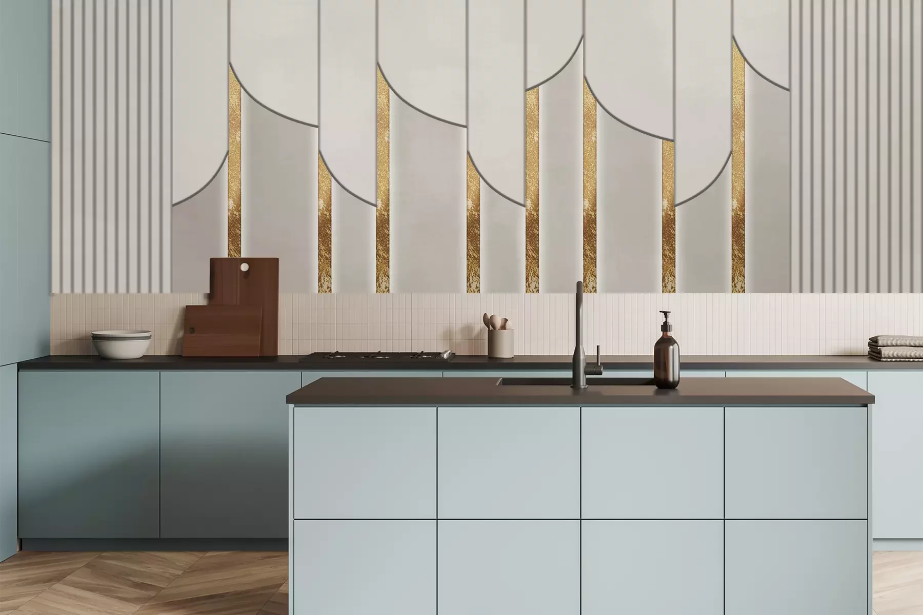 Het materiaal Premium is een glad vinyl op vlies, dat bestand is tegen uitrekken en vervorming. Het is dampdoorlatend – de muren kunnen vrij ademen – waardoor het geschikt is voor gebruik in de keuken en badkamer. Bij vervuiling kan het materiaal worden afgenomen met een vochtige doek. De maximale breedte van één baan bedraagt 95 of 105 cm, afhankelijk van de beschikbaarheid. Montage vindt plaats met de rand-aan-rand methode, wat een esthetisch resultaat zonder zichtbare naden oplevert. Omdat de lijm rechtstreeks op de muur wordt aangebracht, verloopt de installatie van het fotobehang snel en eenvoudig.