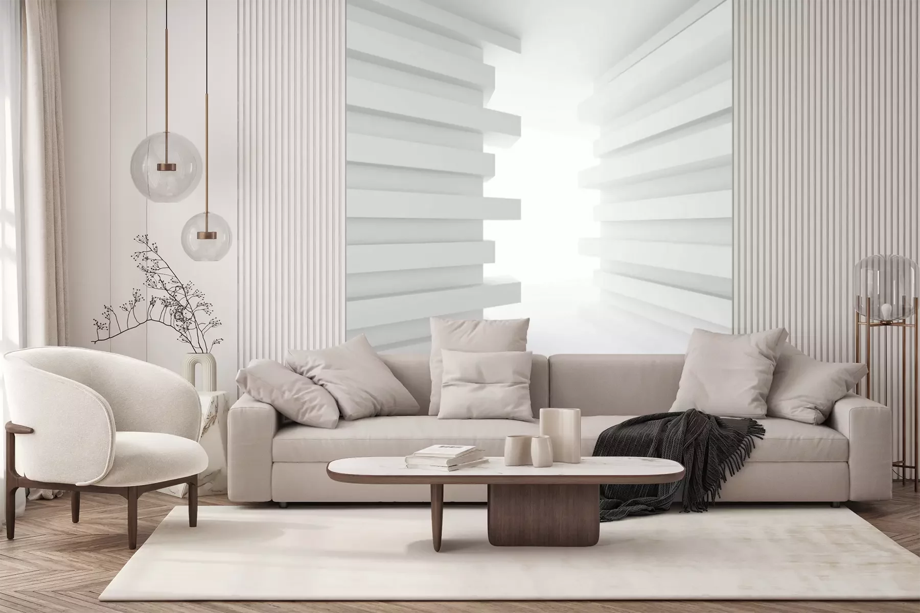 Het materiaal Premium+ is een gestructureerd vinyl op vlies met een gewicht van 255 g/m², dat kleine oneffenheden in de muur effectief camoufleert. De subtiele structuur van fijn zand geeft het oppervlak een exclusieve uitstraling, terwijl de halfmatte afwerking de diepte van de kleuren benadrukt. Het materiaal is dampdoorlatend, waardoor het ook in de keuken en badkamer kan worden gebruikt. De maximale breedte van één baan bedraagt 100 cm – bij grotere afmetingen wordt het fotobehang in meerdere gelijke banen verdeeld. De lijm wordt direct op de muur aangebracht en het behang wordt rand-aan-rand geplakt, wat zorgt voor een esthetisch resultaat zonder zichtbare naden. Het oppervlak kan gemakkelijk worden schoongemaakt door het voorzichtig af te nemen met een vochtige doek.