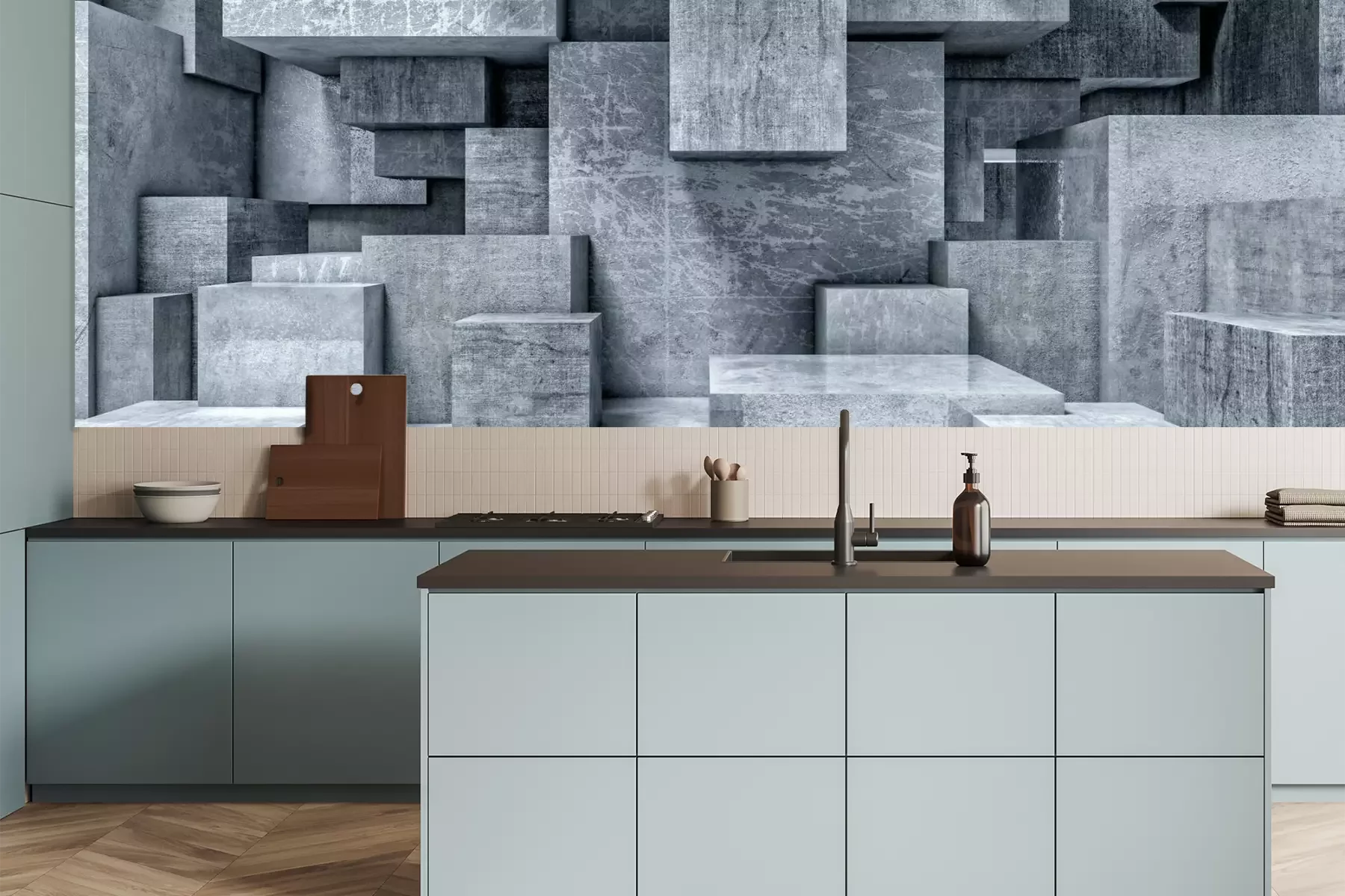 Het materiaal Premium is een glad vinyl op vlies, dat bestand is tegen uitrekken en vervorming. Het is dampdoorlatend – de muren kunnen vrij ademen – waardoor het geschikt is voor gebruik in de keuken en badkamer. Bij vervuiling kan het materiaal worden afgenomen met een vochtige doek. De maximale breedte van één baan bedraagt 95 of 105 cm, afhankelijk van de beschikbaarheid. Montage vindt plaats met de rand-aan-rand methode, wat een esthetisch resultaat zonder zichtbare naden oplevert. Omdat de lijm rechtstreeks op de muur wordt aangebracht, verloopt de installatie van het fotobehang snel en eenvoudig.
