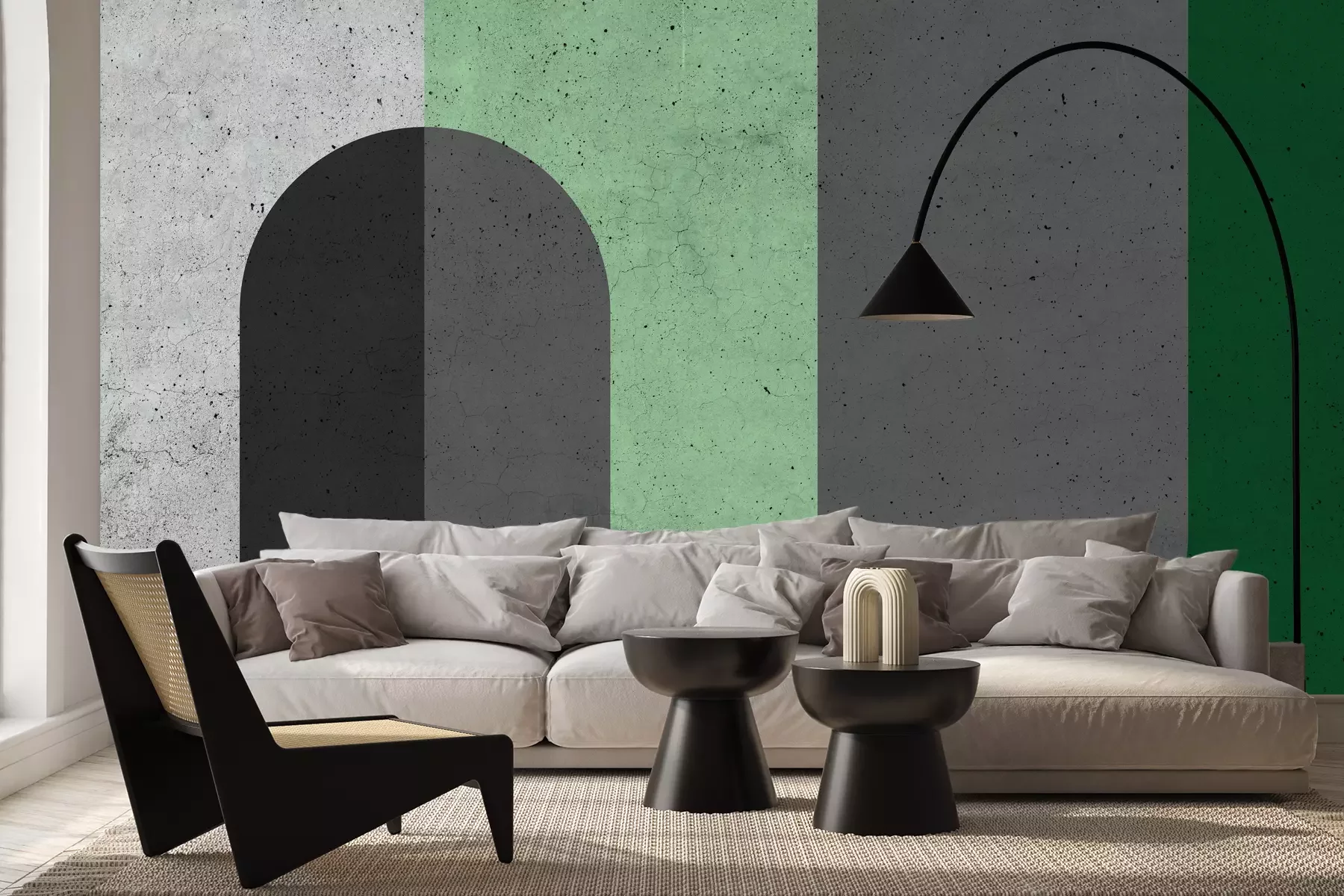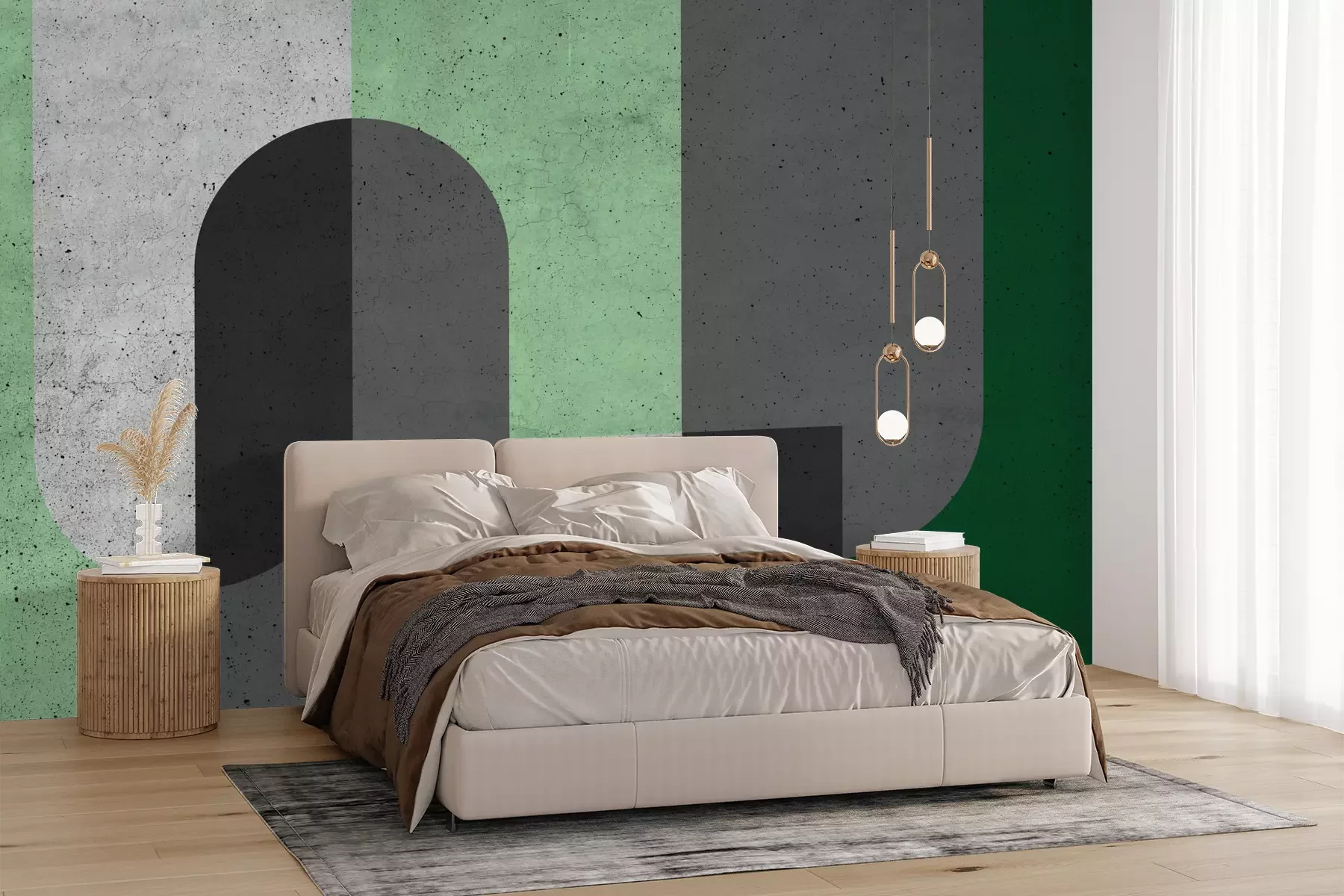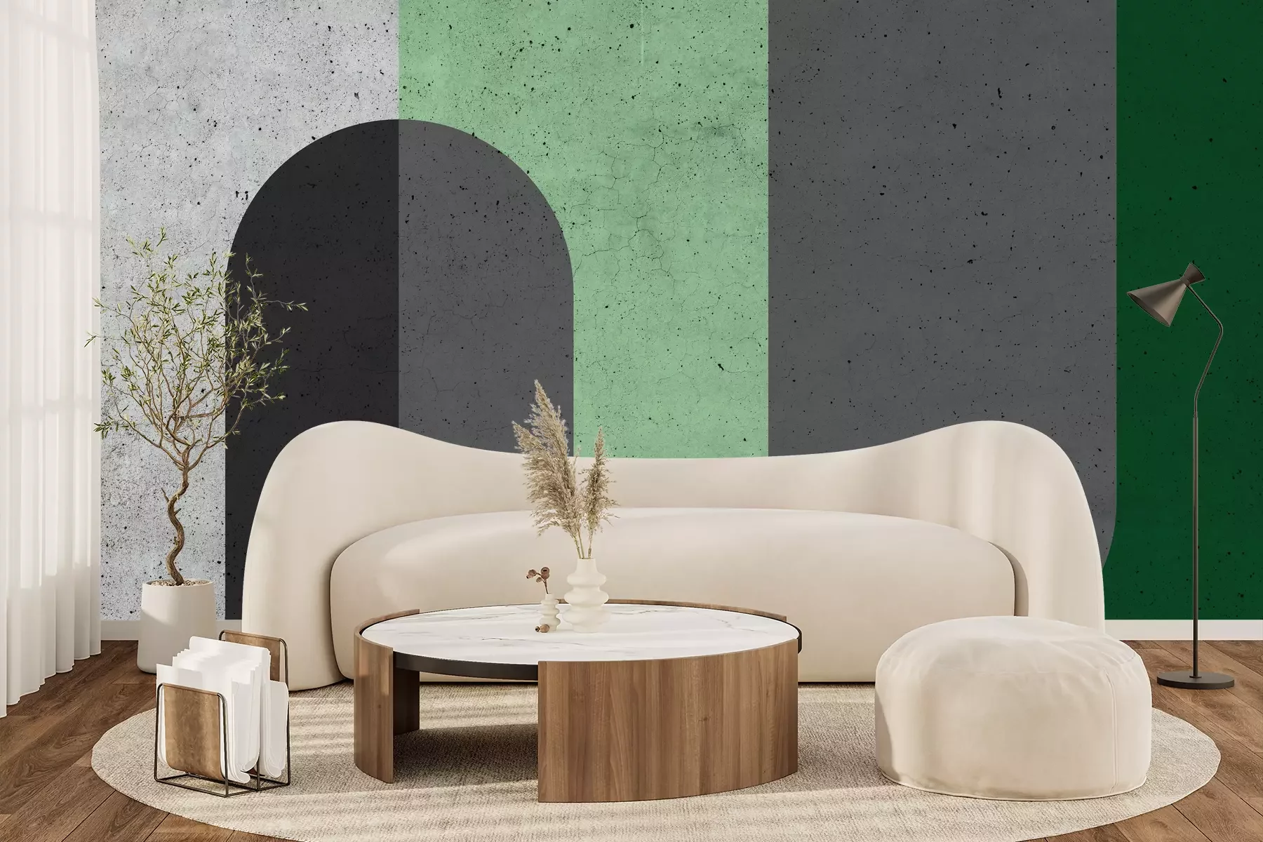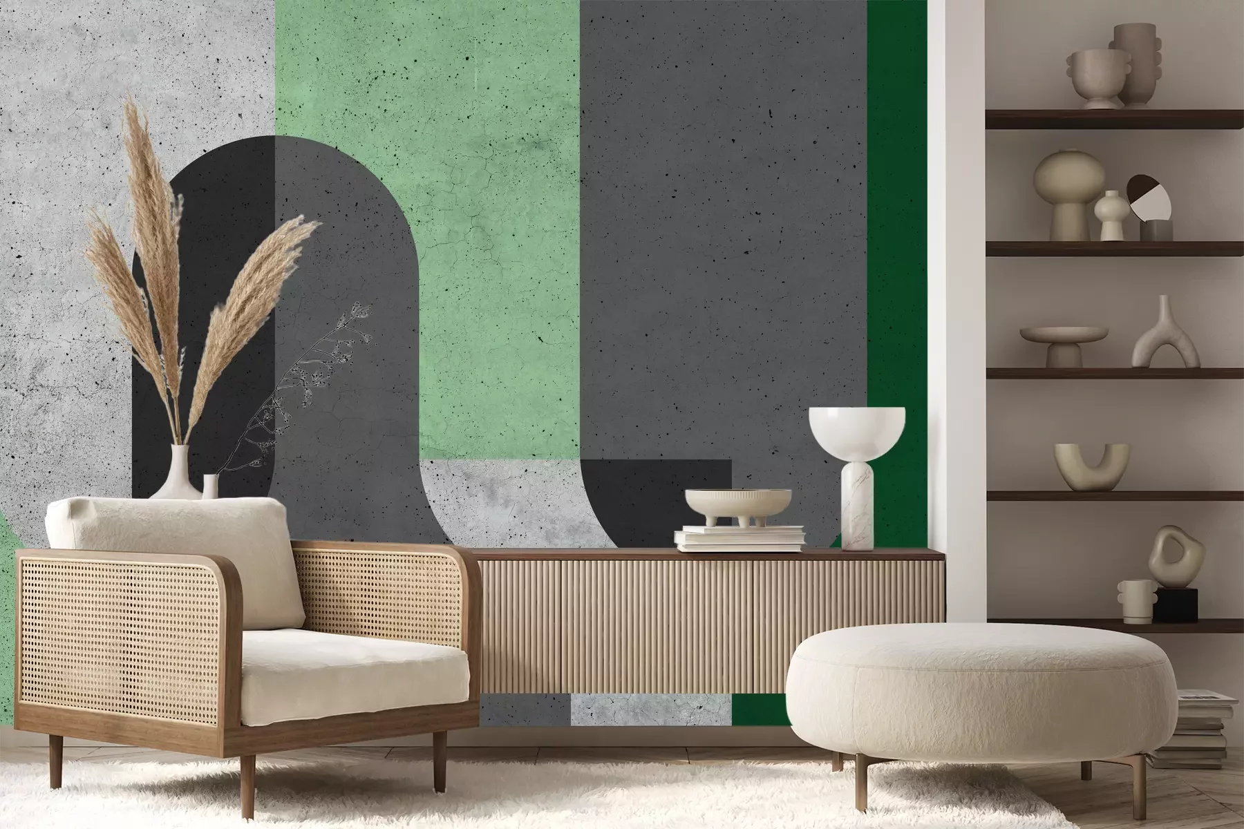 Geometrische blokken in groene en grijze tinten met een betontextuur