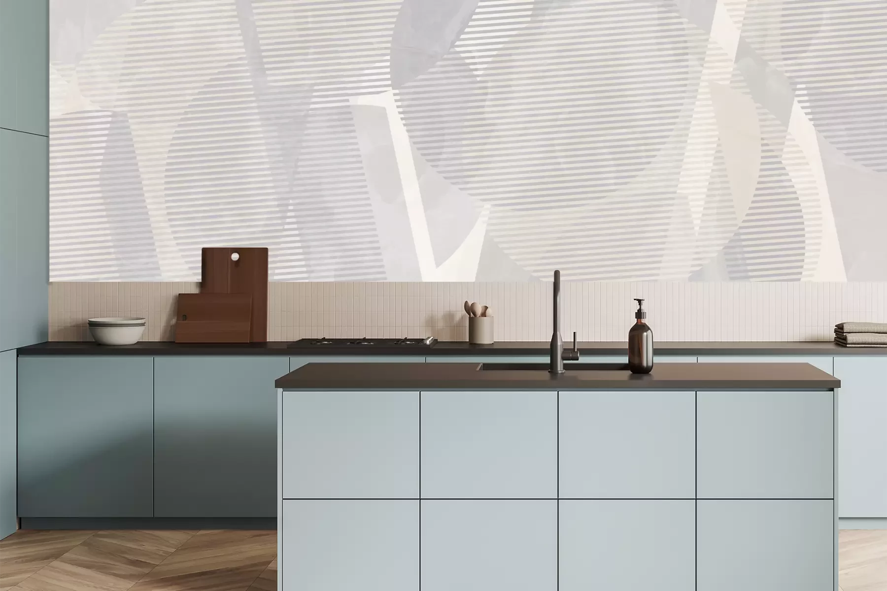 Het materiaal Premium is een glad vinyl op vlies, dat bestand is tegen uitrekken en vervorming. Het is dampdoorlatend – de muren kunnen vrij ademen – waardoor het geschikt is voor gebruik in de keuken en badkamer. Bij vervuiling kan het materiaal worden afgenomen met een vochtige doek. De maximale breedte van één baan bedraagt 95 of 105 cm, afhankelijk van de beschikbaarheid. Montage vindt plaats met de rand-aan-rand methode, wat een esthetisch resultaat zonder zichtbare naden oplevert. Omdat de lijm rechtstreeks op de muur wordt aangebracht, verloopt de installatie van het fotobehang snel en eenvoudig.