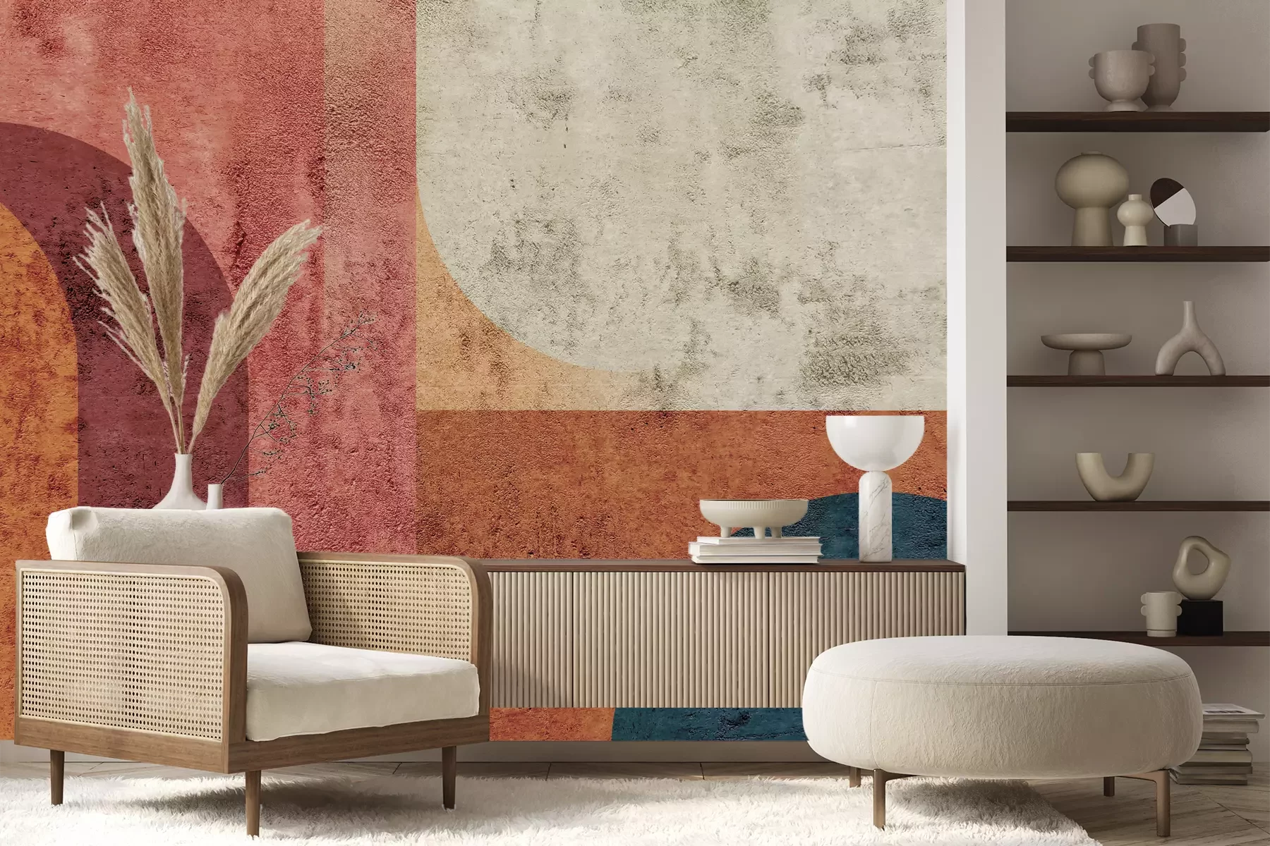 Het materiaal Premium+ is een gestructureerd vinyl op vlies met een gewicht van 255 g/m², dat kleine oneffenheden in de muur effectief camoufleert. De subtiele structuur van fijn zand geeft het oppervlak een exclusieve uitstraling, terwijl de halfmatte afwerking de diepte van de kleuren benadrukt. Het materiaal is dampdoorlatend, waardoor het ook in de keuken en badkamer kan worden gebruikt. De maximale breedte van één baan bedraagt 100 cm – bij grotere afmetingen wordt het fotobehang in meerdere gelijke banen verdeeld. De lijm wordt direct op de muur aangebracht en het behang wordt rand-aan-rand geplakt, wat zorgt voor een esthetisch resultaat zonder zichtbare naden. Het oppervlak kan gemakkelijk worden schoongemaakt door het voorzichtig af te nemen met een vochtige doek.