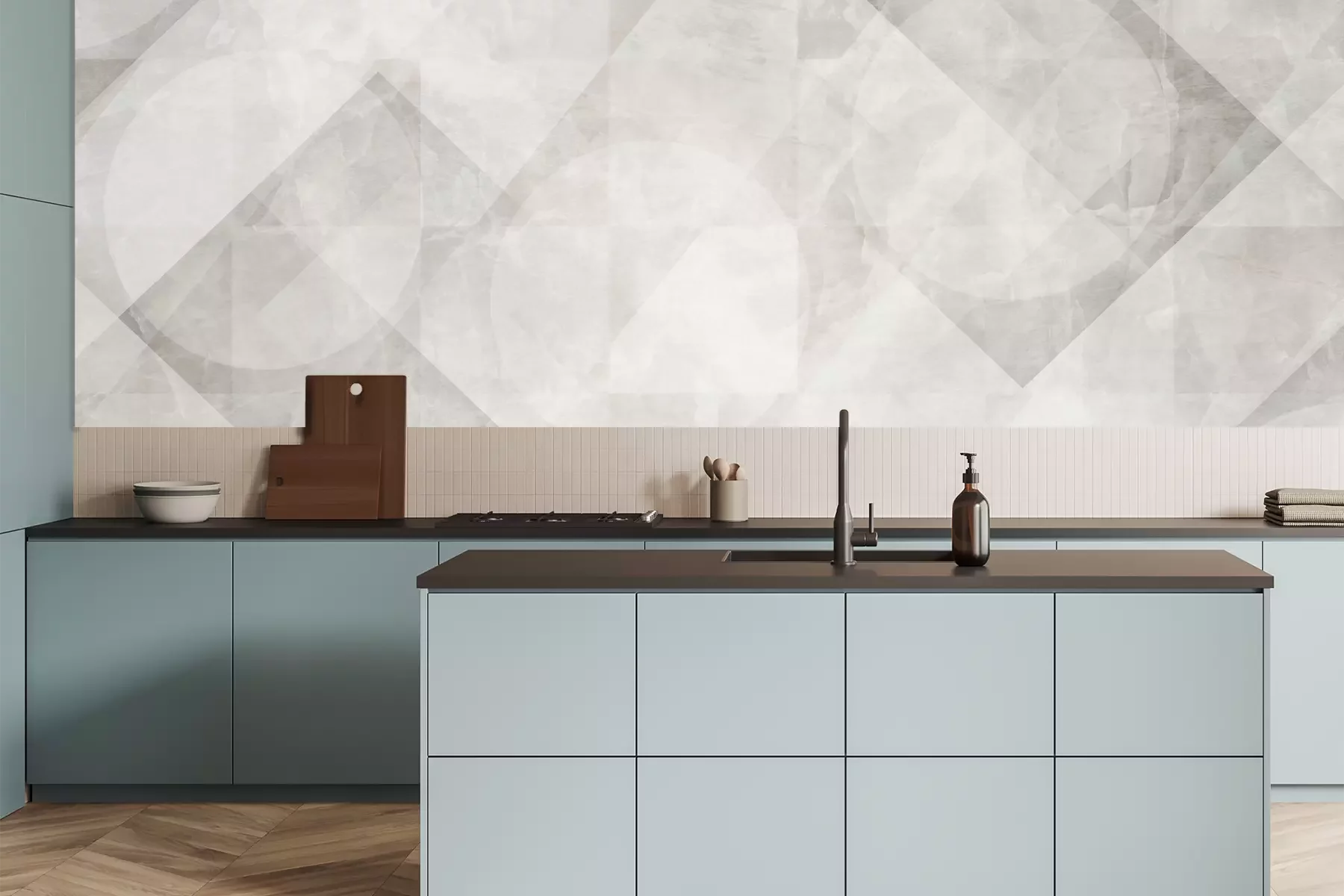 Het materiaal Premium is een glad vinyl op vlies, dat bestand is tegen uitrekken en vervorming. Het is dampdoorlatend – de muren kunnen vrij ademen – waardoor het geschikt is voor gebruik in de keuken en badkamer. Bij vervuiling kan het materiaal worden afgenomen met een vochtige doek. De maximale breedte van één baan bedraagt 95 of 105 cm, afhankelijk van de beschikbaarheid. Montage vindt plaats met de rand-aan-rand methode, wat een esthetisch resultaat zonder zichtbare naden oplevert. Omdat de lijm rechtstreeks op de muur wordt aangebracht, verloopt de installatie van het fotobehang snel en eenvoudig.