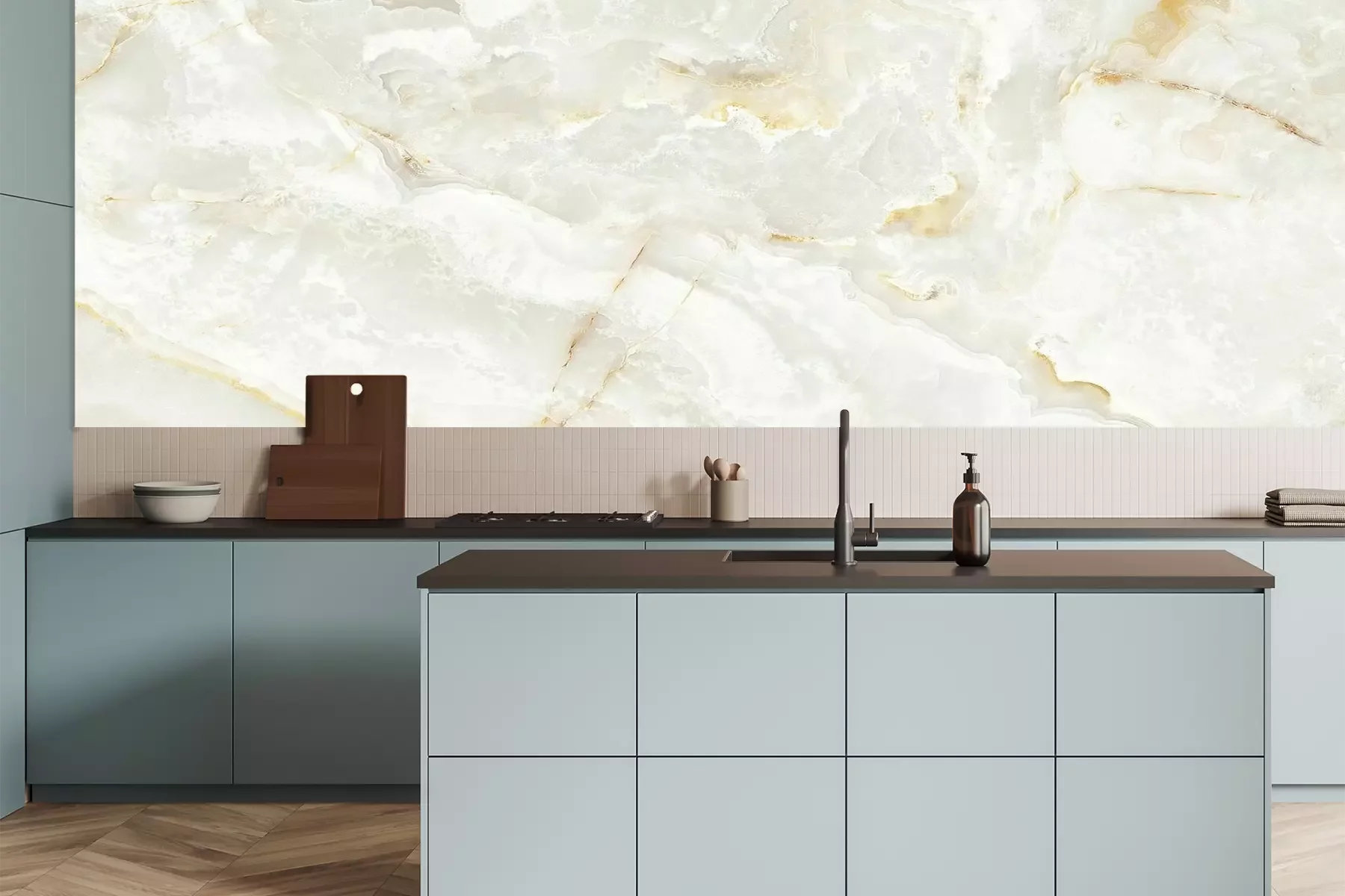 Het materiaal Premium is een glad vinyl op vlies, dat bestand is tegen uitrekken en vervorming. Het is dampdoorlatend – de muren kunnen vrij ademen – waardoor het geschikt is voor gebruik in de keuken en badkamer. Bij vervuiling kan het materiaal worden afgenomen met een vochtige doek. De maximale breedte van één baan bedraagt 95 of 105 cm, afhankelijk van de beschikbaarheid. Montage vindt plaats met de rand-aan-rand methode, wat een esthetisch resultaat zonder zichtbare naden oplevert. Omdat de lijm rechtstreeks op de muur wordt aangebracht, verloopt de installatie van het fotobehang snel en eenvoudig.