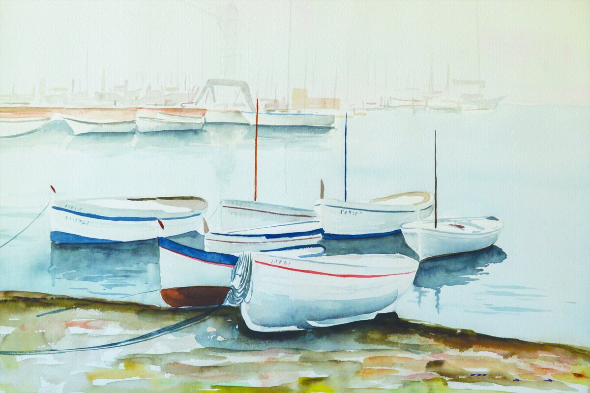 Fotobehang: Geschilderd patroon met boten aan de kust