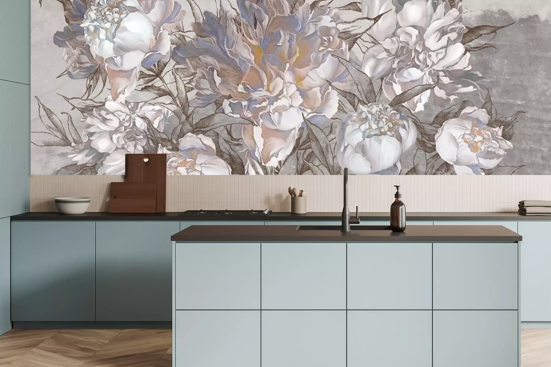 Het materiaal Premium is een glad vinyl op vlies, dat bestand is tegen uitrekken en vervorming. Het is dampdoorlatend – de muren kunnen vrij ademen – waardoor het geschikt is voor gebruik in de keuken en badkamer. Bij vervuiling kan het materiaal worden afgenomen met een vochtige doek. De maximale breedte van één baan bedraagt 95 of 105 cm, afhankelijk van de beschikbaarheid. Montage vindt plaats met de rand-aan-rand methode, wat een esthetisch resultaat zonder zichtbare naden oplevert. Omdat de lijm rechtstreeks op de muur wordt aangebracht, verloopt de installatie van het fotobehang snel en eenvoudig.