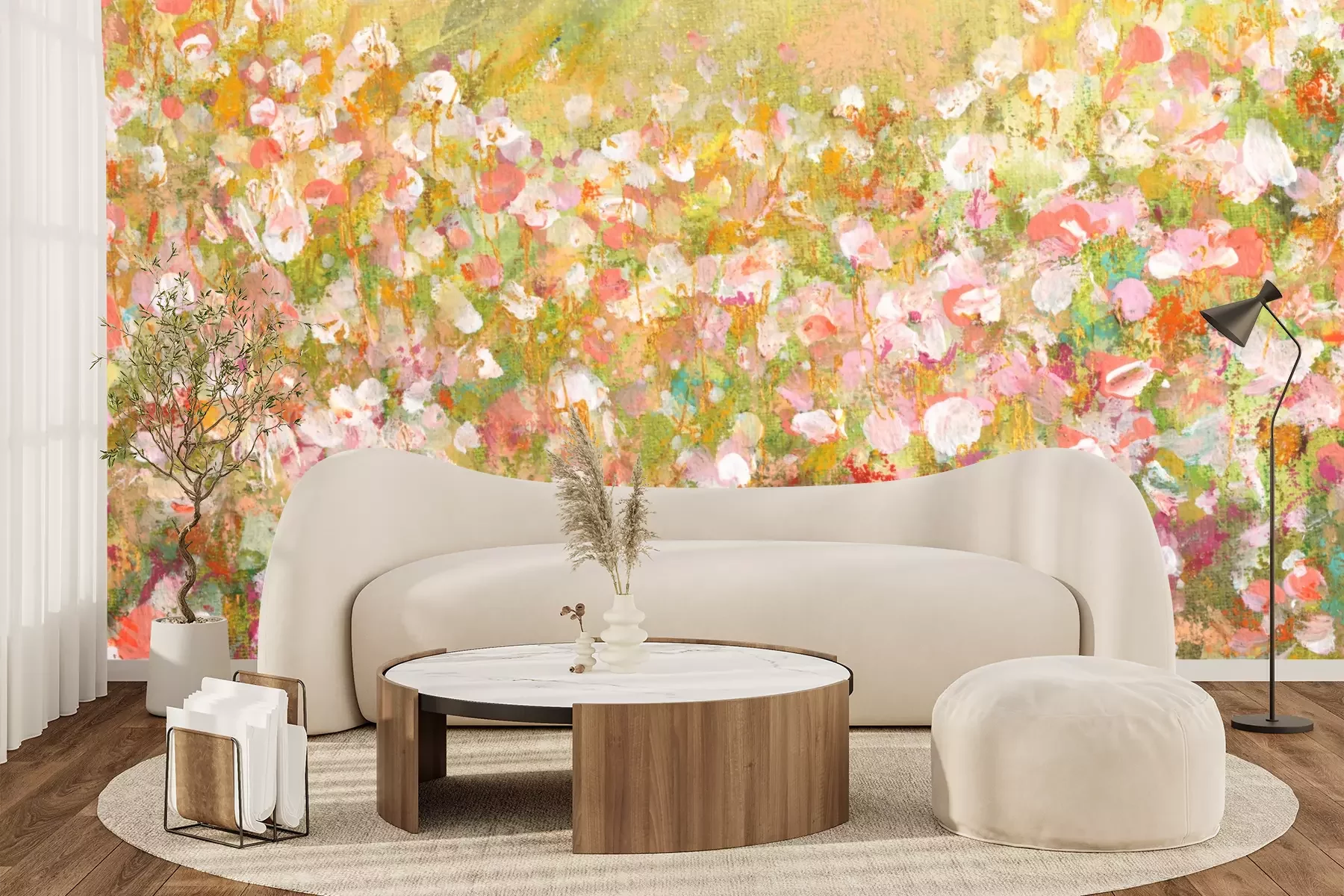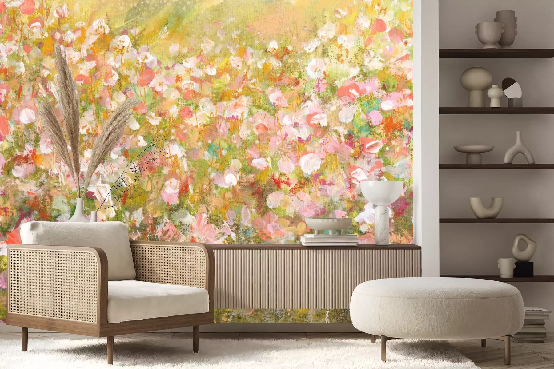 Het materiaal Premium+ is een gestructureerd vinyl op vlies met een gewicht van 255 g/m², dat kleine oneffenheden in de muur effectief camoufleert. De subtiele structuur van fijn zand geeft het oppervlak een exclusieve uitstraling, terwijl de halfmatte afwerking de diepte van de kleuren benadrukt. Het materiaal is dampdoorlatend, waardoor het ook in de keuken en badkamer kan worden gebruikt. De maximale breedte van één baan bedraagt 100 cm – bij grotere afmetingen wordt het fotobehang in meerdere gelijke banen verdeeld. De lijm wordt direct op de muur aangebracht en het behang wordt rand-aan-rand geplakt, wat zorgt voor een esthetisch resultaat zonder zichtbare naden. Het oppervlak kan gemakkelijk worden schoongemaakt door het voorzichtig af te nemen met een vochtige doek.