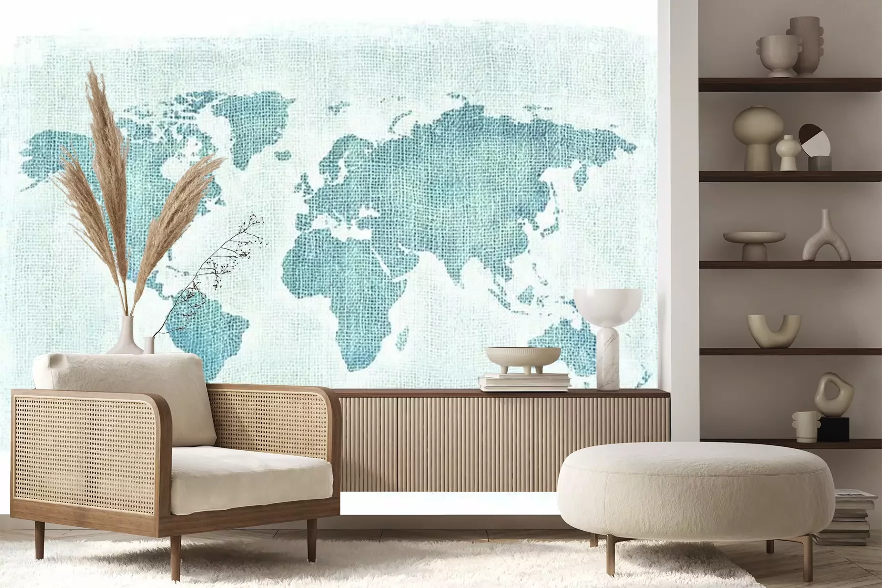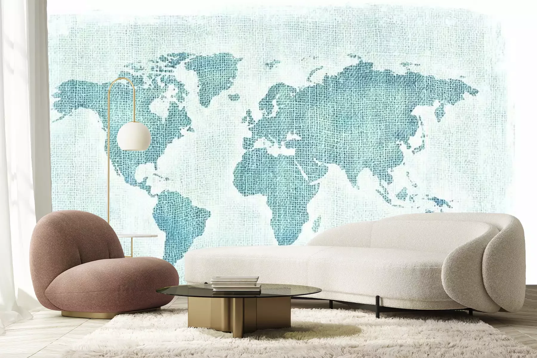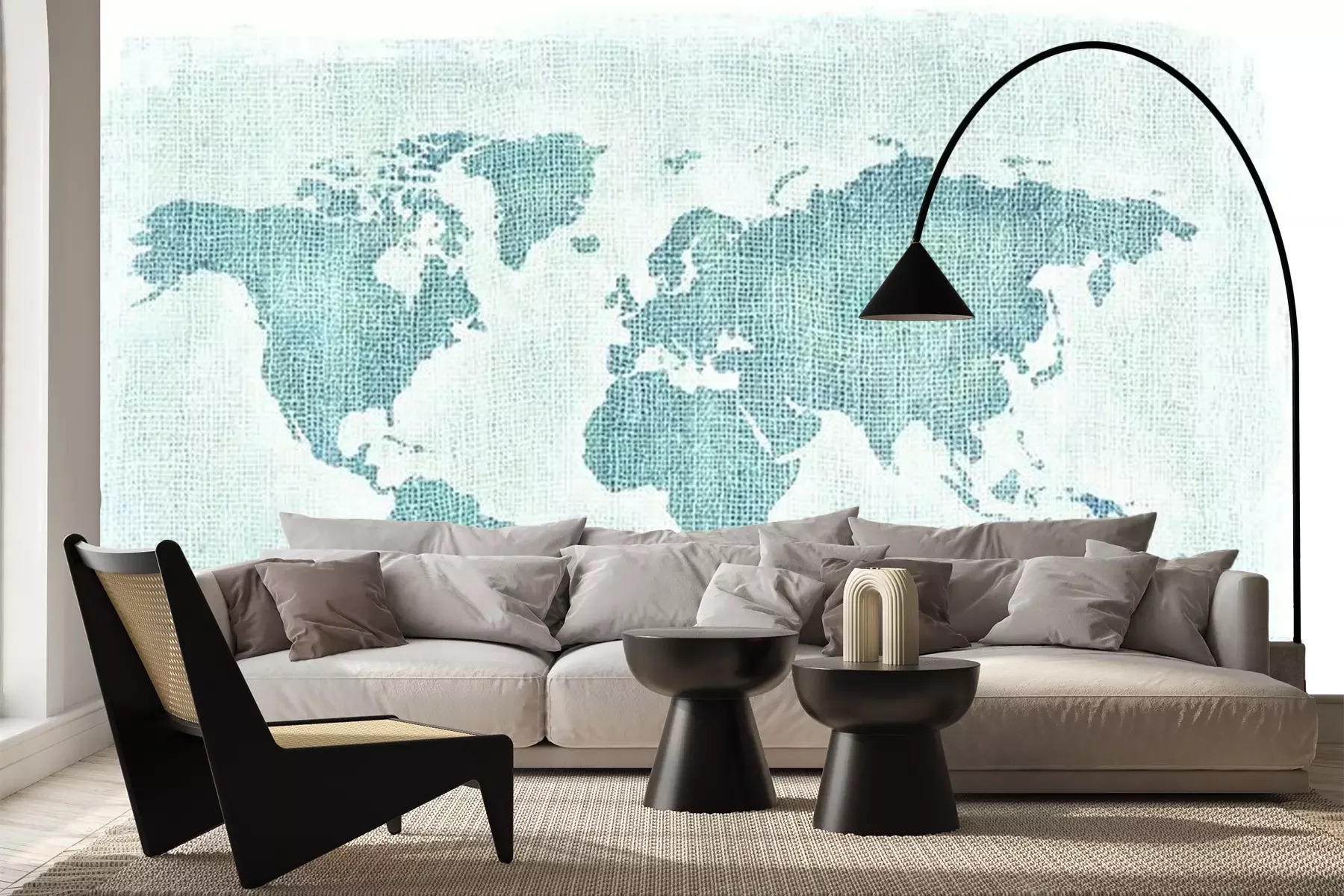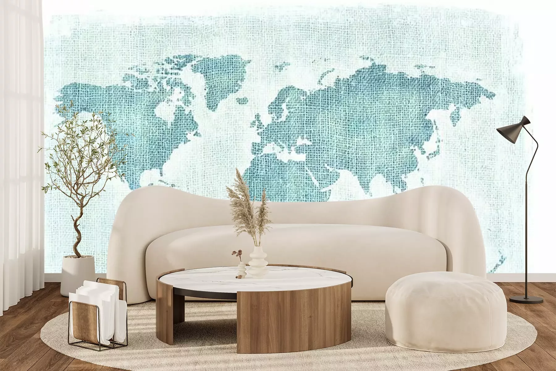 Fotobehang Geweven illustratie van kaart van de wereld met de achtergrond van het jutelinnen. Witte randen. Vintage stijl met gebeitste randen.