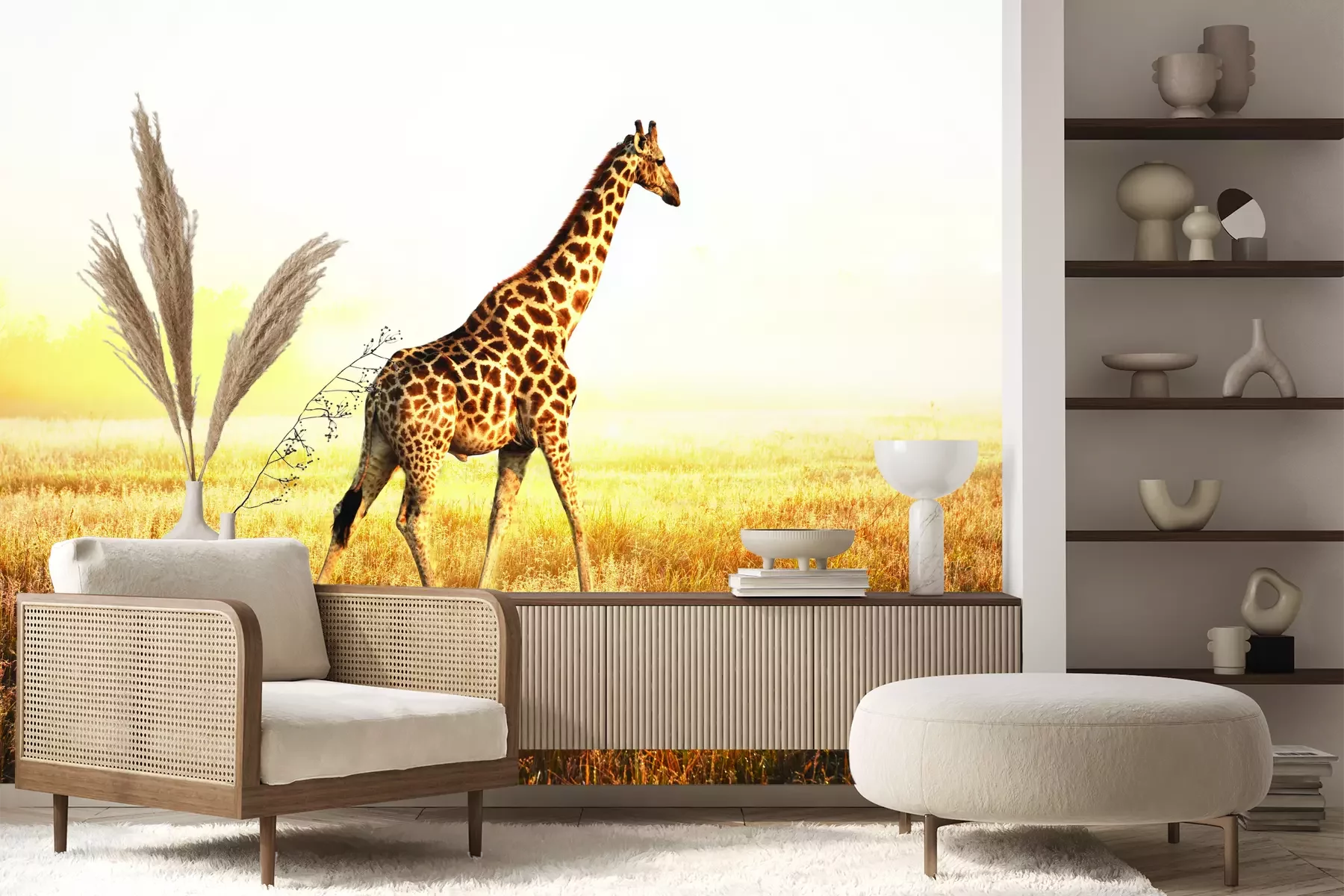 Het materiaal Premium+ is een gestructureerd vinyl op vlies met een gewicht van 255 g/m², dat kleine oneffenheden in de muur effectief camoufleert. De subtiele structuur van fijn zand geeft het oppervlak een exclusieve uitstraling, terwijl de halfmatte afwerking de diepte van de kleuren benadrukt. Het materiaal is dampdoorlatend, waardoor het ook in de keuken en badkamer kan worden gebruikt. De maximale breedte van één baan bedraagt 100 cm – bij grotere afmetingen wordt het fotobehang in meerdere gelijke banen verdeeld. De lijm wordt direct op de muur aangebracht en het behang wordt rand-aan-rand geplakt, wat zorgt voor een esthetisch resultaat zonder zichtbare naden. Het oppervlak kan gemakkelijk worden schoongemaakt door het voorzichtig af te nemen met een vochtige doek.