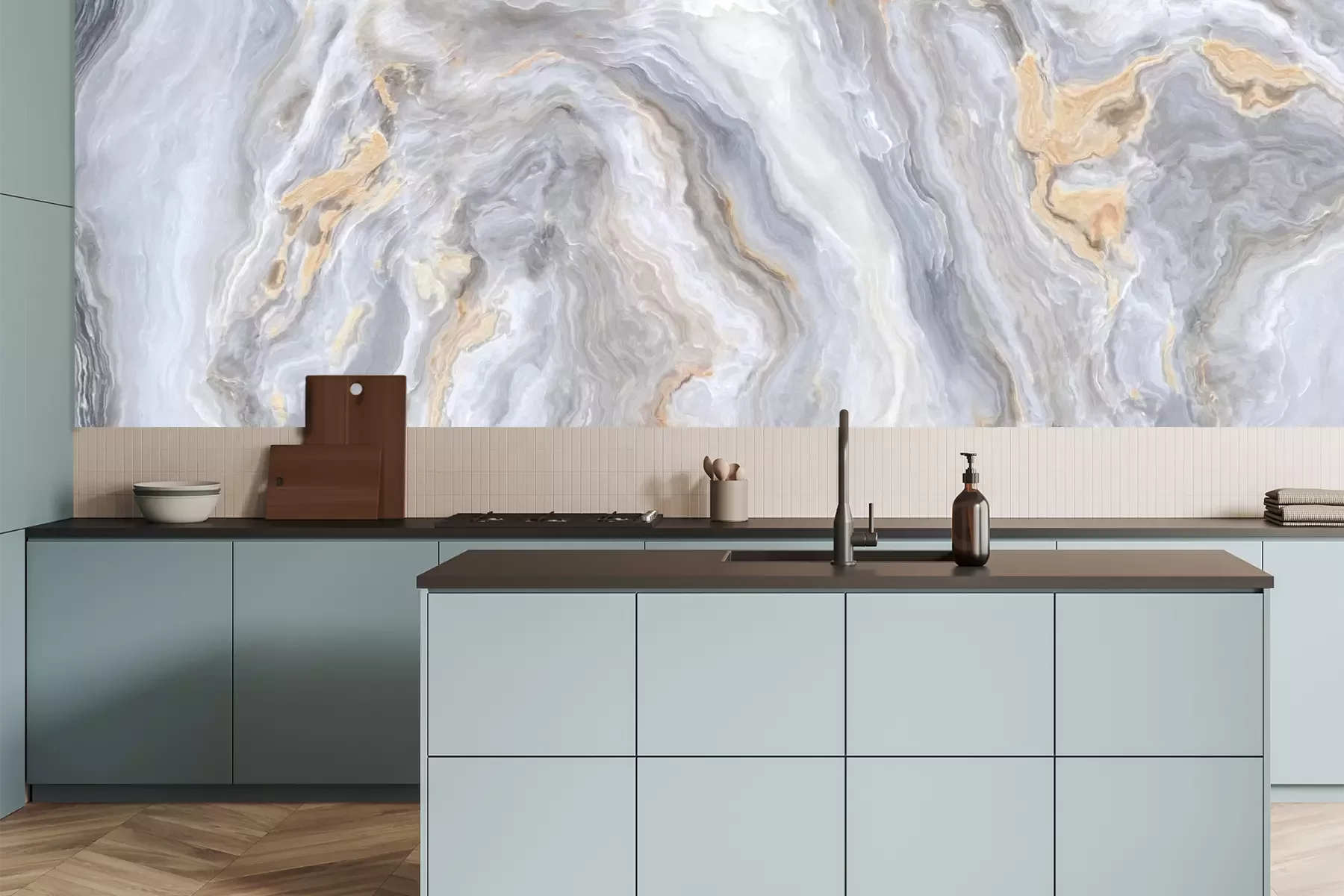 Het materiaal Premium is een glad vinyl op vlies, dat bestand is tegen uitrekken en vervorming. Het is dampdoorlatend – de muren kunnen vrij ademen – waardoor het geschikt is voor gebruik in de keuken en badkamer. Bij vervuiling kan het materiaal worden afgenomen met een vochtige doek. De maximale breedte van één baan bedraagt 95 of 105 cm, afhankelijk van de beschikbaarheid. Montage vindt plaats met de rand-aan-rand methode, wat een esthetisch resultaat zonder zichtbare naden oplevert. Omdat de lijm rechtstreeks op de muur wordt aangebracht, verloopt de installatie van het fotobehang snel en eenvoudig.