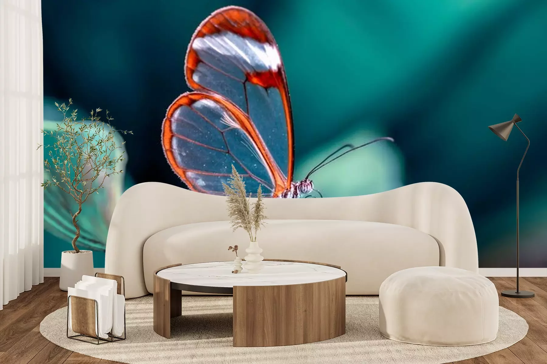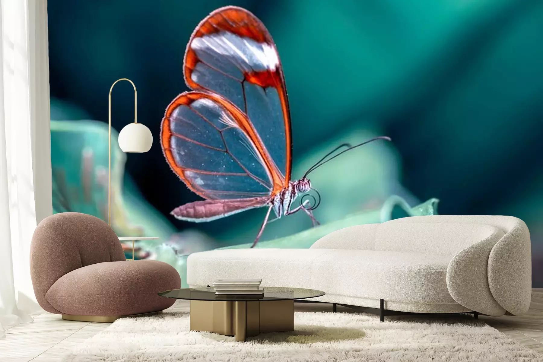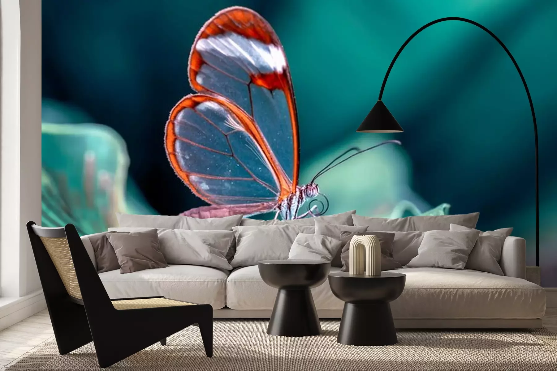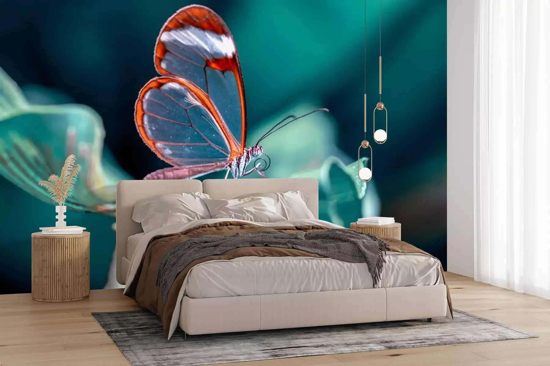 Fotobehang Glasvleugelvlinder zit op een groene plant