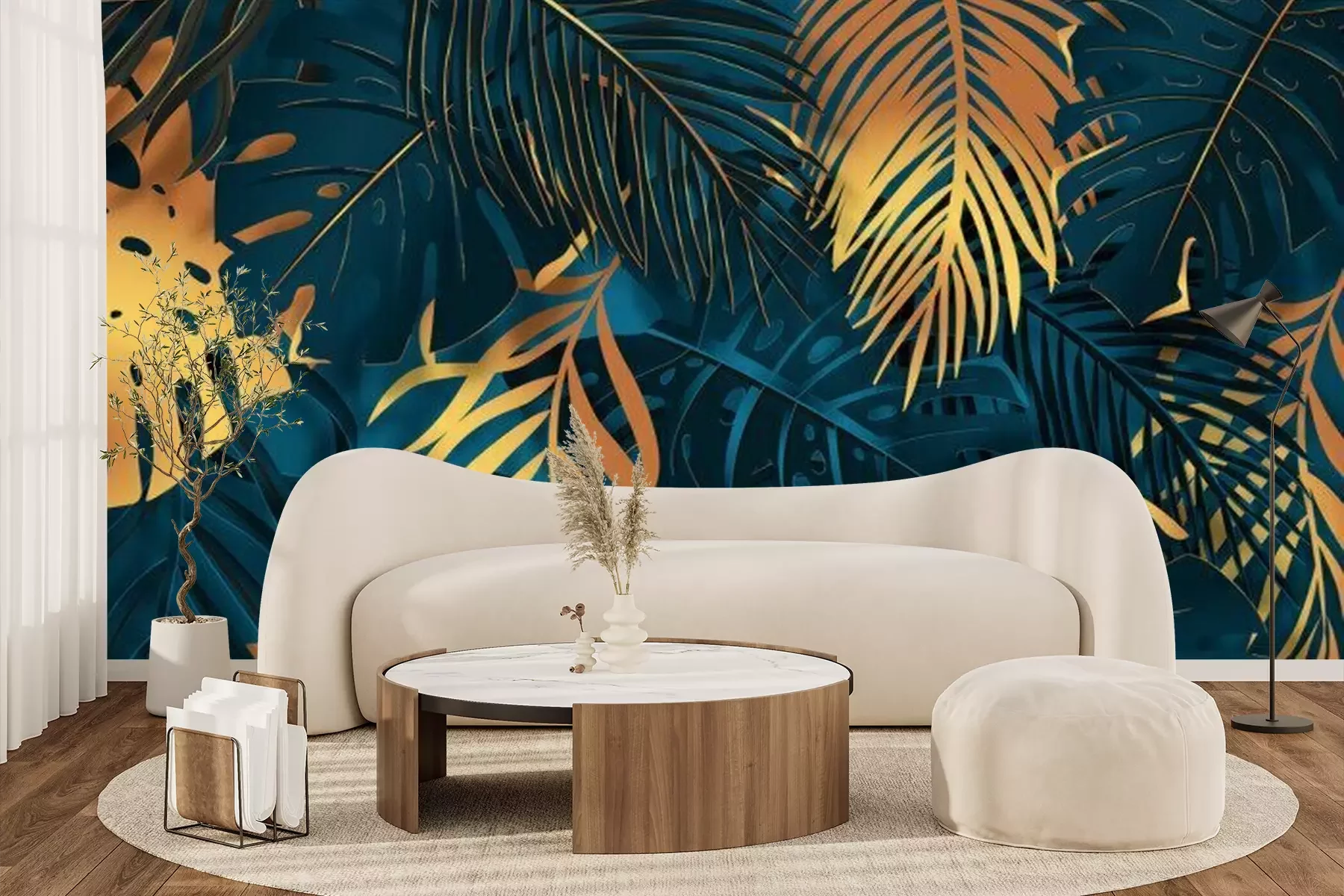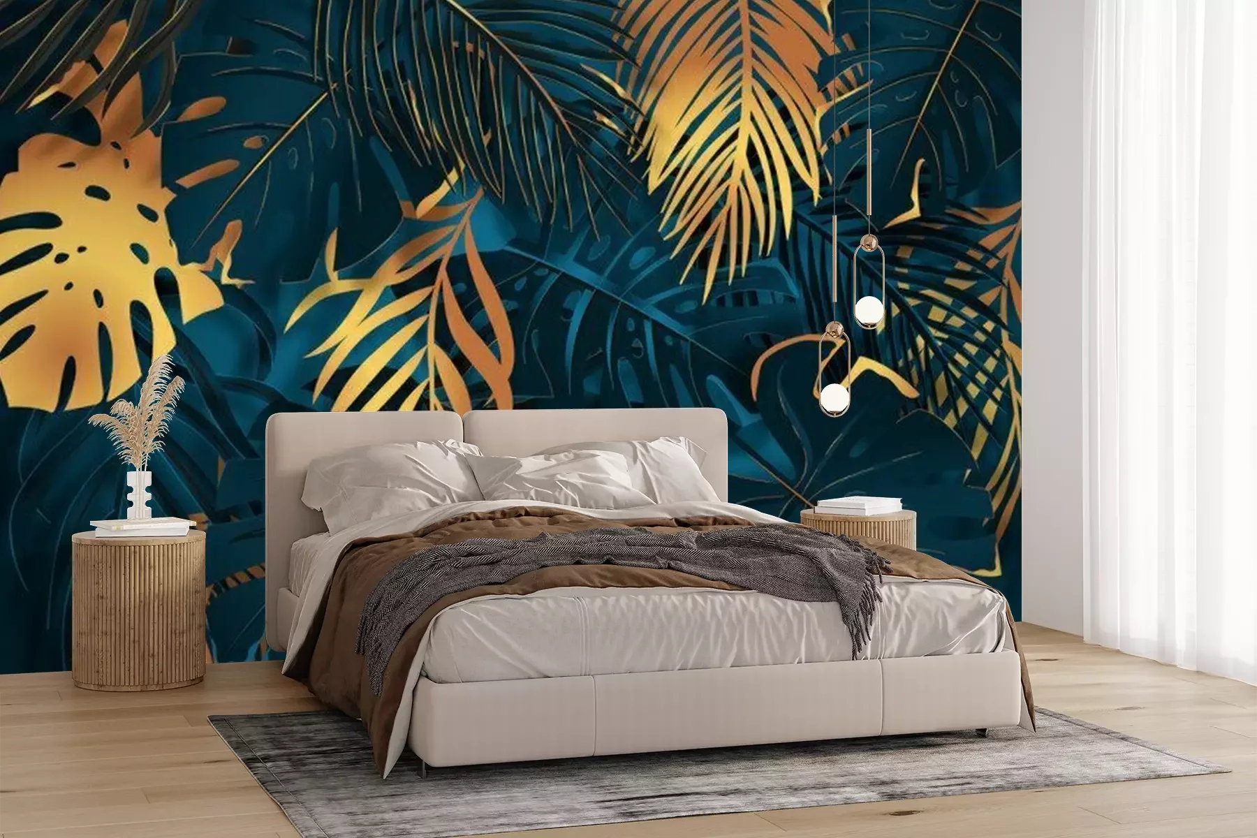 Fotobehang Gold and dark vector turquoise tropical leaves on dark background. Exotic botanical background design for luxury brands.