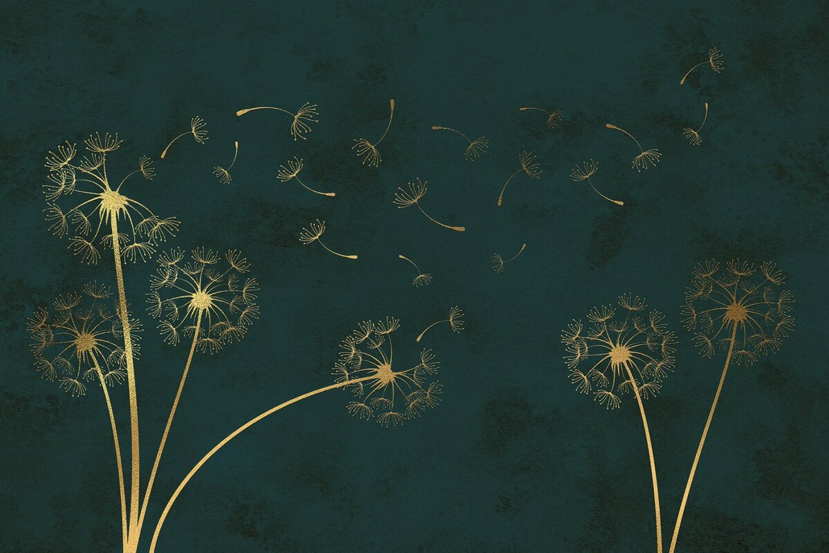 Fotobehang: Gouden paardenbloemen op donkergroen